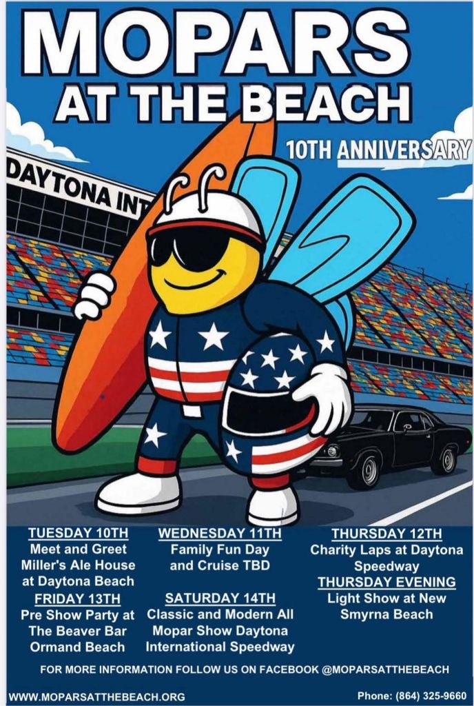 March 10th - 14th 2026 Mopars at the Beach Canal Street, New Smyrna Beach, FL For more details, visit theĀ official website or contact us at info@moparsatthebeach.org or (864-325-9660)
