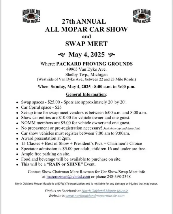 The North Oakland Mopar Muscle club will host the 27th Annual All Mopar Car Show and Swap Meet at the Packard Proving Grounds. The event will take place on May 4, 2025, from 8:00 AM to 3:00 PM. Enthusiasts can explore various Mopar vehicles, enjoy a swap meet, and participate in the Car Corral. Swap […]