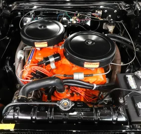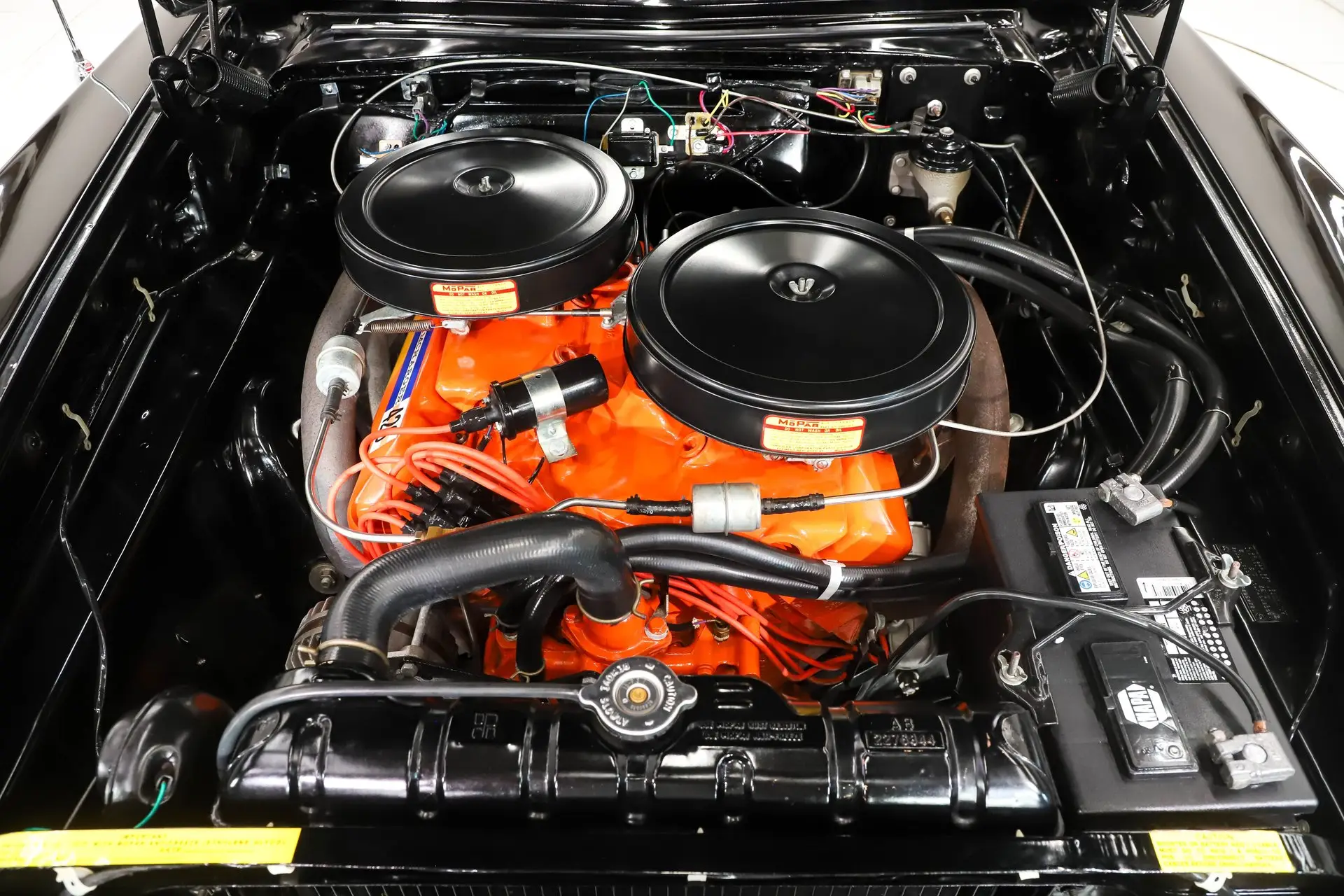 ENGINE COMPARTMENT: This is what makes this car so special: Not only is it the Ram Charger high performance motor, it's the Ram Charger ultra-high performance motor! Correct date coded H.C. block, heads, intake, carbs, and distributor. It comes from the factory with 13.25:1 compression and of course the dual quads. The radiator, pulleys, wiring, exhaust manifolds, choke cable, brake line and brackets are all original Max Wedge parts. There are unique changes in the motor compartment from the factory to fit this beastly motor. The bracing was cut out of the hood, brake line was rerouted, voltage regulator and starter relay were relocated, passenger fender had holes drilled for wiring clips and it had a choke cable going through the firewall. The engine bay is clean metal painted slick black and the fender tag is still attached. It is very nicely detailed.