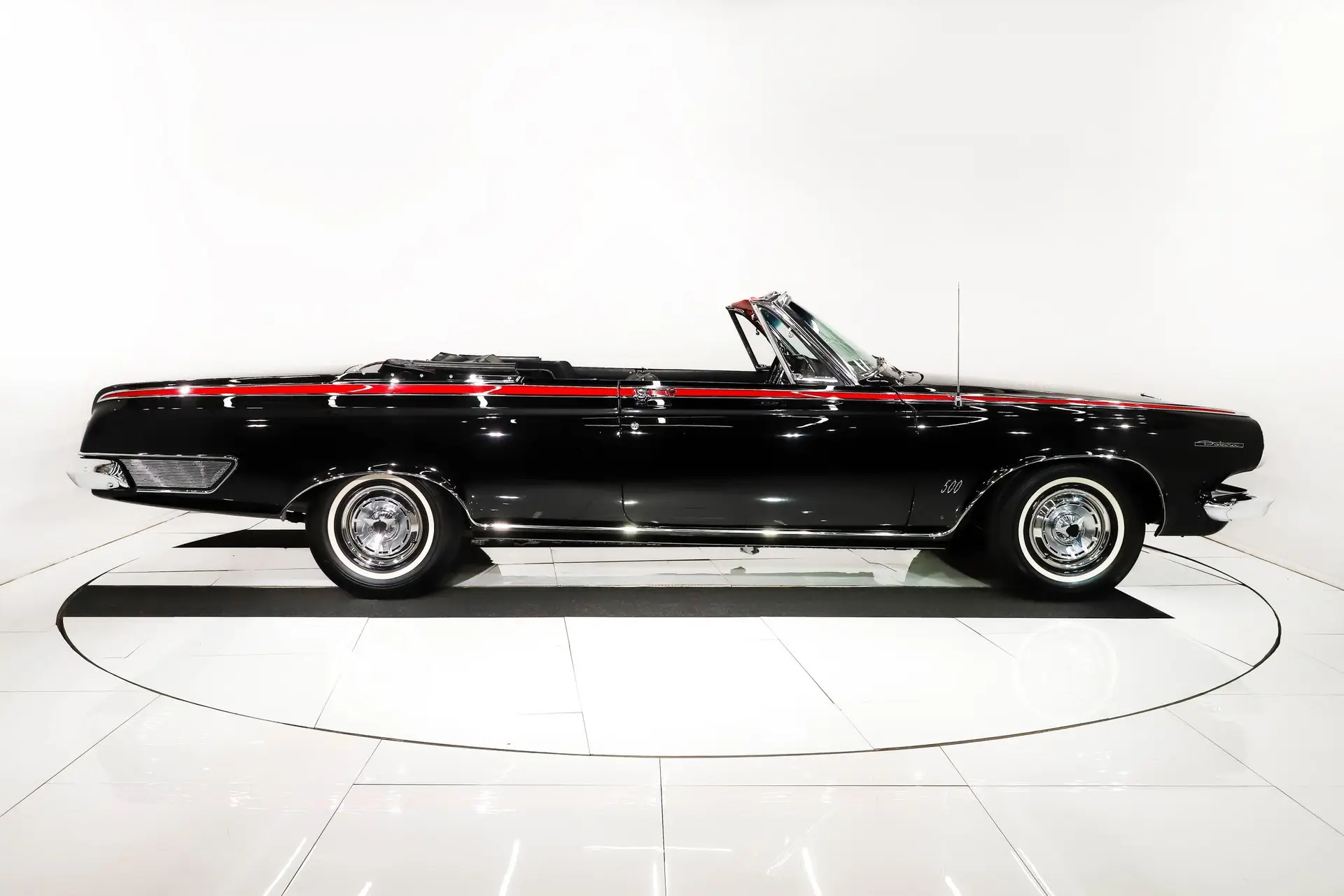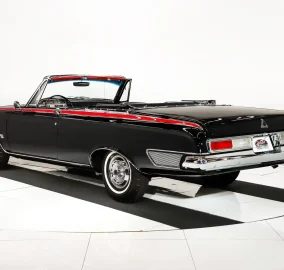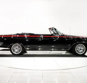 EXTERIOR: It lived in California and had only minimal rust. Unlike many of the hardtops used for racing, it has never been tubbed, caged or wrecked. Restored 18 years ago and the body is still showing like new. No rust or damage, it is straight and fits right. Repainted it's original Onyx Black and it is polished like a mirror. The red painted band running down each side adds some pop. All the chrome and trim is straight and shiny. All the weatherstrips were replaced, glass is very nice, and the power convertible top is like new. It still rolls on original spinner hubcaps and reproduction tires.