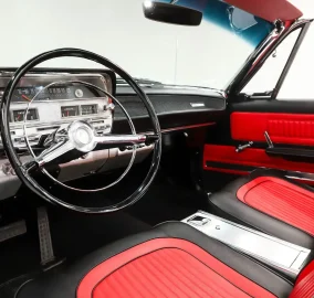 INTERIOR: The red and black looks great and being a 500 it has bucket seats and console. The seats were rebuilt with firm cushions and reproduction upholstery, the rear seat is shaped like bucket seats. It has matching reproduction door panels. The dash and console are original and show very well. Of course, it has the push button automatic and a rare manual choke. Everything looks unabused and fits right. The interior lights work.