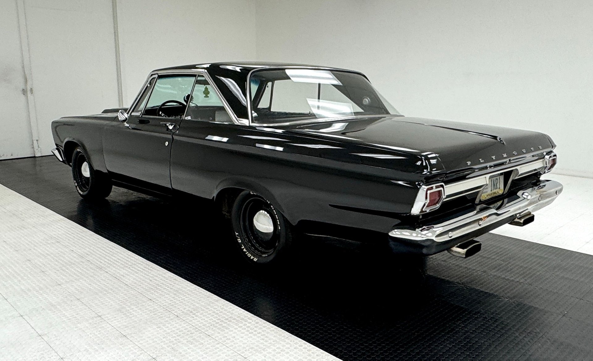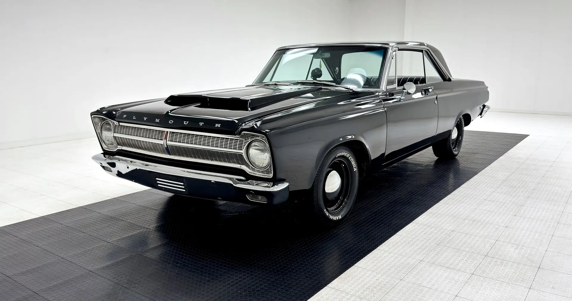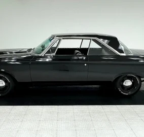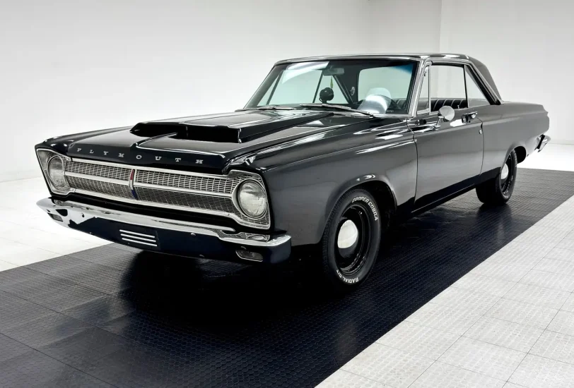 For consignment, a 1965 Plymouth Belvedere II hardtop showing 11,643 miles, but the true miles are unknown. Gone is the pedestrian 318ci V8 and it is now housing a rebuilt 440 under the scooped hood. She's a spectacle in black and rides on police wheels, and there's no crime in that!