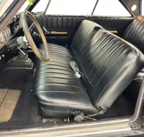 Bold pleats on the insert of the black door panel constitute the only bit of detail on the simple and clean units, each with a fitted wood armrest. The pattern of pleats is repeated on the black vinyl split bench seat which presents in very nice condition and is copied by the rear bench where the wood armrests are also duplicated. Patina dresses the wood rimmed steering wheel with sport chrome spokes while white faced AutoMeter gauges line the faceplate of the instrument cluster, a brushed nickel affair that shows some patina as well. A big Sun tach is perched on top of the dash while an AM radio lives in the middle and a nod to the grille design is represented in the glove box door. A B&M shifter on the floor could use a new boot and the black carpet shows some age. The headliner is in good shape and the trunk has a vinyl mat showing usage.