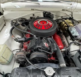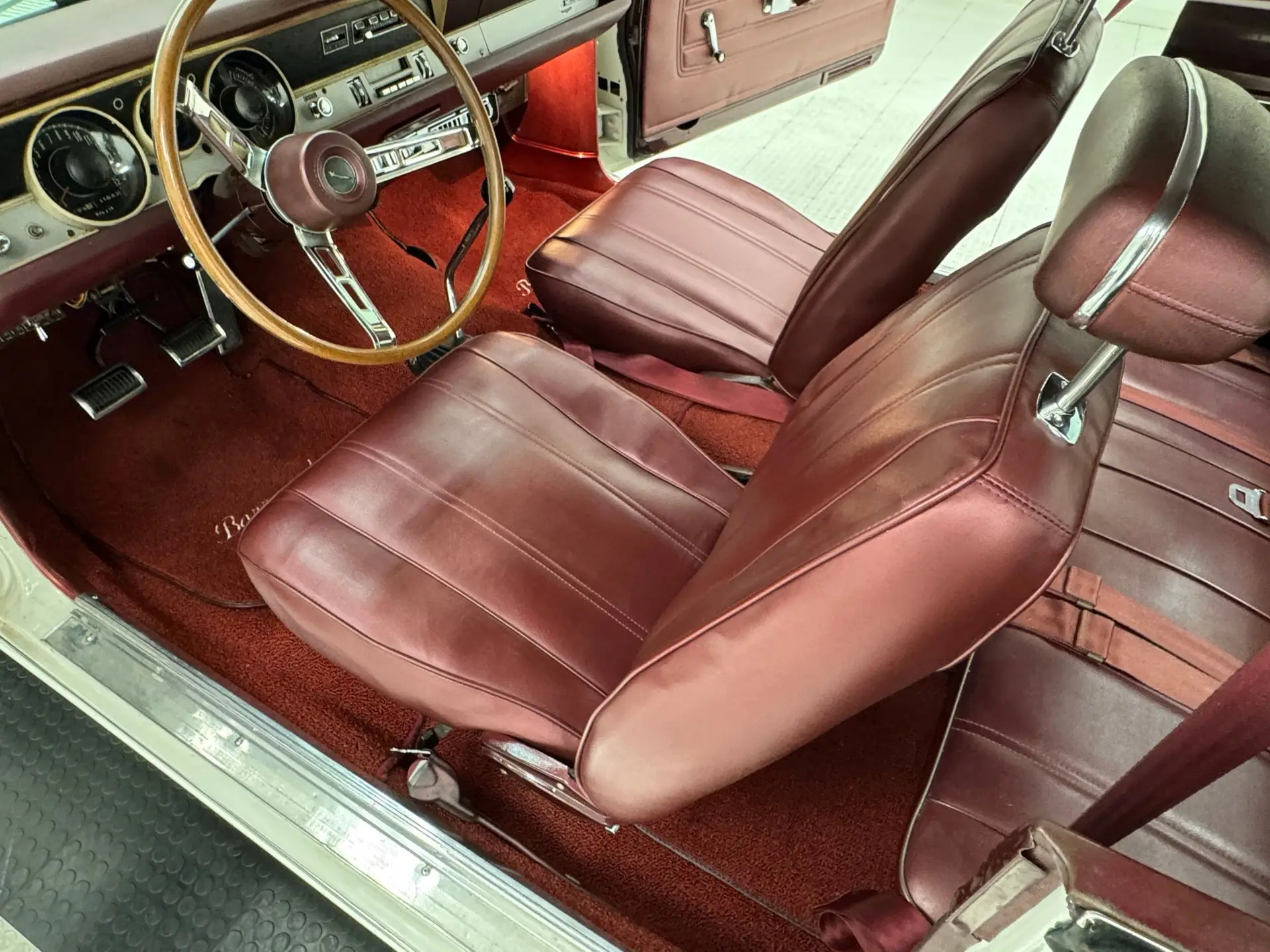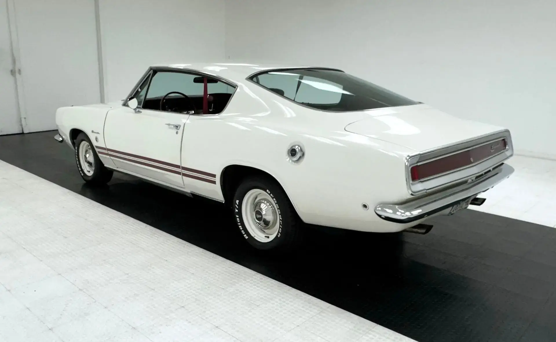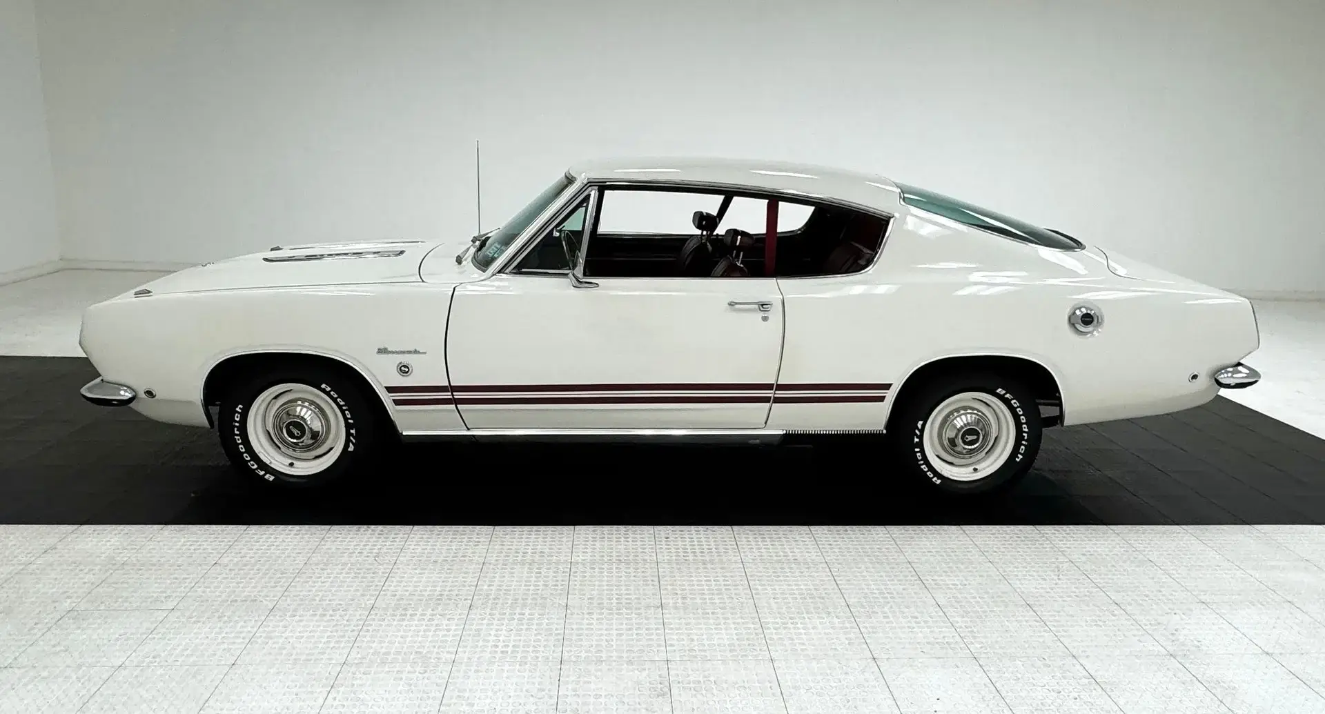 Simple red door cards include a vinyl panel under the dark red metal header and bottom section, contrasting the outer white. Inside, the red vinyl bucket seats look like they left the Hamtramck, Michigan plant yesterday, tall and wearing headrests and the back bench matches the condition. A wood rimmed three spoke steering wheel offers itself to the driver leading to an instrument cluster that shows some age with slight discoloration but benefits from a central tachometer flanked by the 150 mph speedometer and condition gauges. The center dash area contains the A/C panel and AM radio. On the open floor and stunning red loop carpet, you'll find a tall Hurst shifter rising from the transmission tunnel. Barracuda embroidered red carpet mats add a nice touch and help protect the base carpet while the red headliner is high and tight. The trunk floor is clean and protected by a vinyl plaid mat.