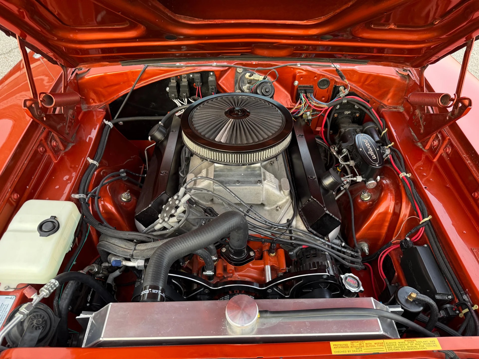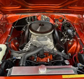 -The engine features Dougs ceramic coated 2ā primary headers, full Holley hyperspark ignition system, 3ā Flowmaster exhaust, CVF billet anodized serpentine front drive belt system, Entropy aluminum radiator with dual electric fans, Milodon high capacity āroad raceā oil pan, polygraphite motor and transmission mounts, Lokar throttle and kick down cables