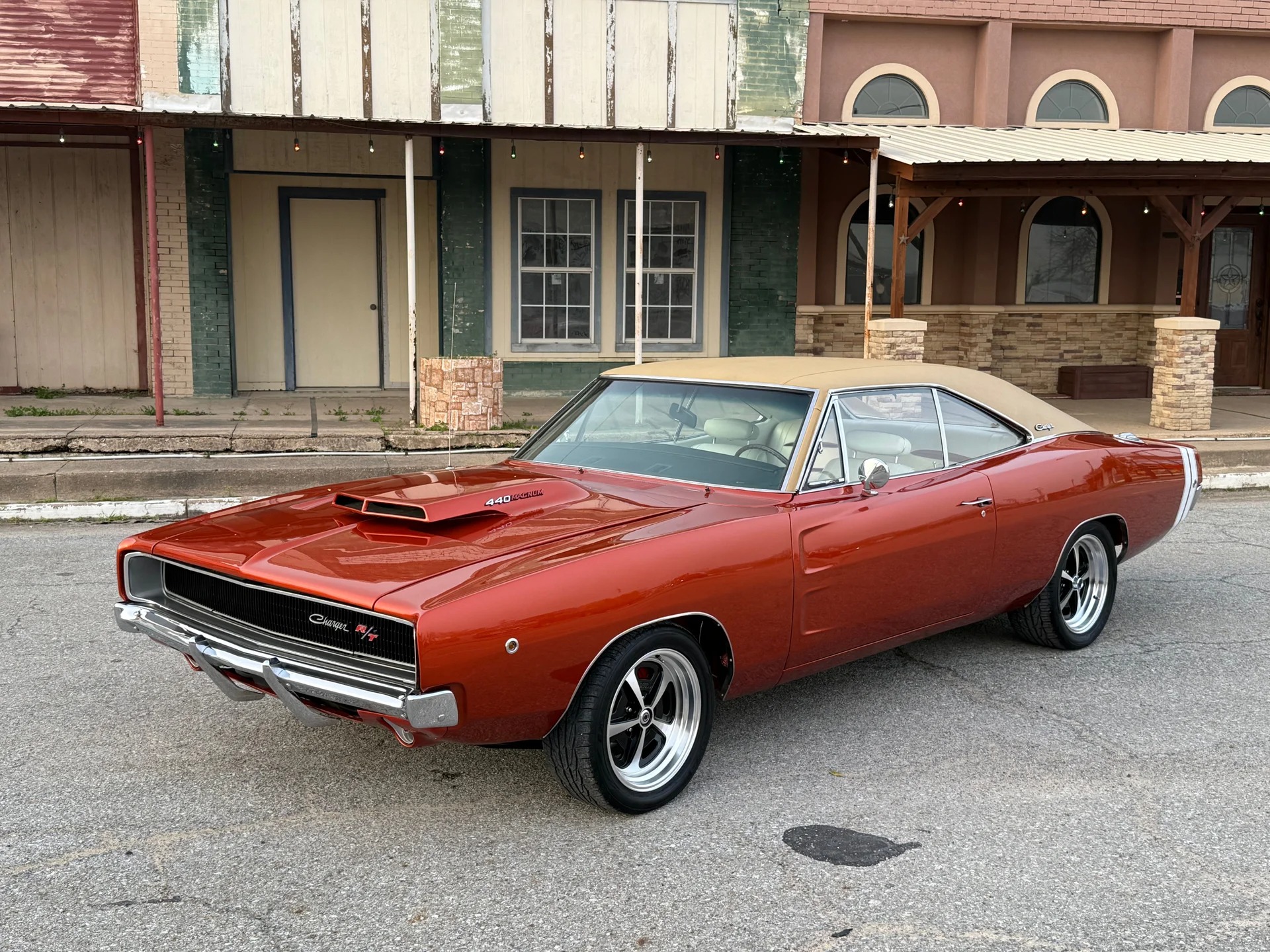 -Fully restored car with beautiful paint in the Dodge color of āGoManGoā, tan vinyl top and white bucket seat interior with pleats that match the paint color - that TA hood scoop? HAND CRAFTED FROM METAL! And is welded to the original hood and is fully functional!