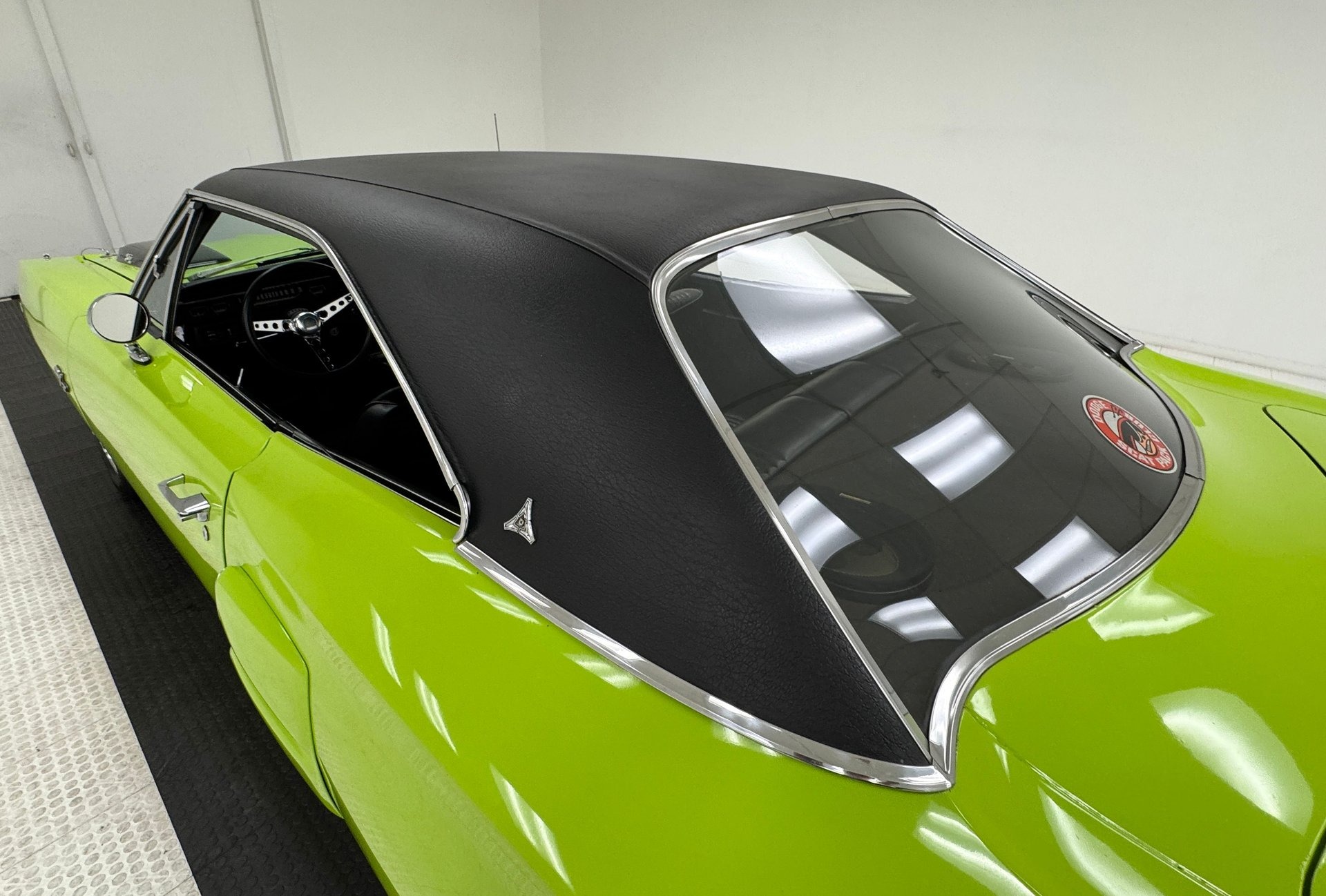 Impossible to ignore, some have called Sublime Green radioactive as it's practically fluorescent in its exposure and without a doubt, the massive contrasting nostrils on the hood jump out like a giant black wave washing over you. They're borrowed from a 1969 RT, as are the side ducts and add about a million points of muscularity. The gloriously flat square face is matched only by the tail that houses ever increasing sized lights that flank the rear trim of symmetrical and vertical bars. Spectacular! The headlights. by the way. shine with green neon when on. Hood pins mean business as do the 15-inch Magnum 500 wheels with staggered size tires. A black vinyl top is in excellent condition and leads to a sloping rear window with an undulating bottom edge blending seamlessly into the long decklid with the raised center detail. The chrome and polished metal is fantastic, but the paint shows some imperfections that include some rust bubbling under the paint low on a fender behind a wheel and along the rocker panel, minor scuffs and scratches on the black stripes down low, bubbling on the rim of wheel openings, bubbling and body repair on the door corners, body filler in the leading edges of the passenger's fender, touched-up chips, and minor panel gap fitment faultiness.