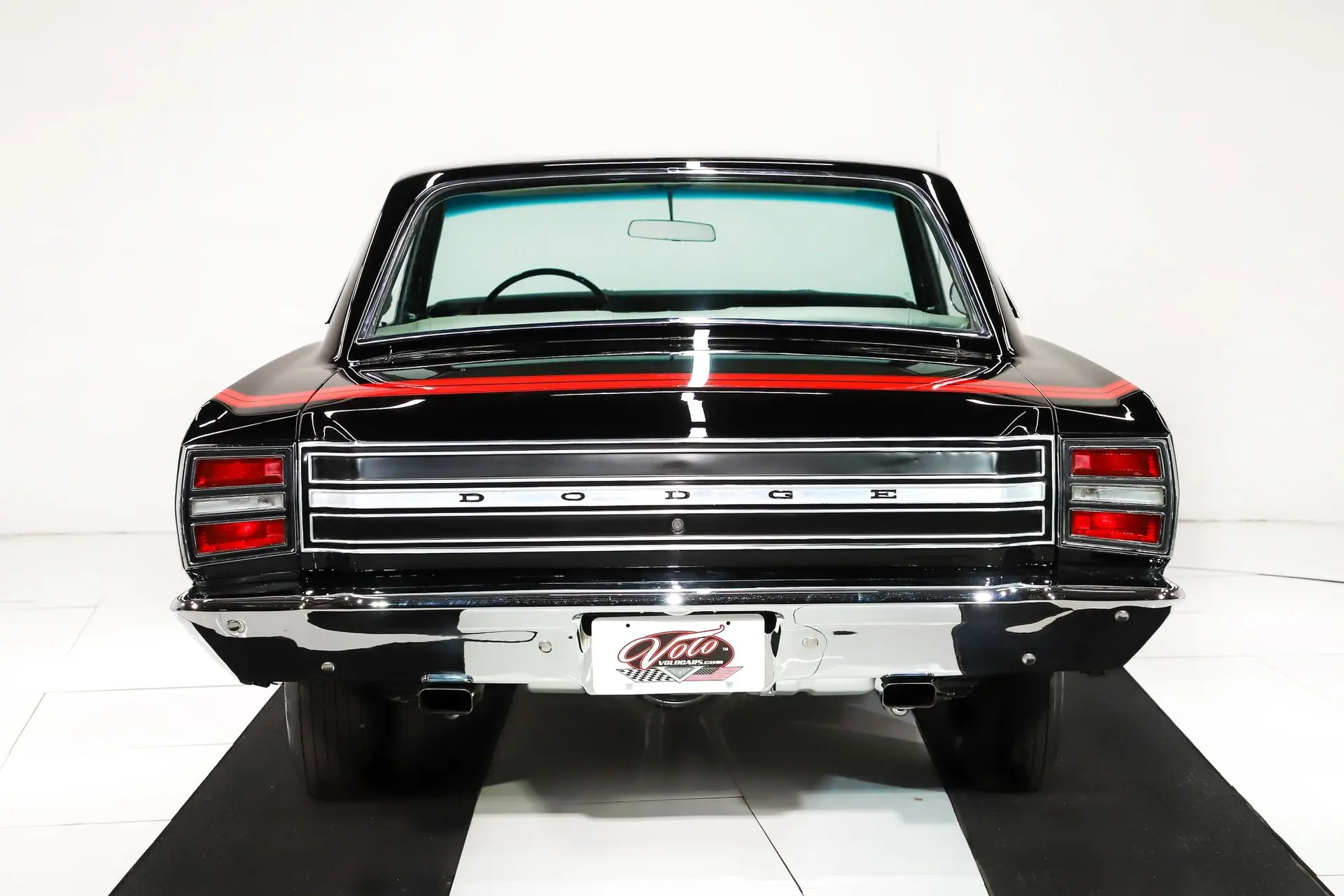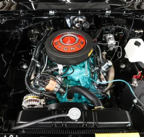 ENGINE COMPARTMENT: A big block 383 stuffed in a little Dart sounds exciting! This engine compartment is completely restored and detailed. The engine bay is pristine metal painted high gloss black. Every single component looks proper, fresh, and detailed. The engine looks stock: the right manifolds, chrome valve cover and a crinkle finish air cleaner with a 383 Magnum pie tin. It even has proper over spray on the negative cable, a reproduction coil and dated spark plug wires. The hoses and clamps are reproduction. The squirters are hooked up, the horns are hooked up, the battery is secured. Dang this is nice!