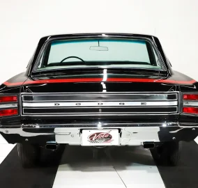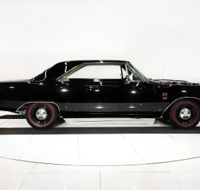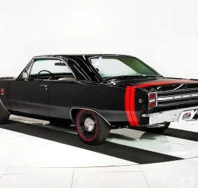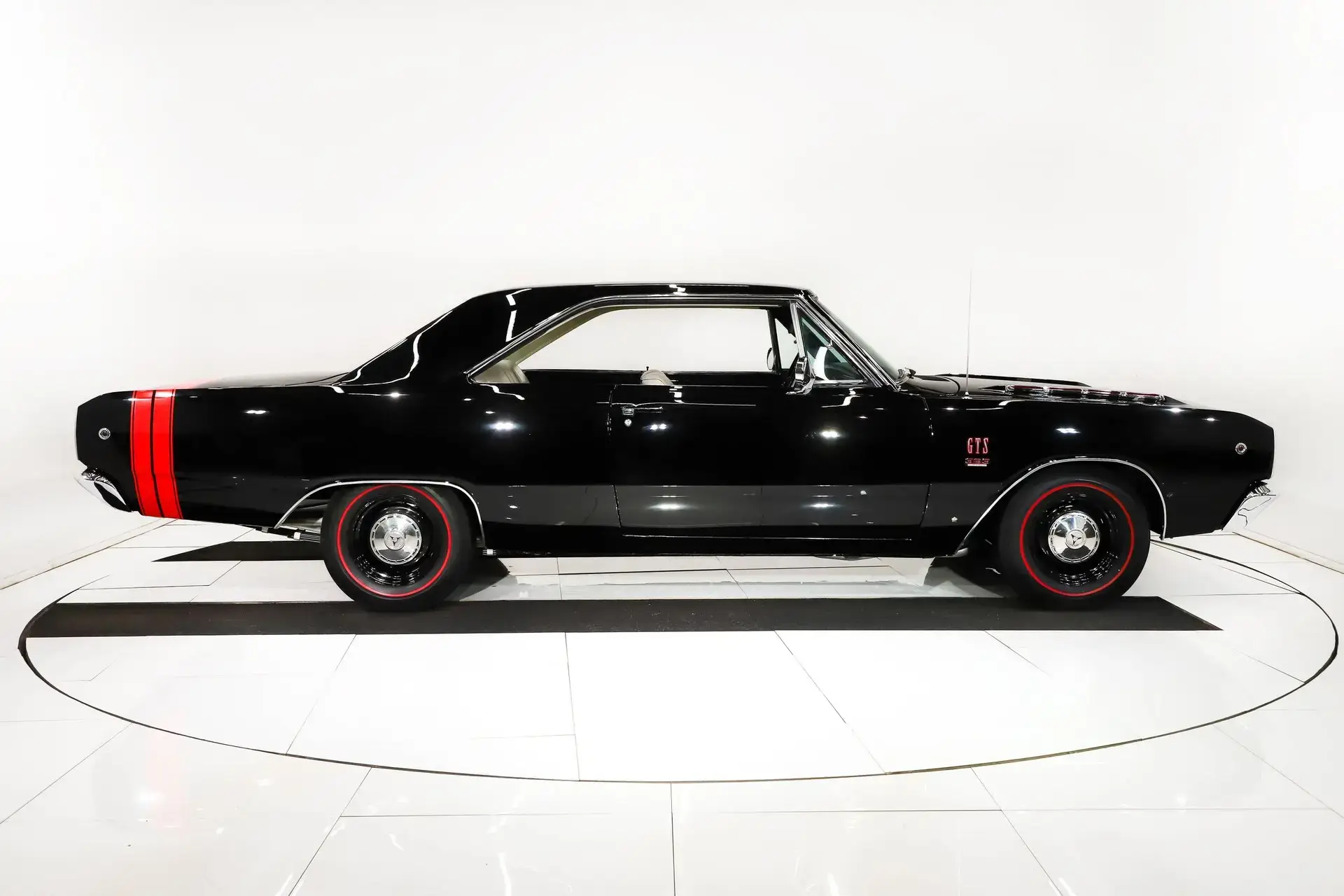 EXTERIOR: Stunning! That beautiful glass finish black paint without a vinyl top and all the nice red accents really looks incredible. You walk up to the car, and it looks like a black mirror. The body is arrow straight and the gaps are really nice. It has the GTS bulged hood with the red accents in the chrome trim, I also love the GTS 383 emblems with red and of course the red bumblebee stripe really puts it over the top. Everyone loves the round marker lights of '68 too. It looks like the chrome has been redone and the stainless trim is very nice. It has dual mirrors and correct antenna. The windshield looks new, weatherstrips have been replaced. It's sitting on a set of reproduction Wide Oval Redline tires with gloss black rims and the poverty hubcaps.