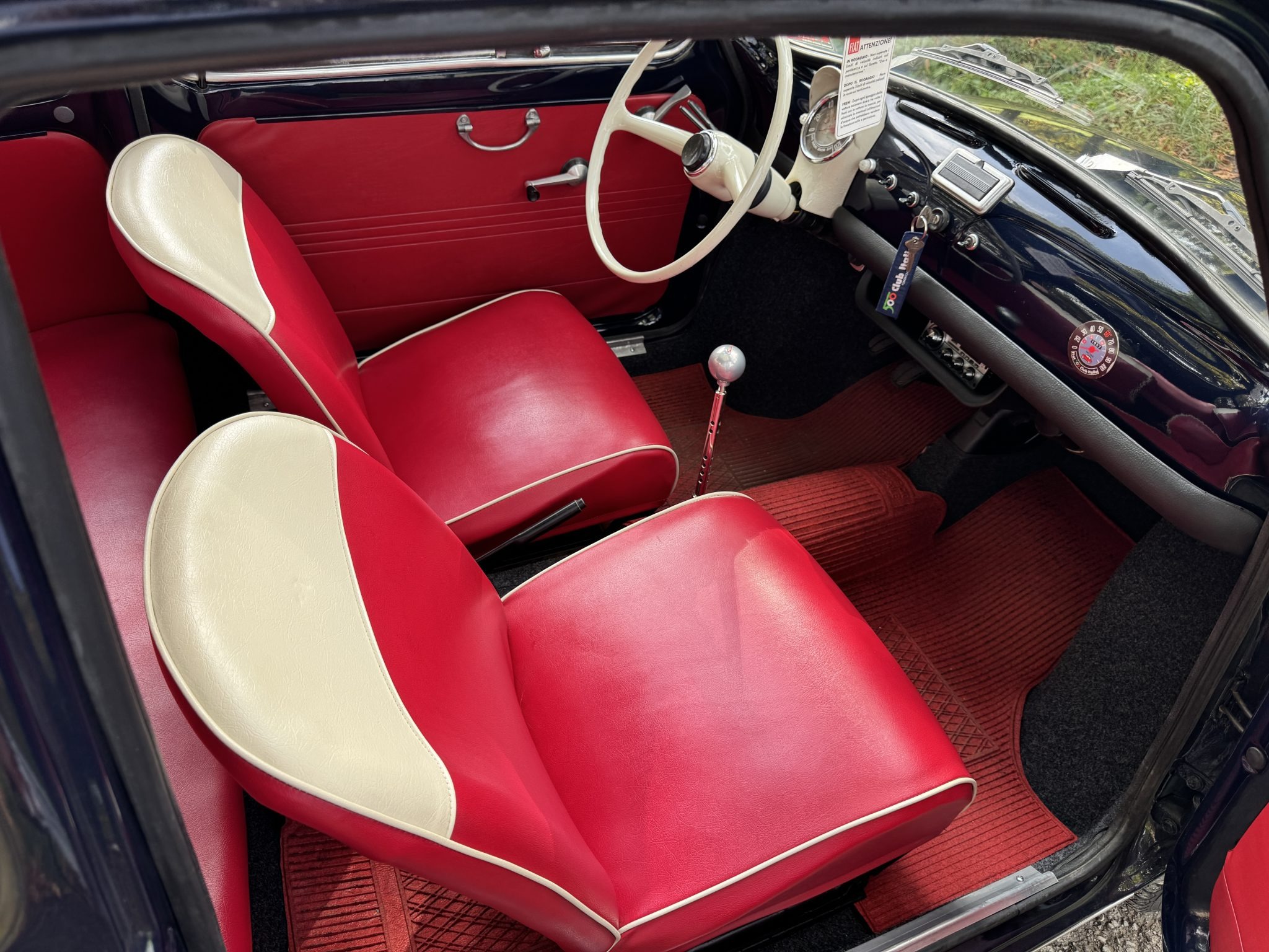 The front bucket seats and the rear bench are upholstered in red vinyl with ivory accents up front, and the door panels are trimmed to match. Interior appointments include a body-color dashboard, an aluminum shift knob, and a radio.