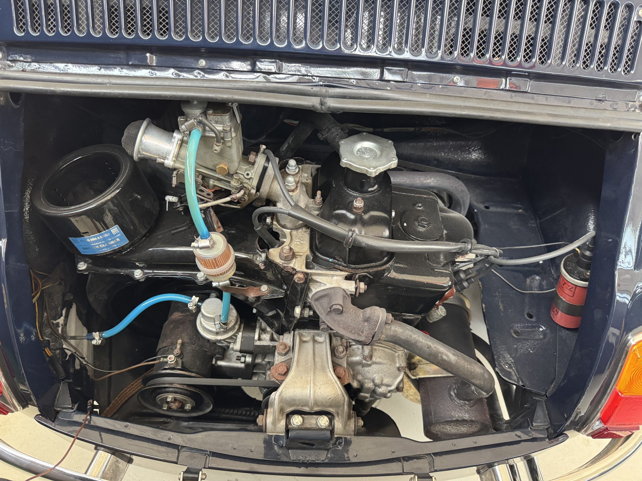 The replacement air-cooled 652cc parallel-twin is said to have been sourced from a Fiat 126 and installed in 2020. It is fed by a Dell’Orto carburetor, and a Giannini oil pan has been fitted.