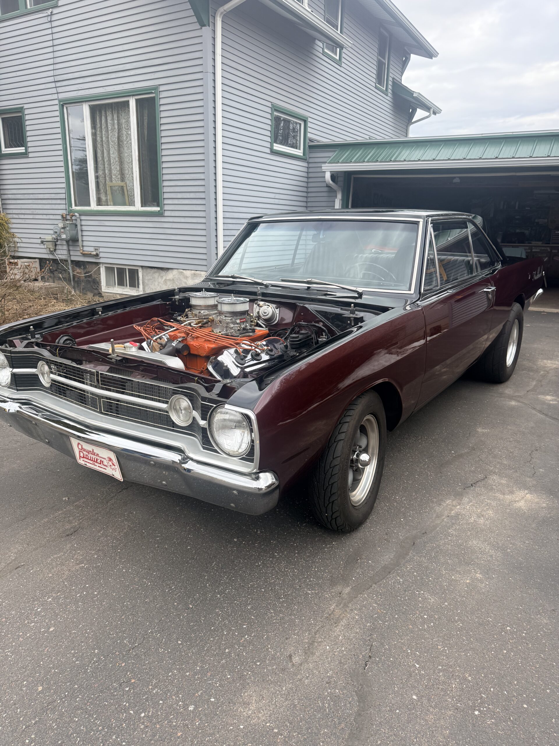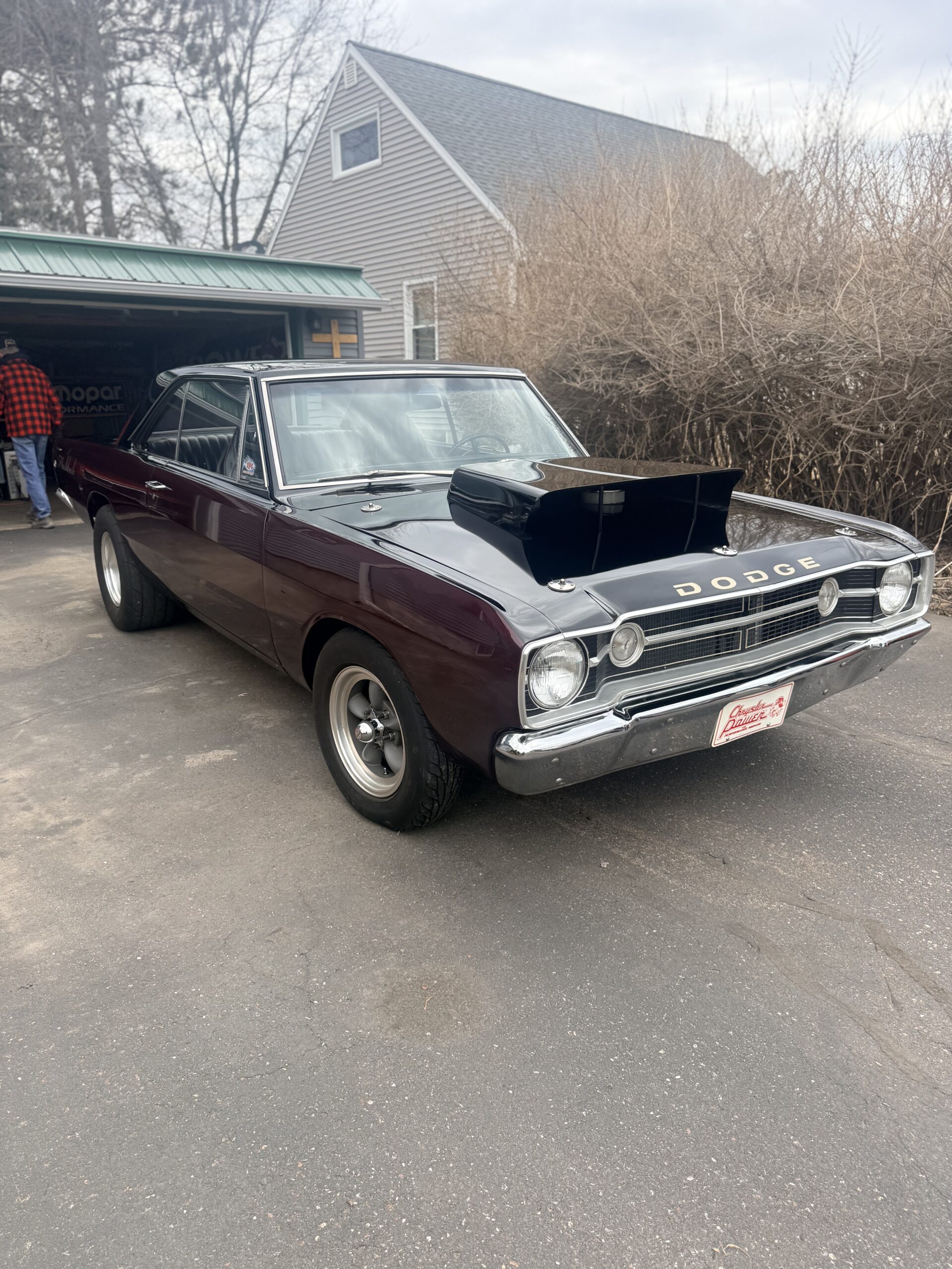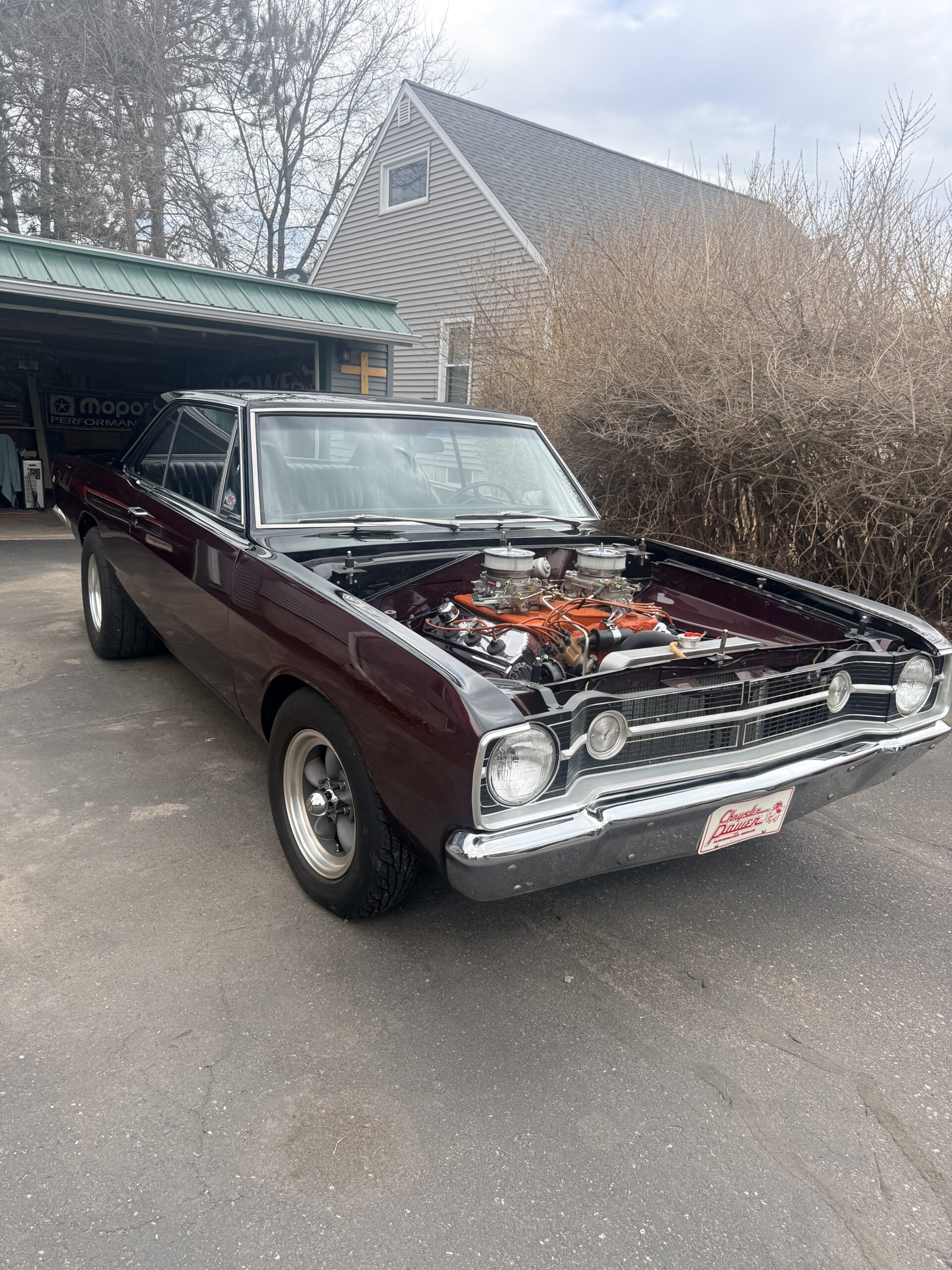 1967 Dart two door hardtop, dressed as a 1968 426 Hemi, stock compression, Diamond racing magnesium cross ram intake with stage 3 porting, two 625 Edelbrock carbs, TTI coated headers, 3 inch exhaust, Bullet cam with .557 lift, 292 duration.