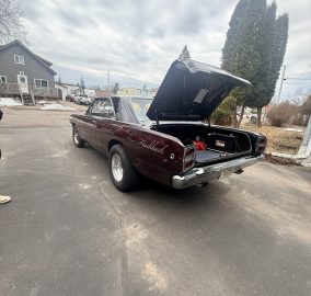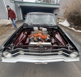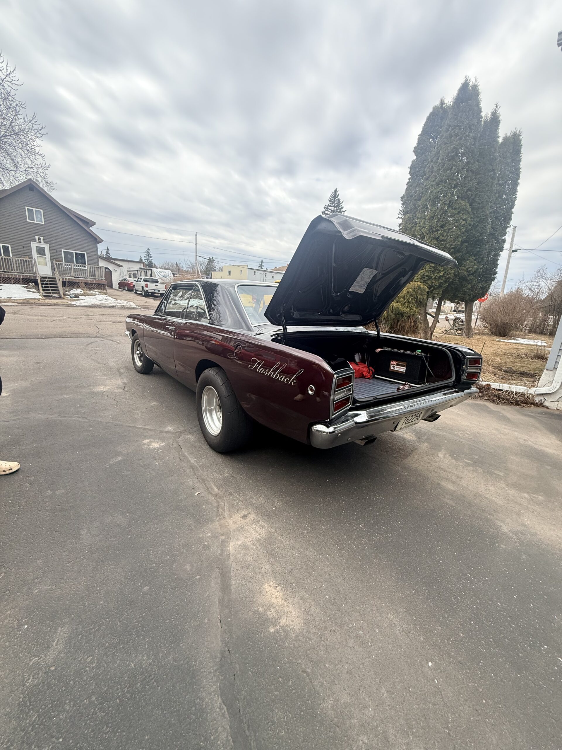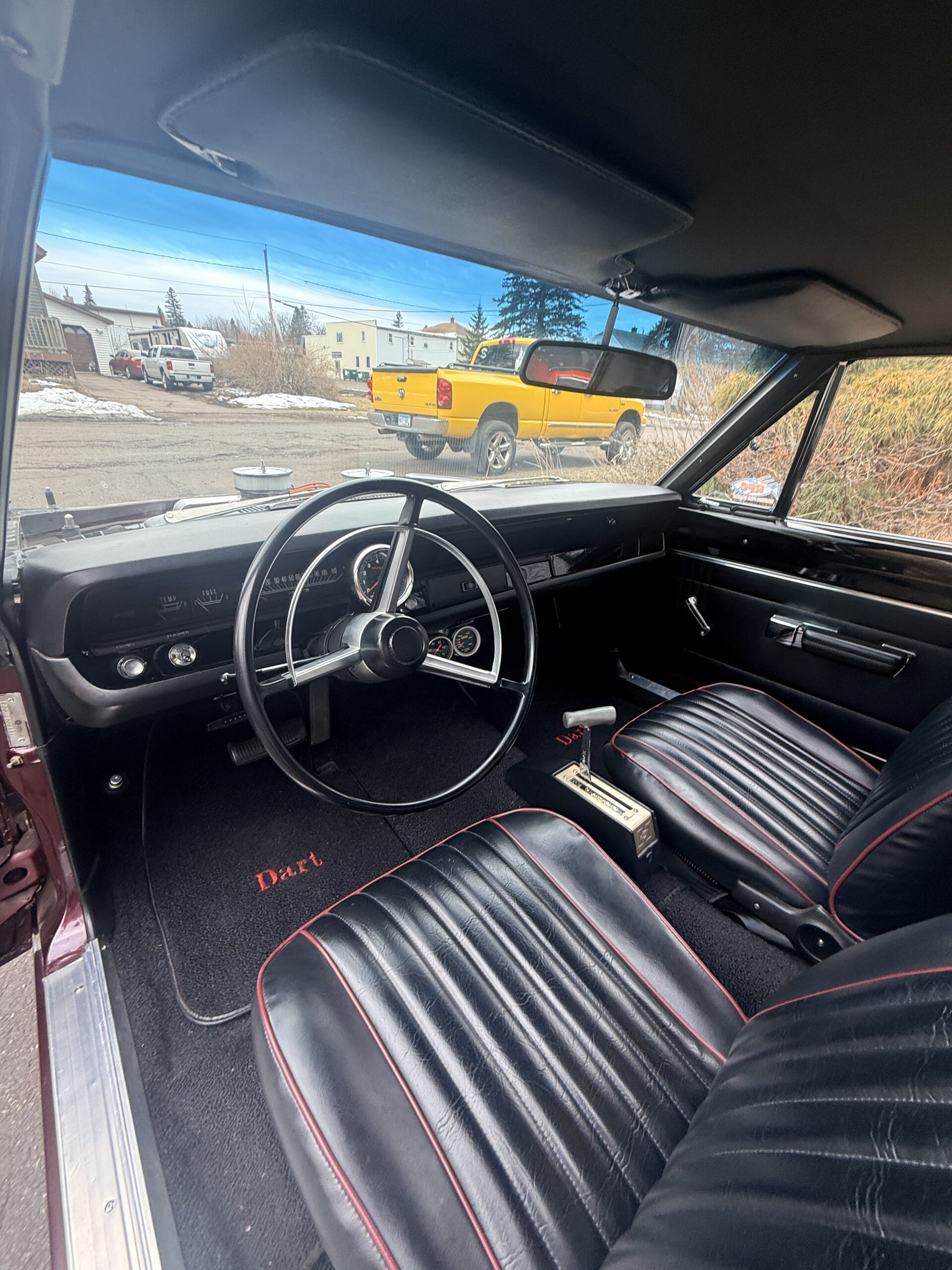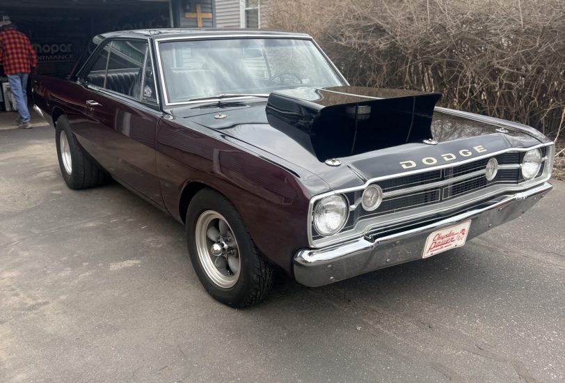 1967 Dart two door hardtop, dressed as a 1968 426 Hemi, stock compression, Diamond racing magnesium cross ram intake with stage 3 porting, two 625 Edelbrock carbs, TTI coated headers, 3 inch exhaust, Bullet cam with .557 lift, 292 duration.