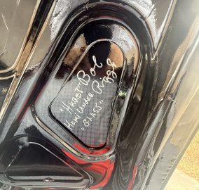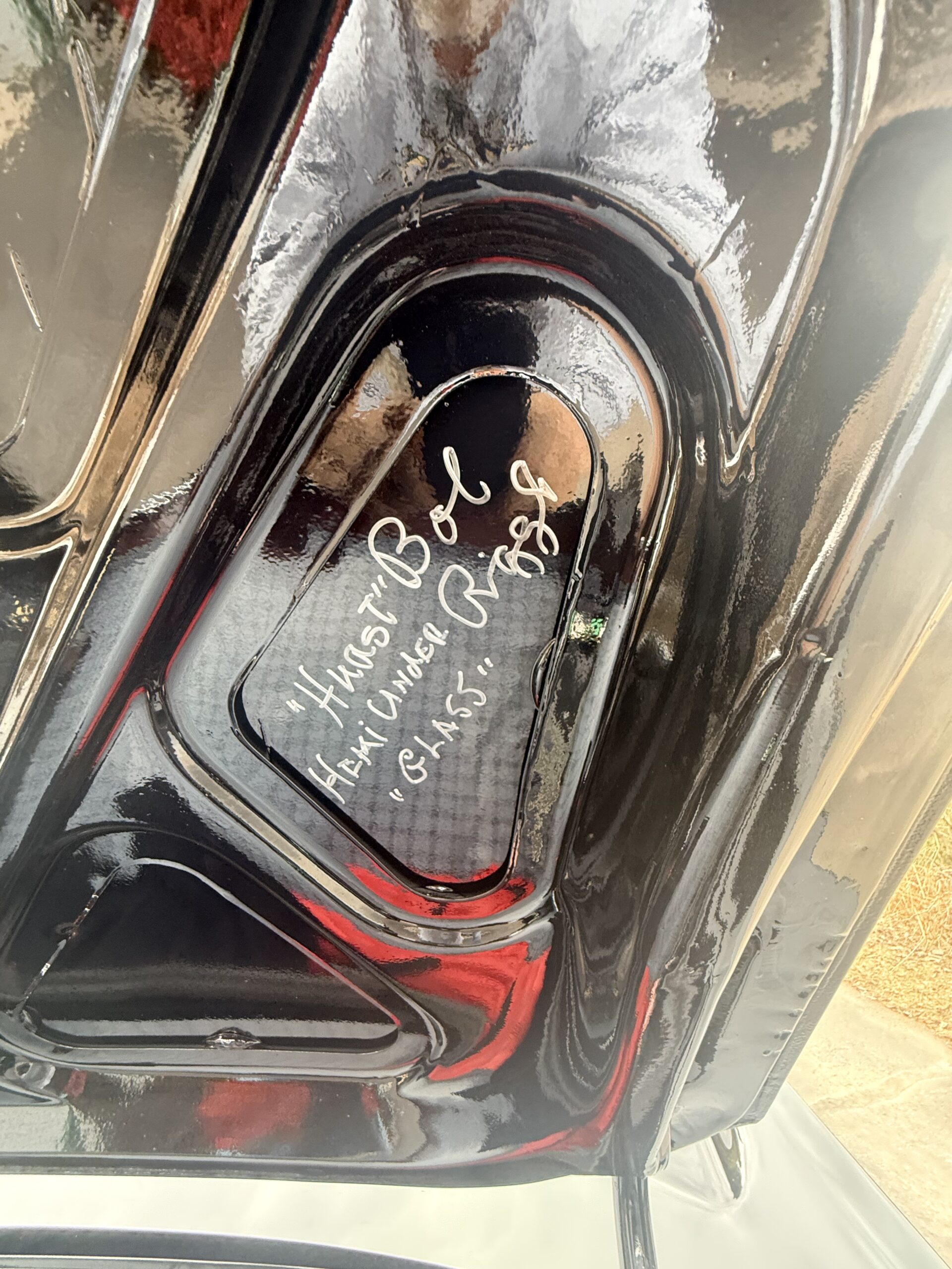 Frames are tied together. Fiberglass hood and fenders. Drive shaft loop. Bob Riggleās autograph is on the inside of the deck lid. He was the driver of the infamous Hemi Under Glass wheel standing Barracuda.