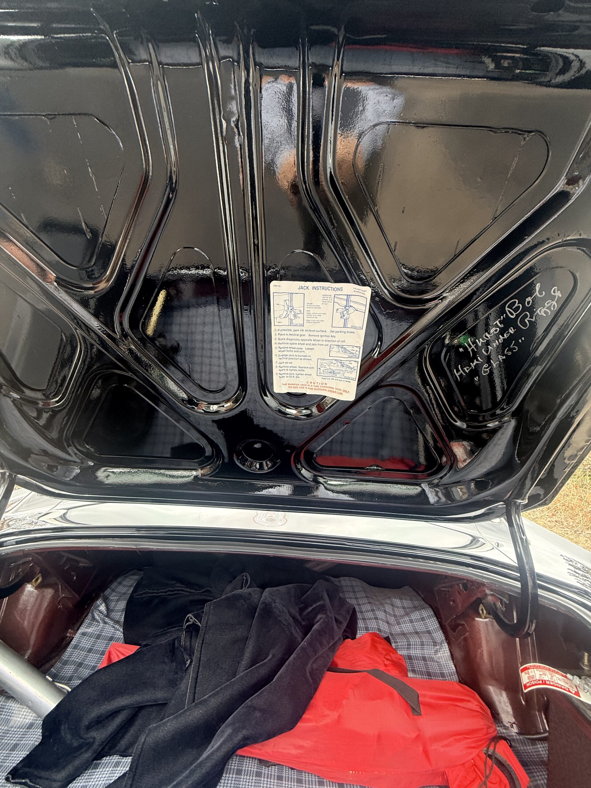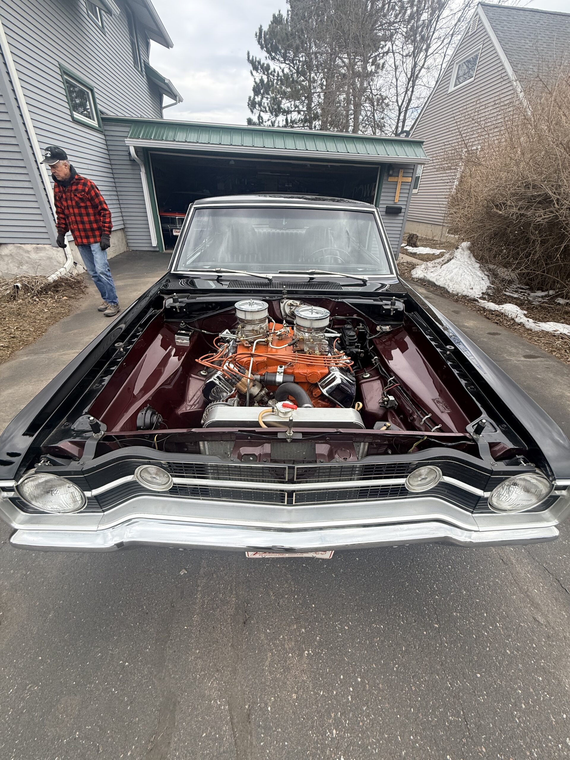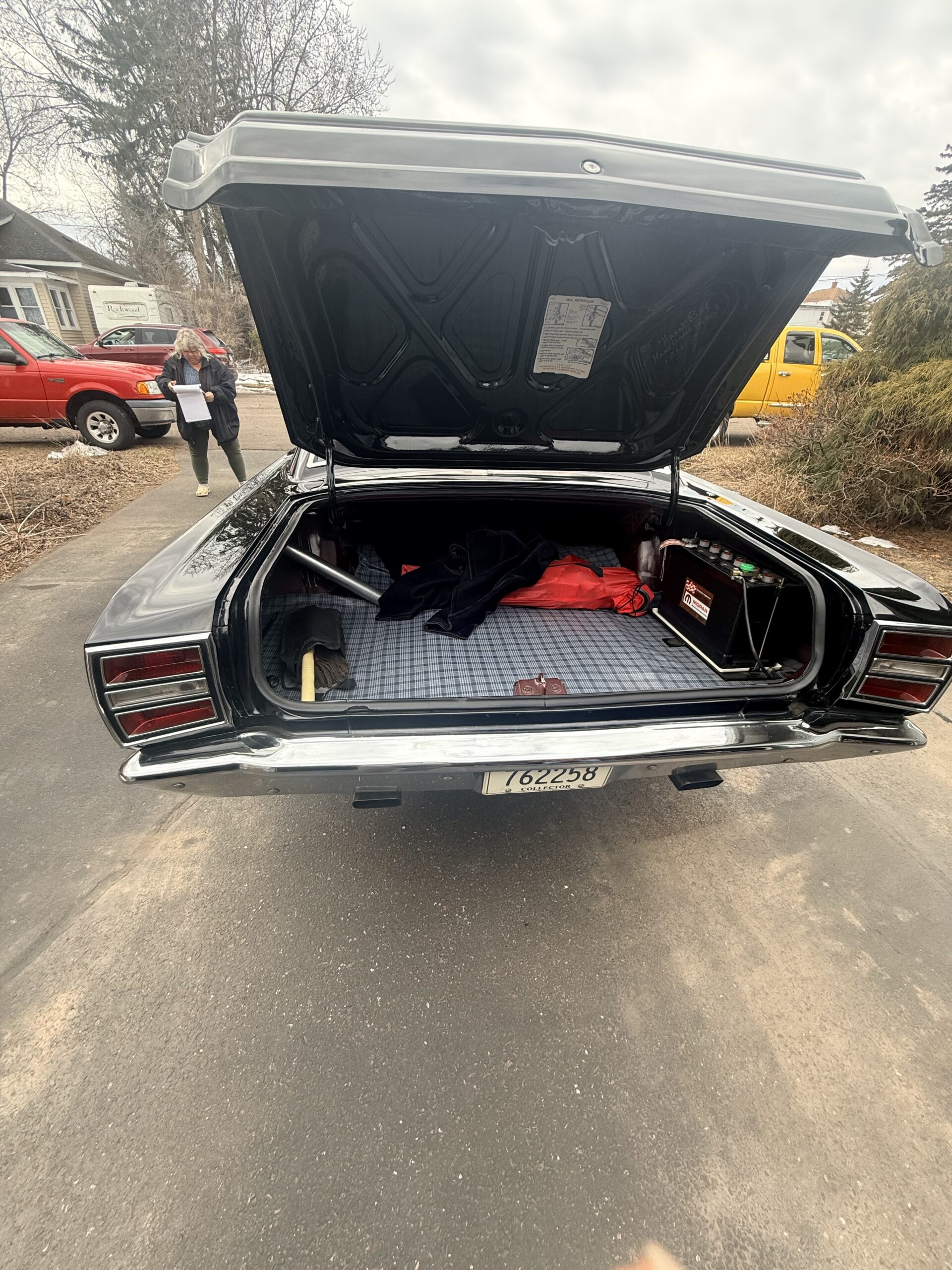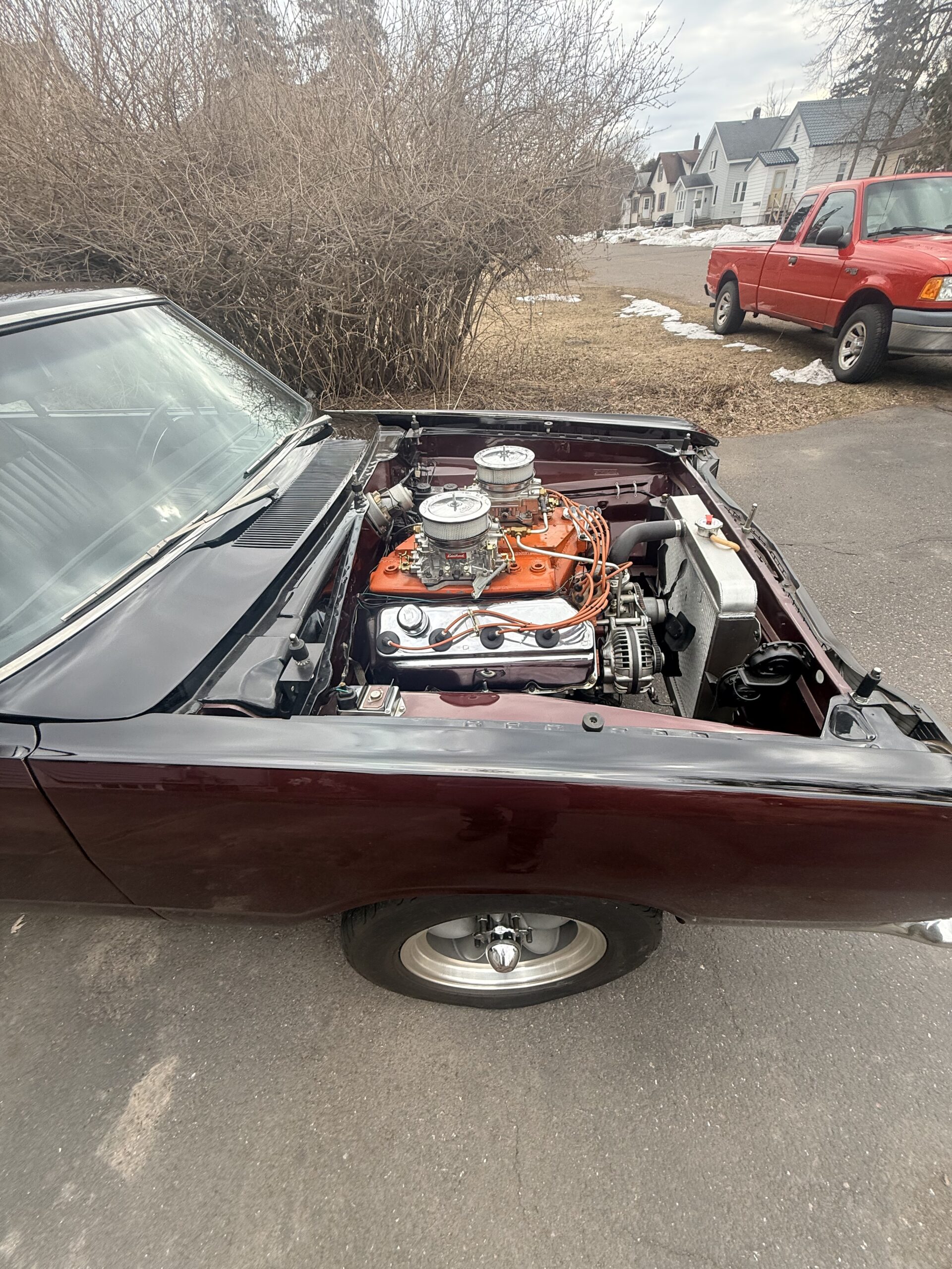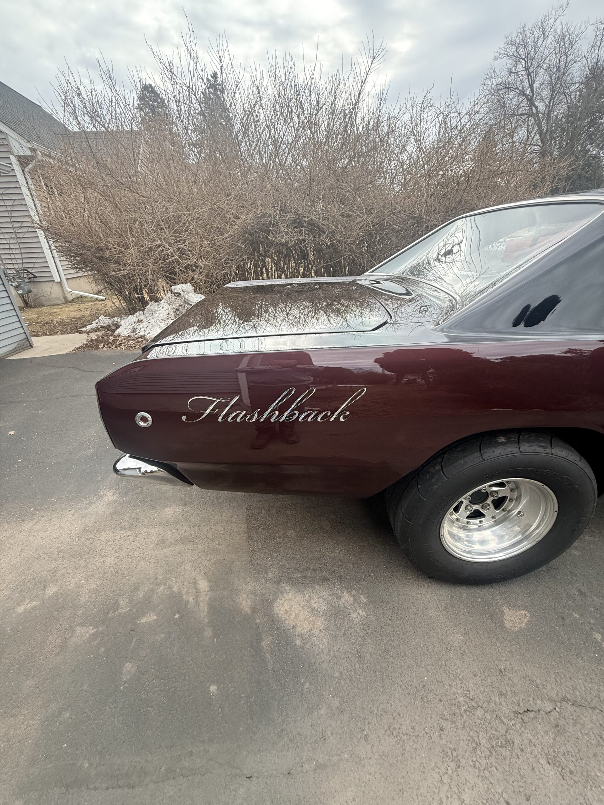 Custom black interior with burgundy piping from Legendary, heater, radio and outside mirror delete plates. 727 automatic with reverse manual valve body including one of the original shifter housings with pattern shift indicator. Interior door panels are the same as what come with the car. 3.55 sure grip rear end with super stock springs and shocks. Big tires out back, skinnies in front from Mickey Thompson. Replicate super stock battery in trunk, including spare tire and jack. Itās a street car that can be raced. I ran it at Garfield a couple of times.