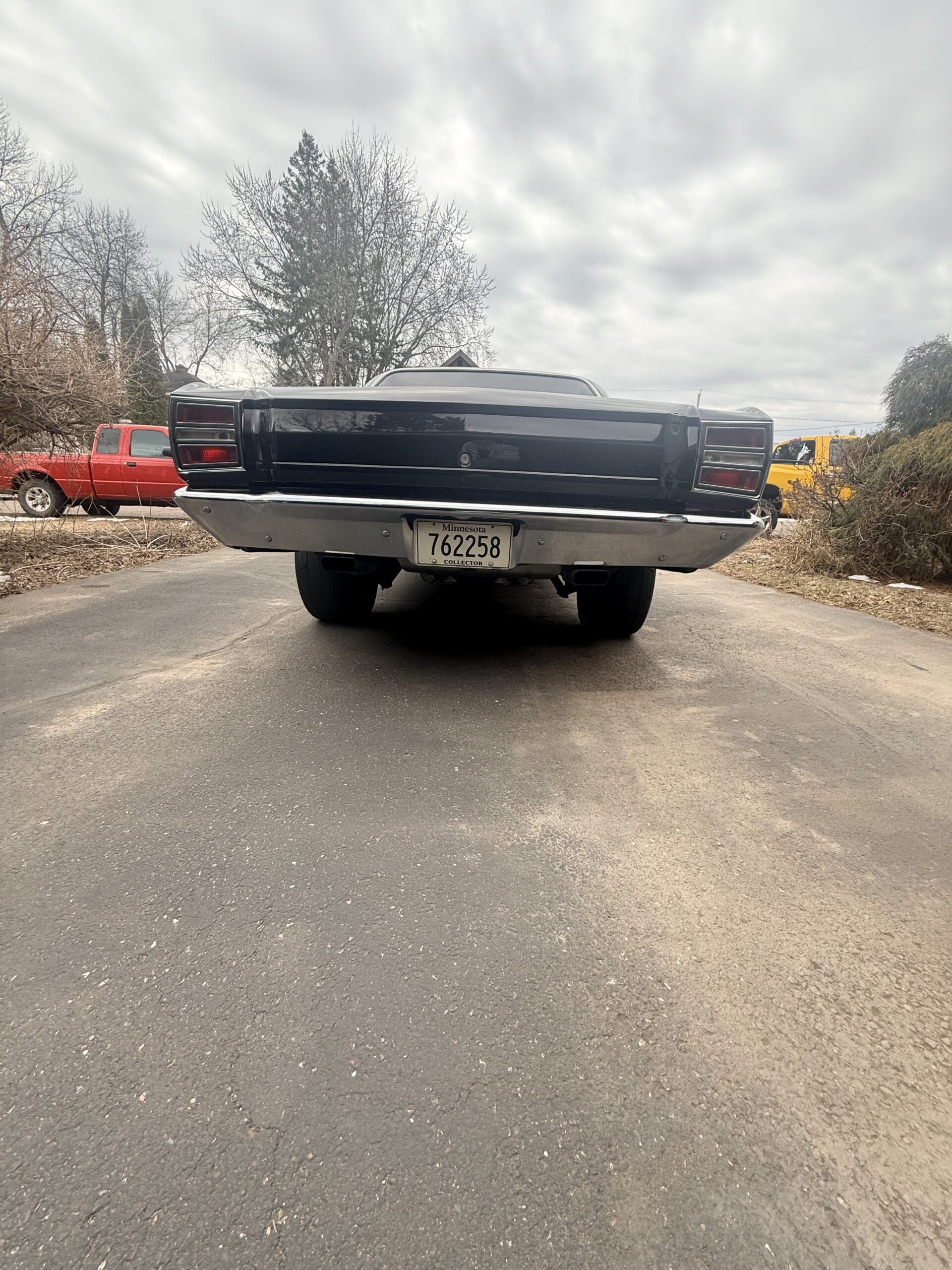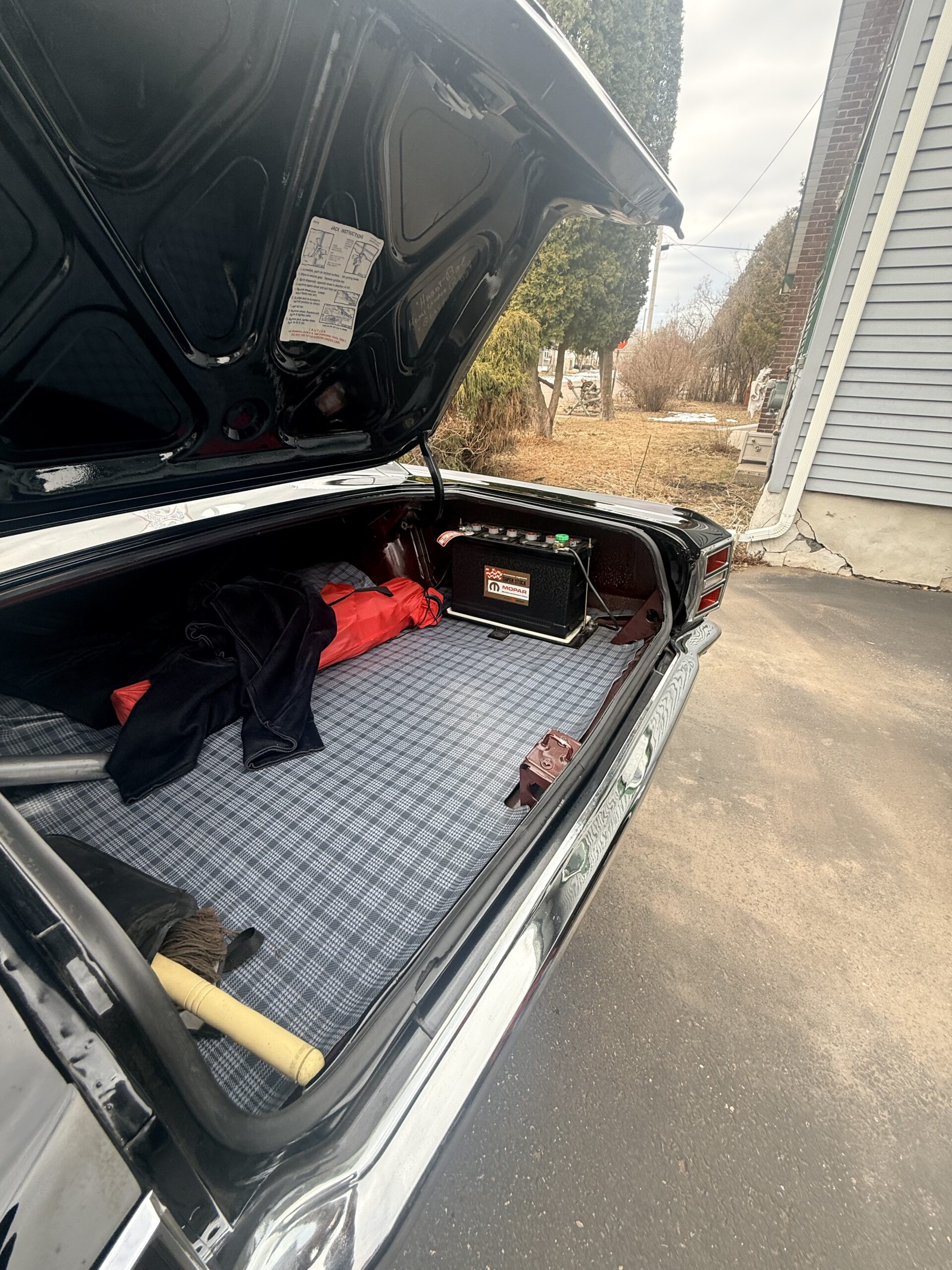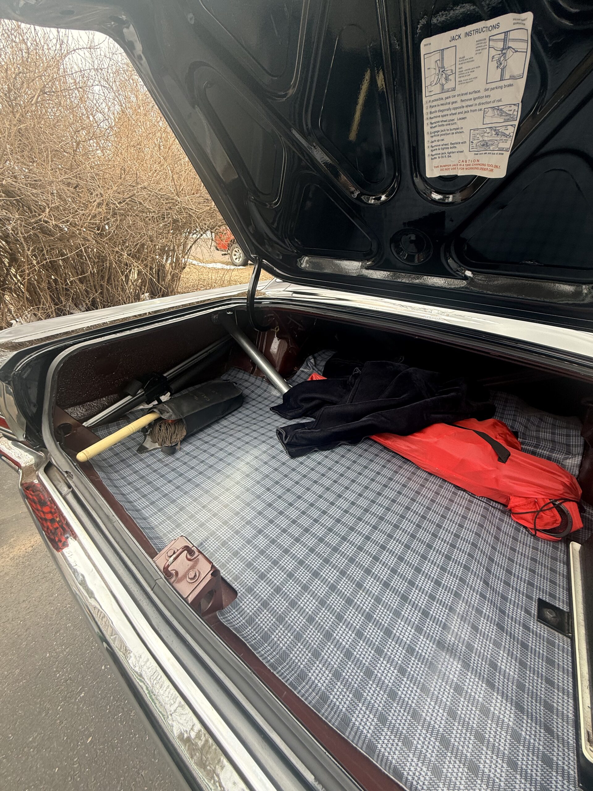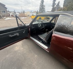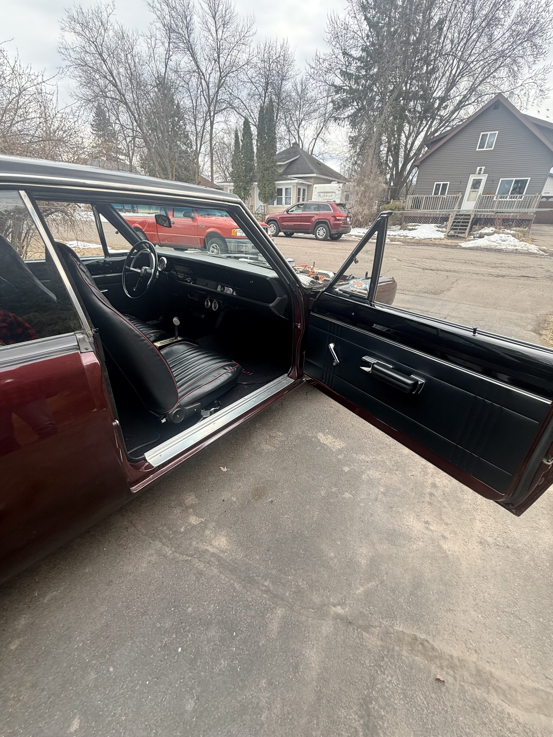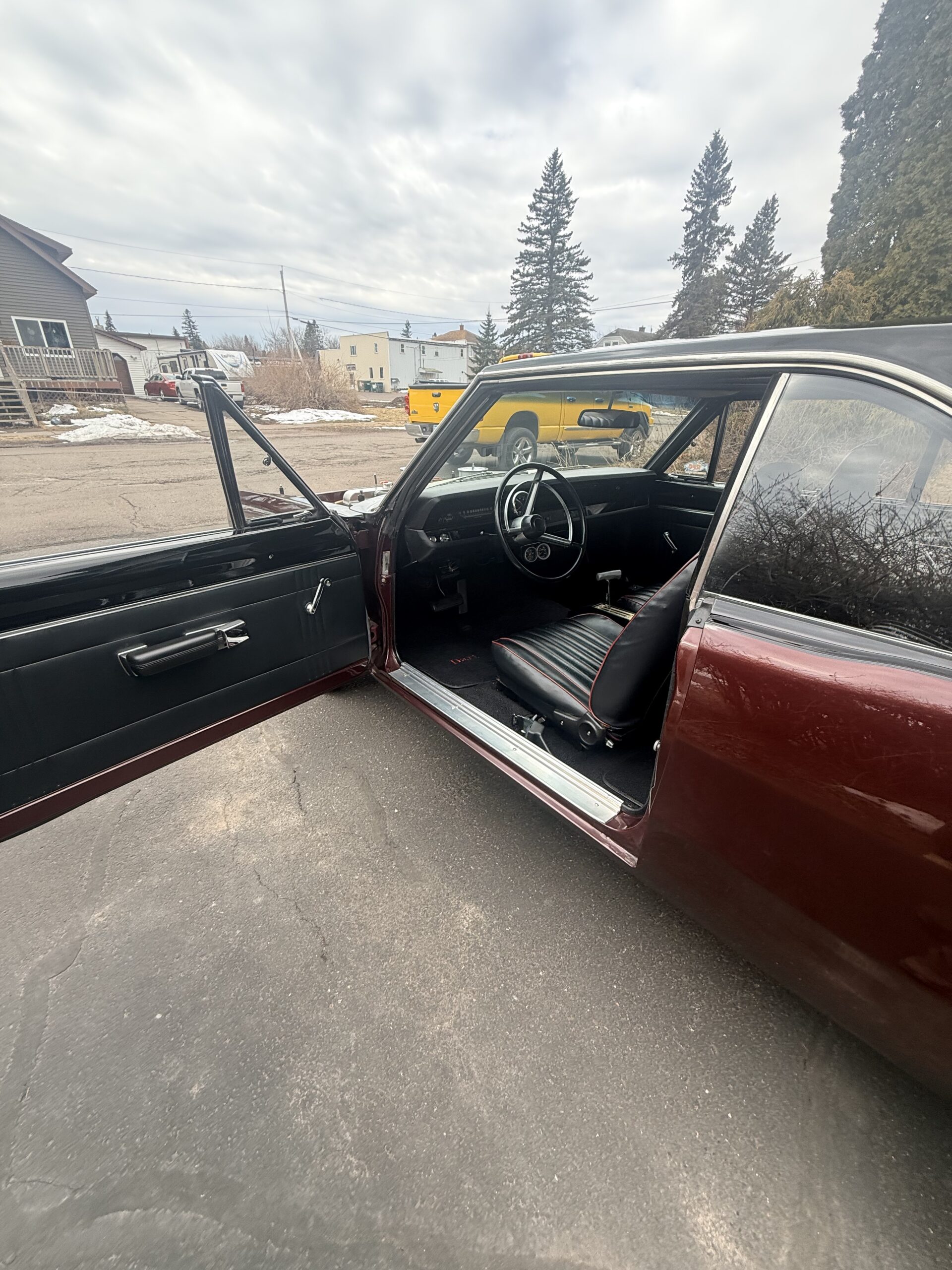 Custom black interior with burgundy piping from Legendary, heater, radio and outside mirror delete plates. 727 automatic with reverse manual valve body including one of the original shifter housings with pattern shift indicator. Interior door panels are the same as what come with the car. 3.55 sure grip rear end with super stock springs and shocks. Big tires out back, skinnies in front from Mickey Thompson. Replicate super stock battery in trunk, including spare tire and jack. Itās a street car that can be raced. I ran it at Garfield a couple of times.