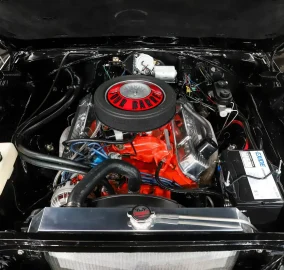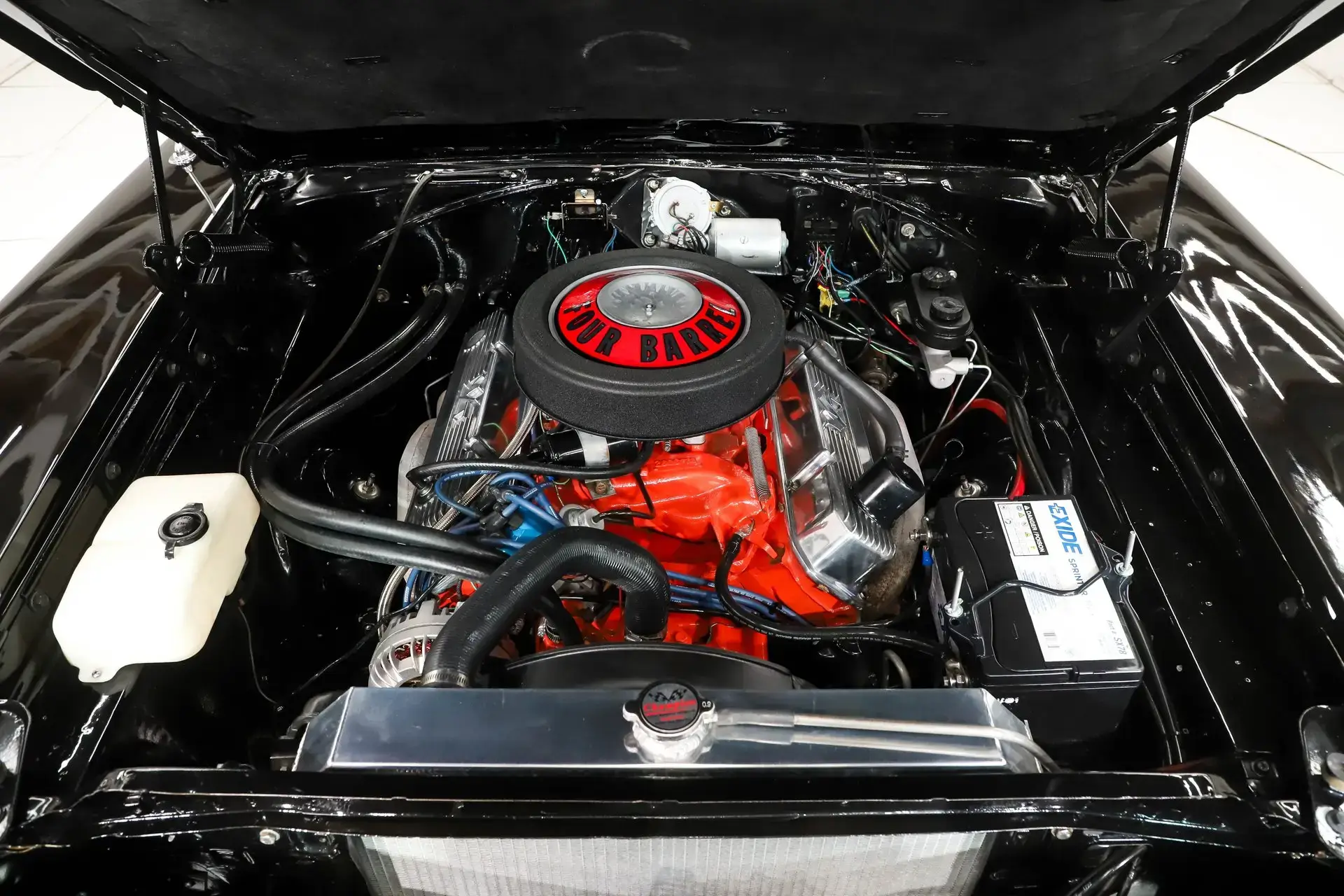 UNDERSIDE: This was flipped on a rotisserie during restoration. It has all clean metal underneath that was prepped and painted gloss black. Completely rebuilt suspension, it's upgraded with PSI bushings, KYB gas shocks at all four corners and lowering blocks in back. The brake system has been rebuilt, it has been upgraded to disc in front and the e-brake is hooked up. It's a custom stainless Pypes exhaust with an x-pipe and correct tips. The fuel system was replaced and the tank is polished. Looking up at the motor it is still spotless and has a high torque starter. The VIN numbers are down by the oil pan that matches the car and the correct casting codes are visible. The 727 Torqueflite automatic is #s matching and rebuilt. It has an 8 ¾ Sure Grip rear end with Moser axles.