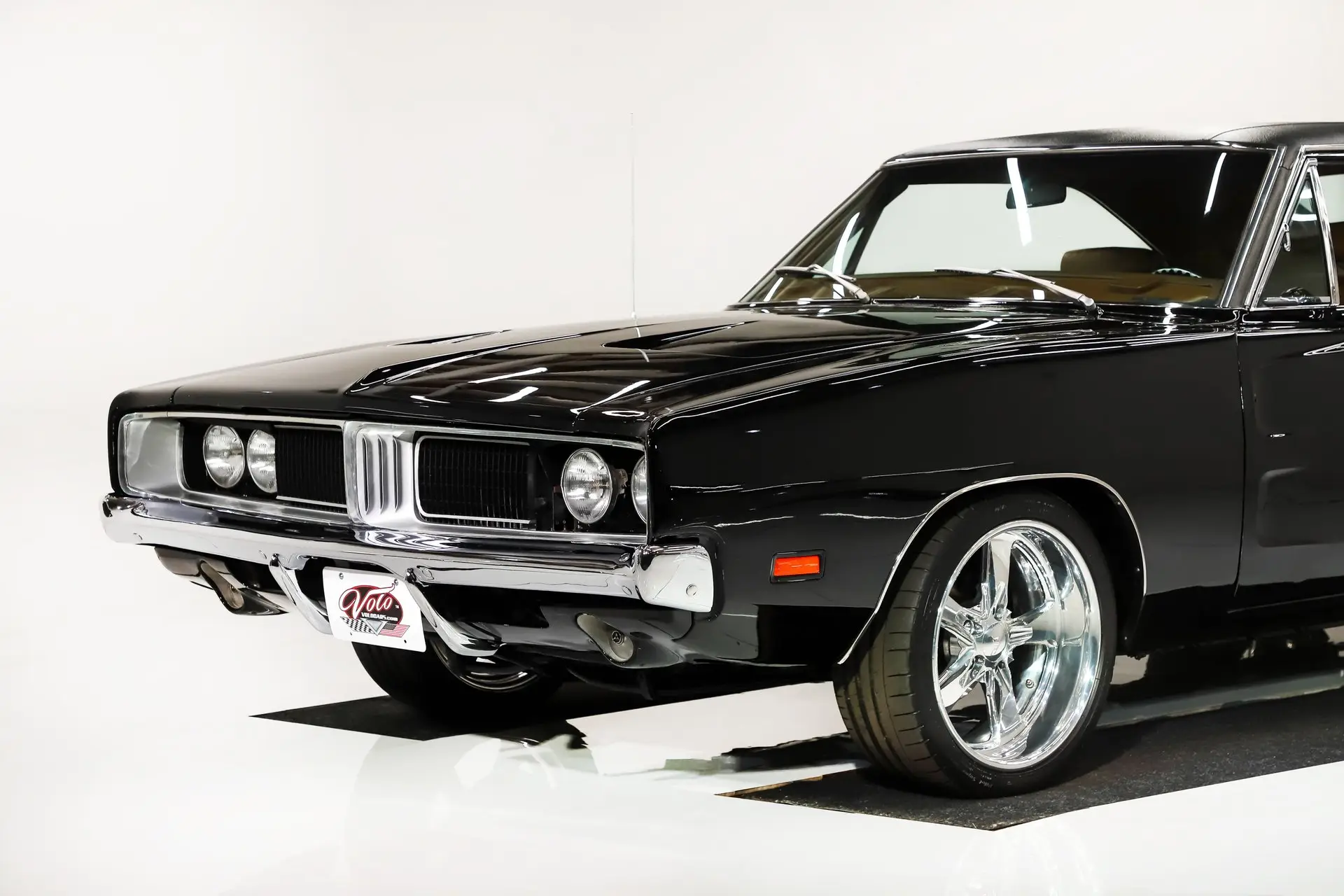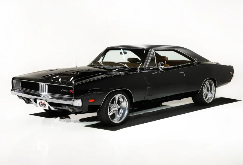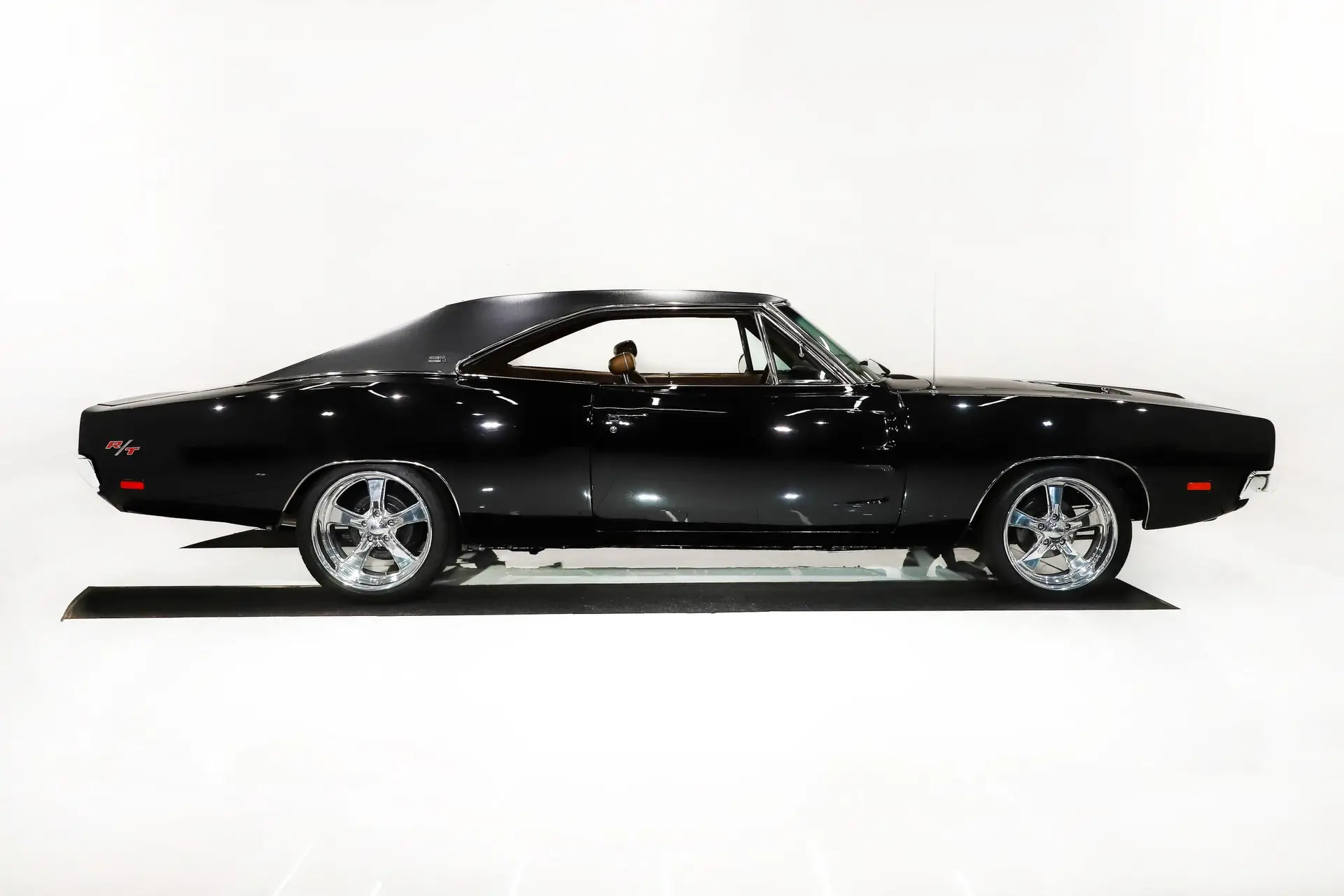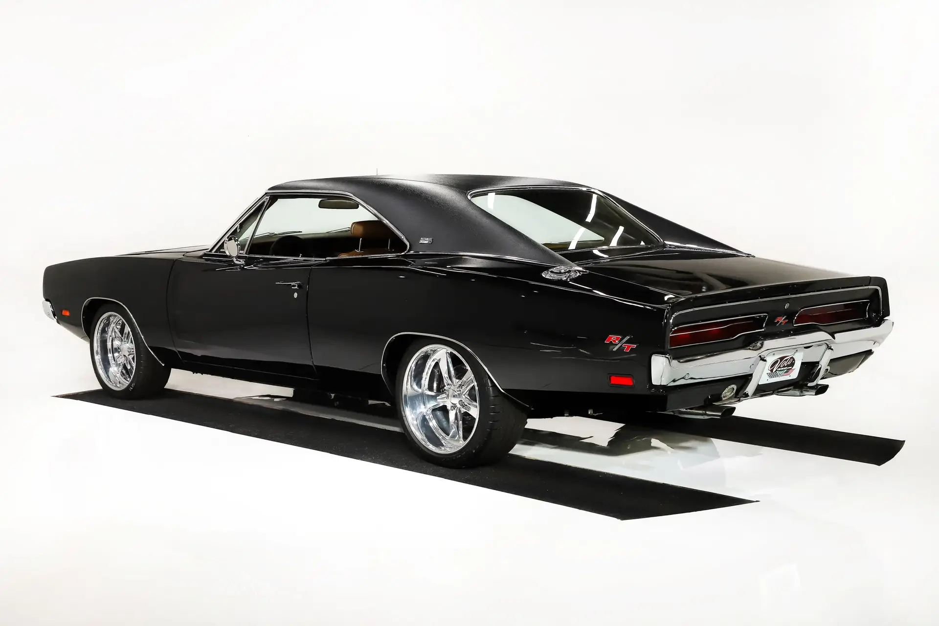 EXTERIOR: This R/T looks amazing in black, it's something you rarely see on a Charger. The body was flipped on a rotisserie and massaged to a laser straight finish. The panels all fit real nicely, no rust or damage showing. It is polished smooth and glossy, it looks like you could dive right into it. New vinyl top, new front and rear windows. The chrome and trim is shiny and straight. The hideaway headlights work. New Budnik wheels: 18s in front, 19s in back and they are wearing Michelin Pilot Sport tires.