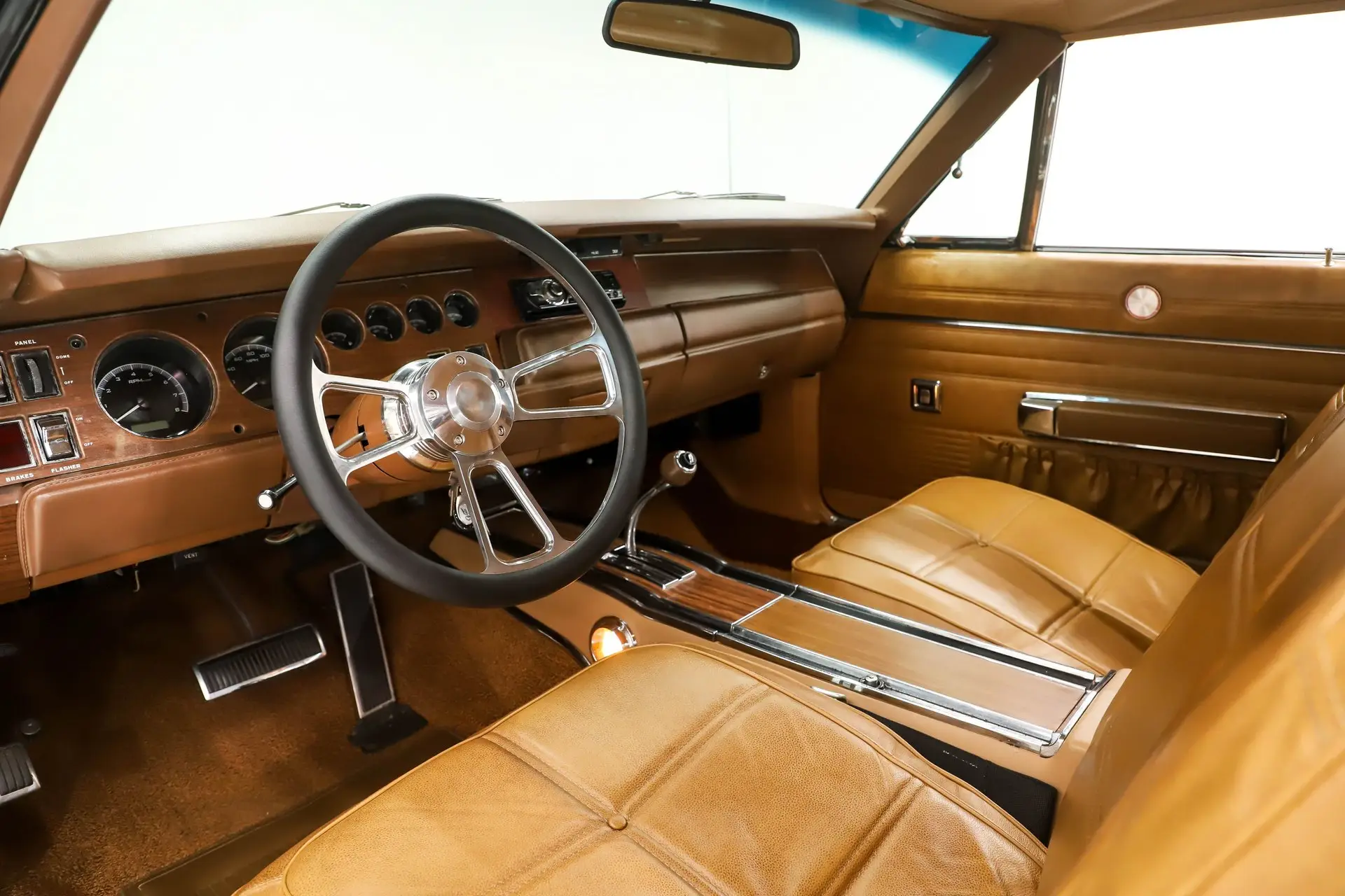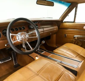 INTERIOR: The SE special edition included genuine leather on the front bucket seats which this has and it's new from Legendary Interiors. The back seat was also reupholstered. The upper and lower door panels and armrest bases were replaced. Down on the floor it has fresh carpet and overhead the headliner was replaced. The console is original and has been cleaned up nicely. The dash is updated with some sharp looking Dakota Digital gauges. It also has a modern Sony stereo and custom steering wheel.