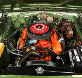 ENGINE COMPARTMENT: Under the hood has a definite survivor quality. At the heart of it is the VIN # matching 440 magnum engine making 375 horsepower. Looks like all stock valve covers, manifolds, and air cleaner. It also features power steering and power brakes. It is upgraded with an aluminum radiator and new shroud. The engine bay is all original clean metal with it's original paint. The hidden VIN on the core support matches the car and the original fender tag is still attached. The squirters are hooked up, the horns are in place, and the battery is properly secured.