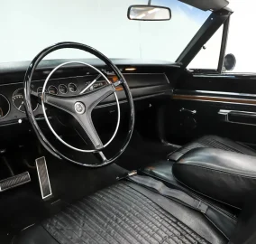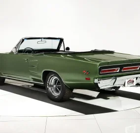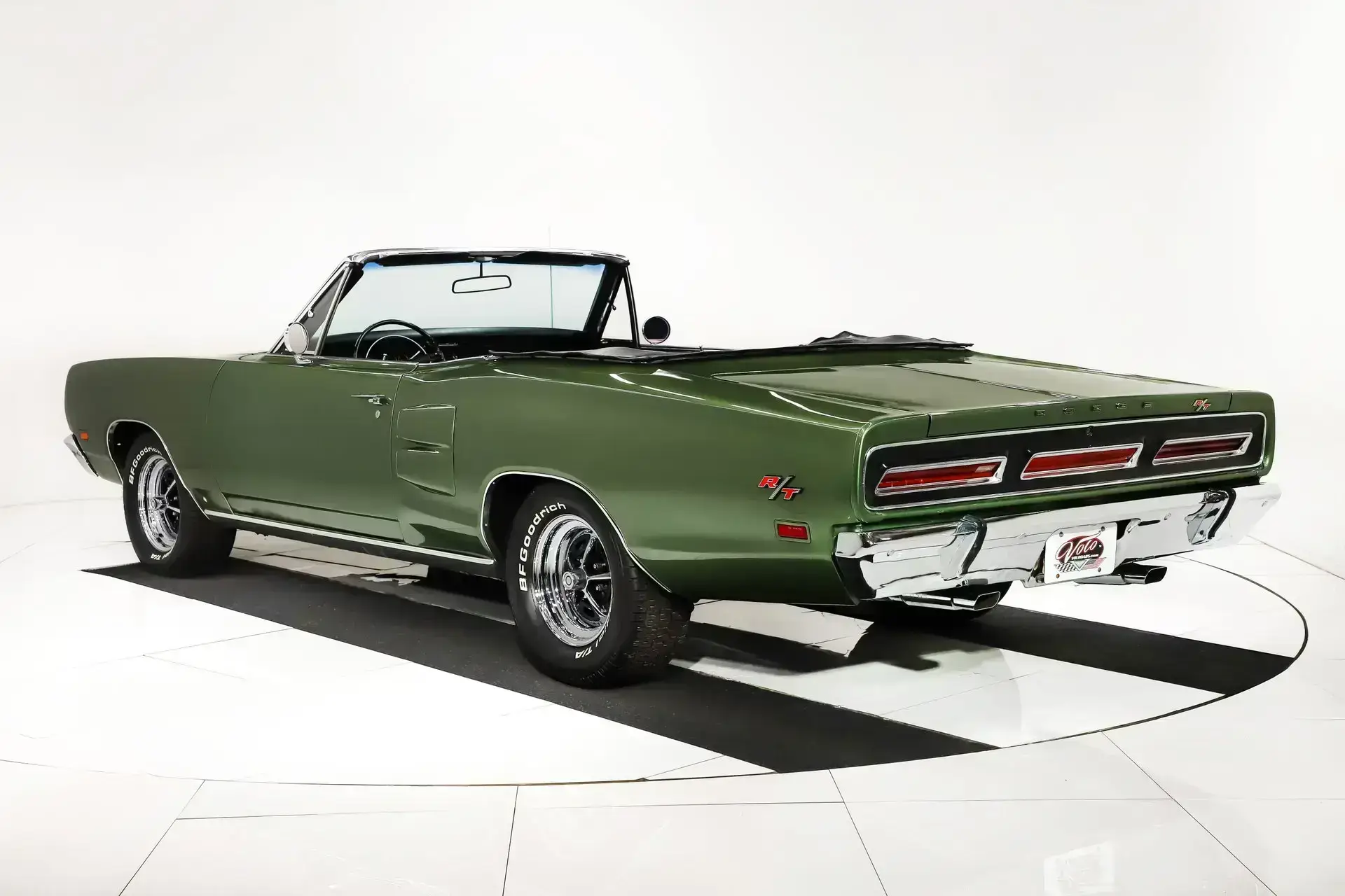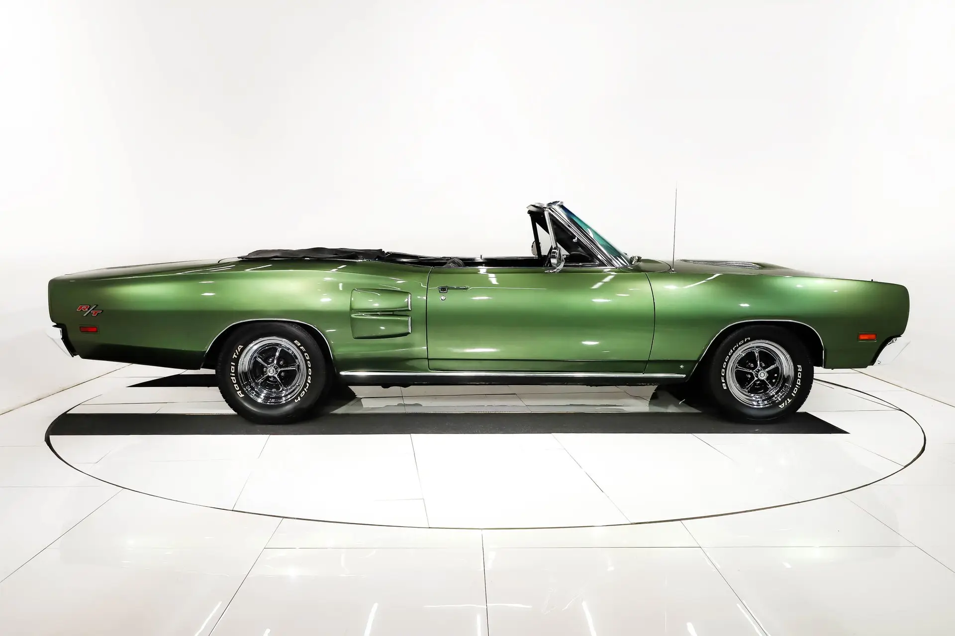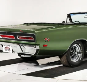 EXTERIOR: Alright, this is a great looking convertible. Believed to have all of its original body panels, I'm looking down the side and its arrow straight. It's smooth right down to the bottom, I don't see any bubbles or damage, all the panels fit real nicely. The R/T comes with the bulge hood and this one even has the optional scoops on the quarter panels. This one has the optional fender mounted turn signals and bumper guards. Repainted its original Medium Green Metallic color it has a very smooth and glossy finish. The bumpers are in real nice original condition. The windshield's been replaced. The black convertible top is in real nice shape. It's sitting on some beautiful 15" Magnum 500 wheels wrapped in BFGoodrich tires.