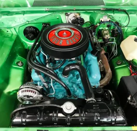 ENGINE COMPARTMENT: The original VIN number matching 340 cubic inch four barrel engine is still in place! The engine bay is detailed to factory specs. It has been freshened up with the correct paint and still has many of the original parts. It looks like the carburetor was rebuilt. It was equipped with power steering from the factory. The battery is properly secured and even the squirters are hooked up. The original fender tag is in place.