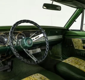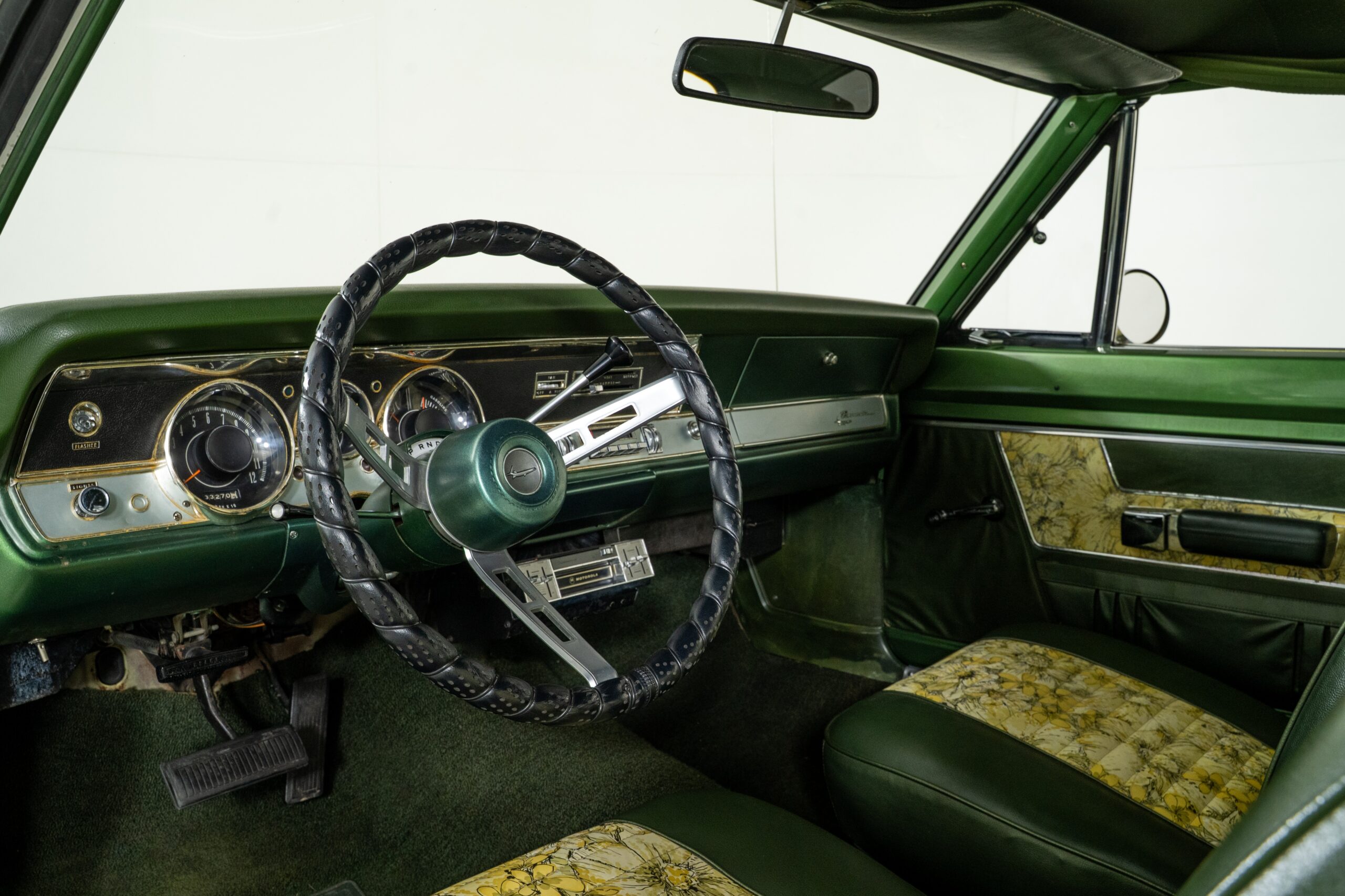 Inside, the green vinyl bucket seat interior features matching Mod Top floral inserts, creating a bold contrast that's pure 1969 style. The leather-wrapped steering wheel, power steering, and dual exhaust make this Plymouth Barracuda as enjoyable to drive as it is to admire. The cabin is rounded out with a period AM radio and a Motorola 8-track player, perfect for reliving the soundtrack of its era.