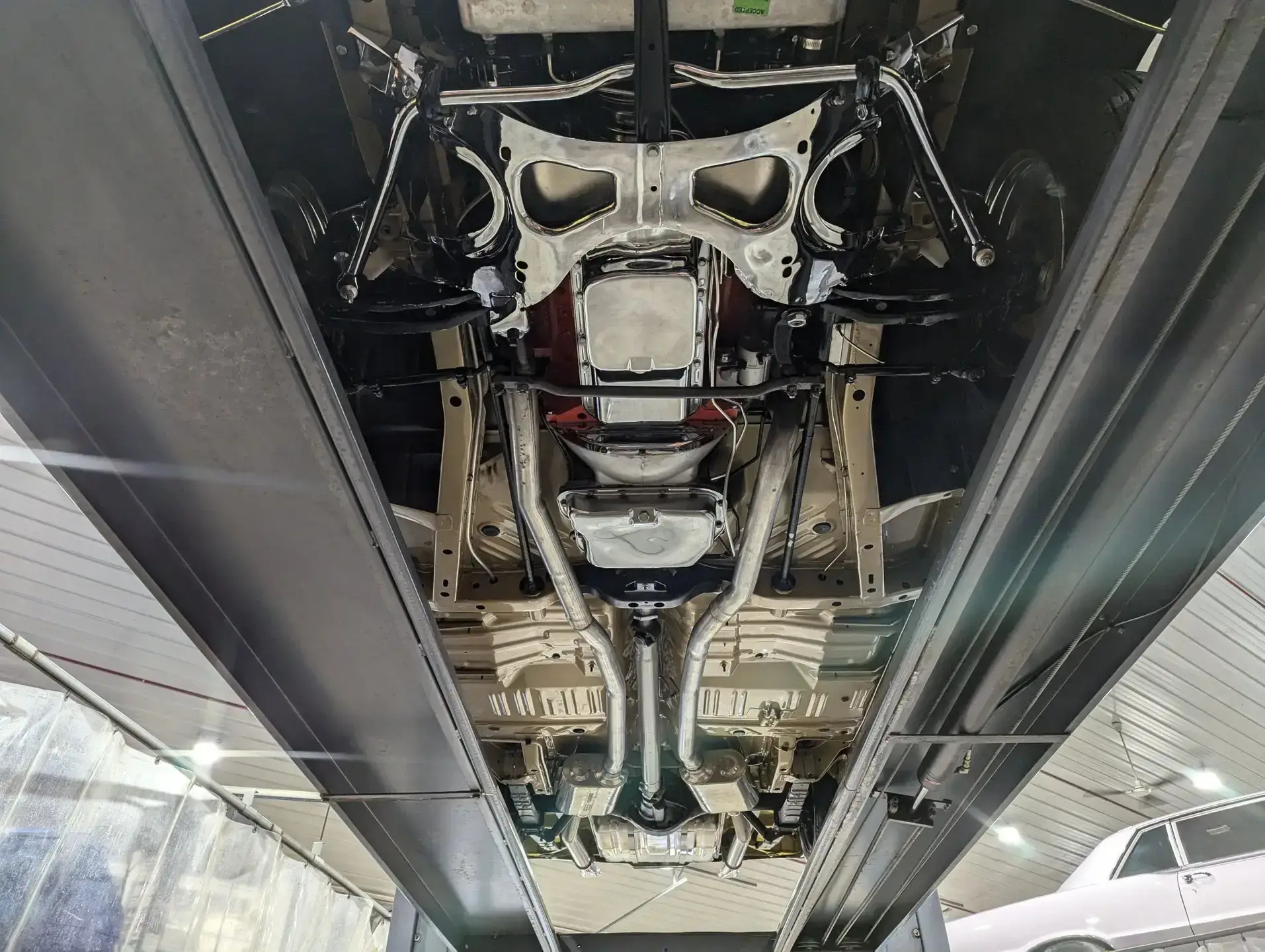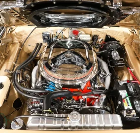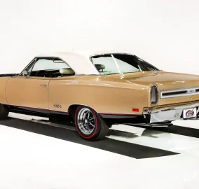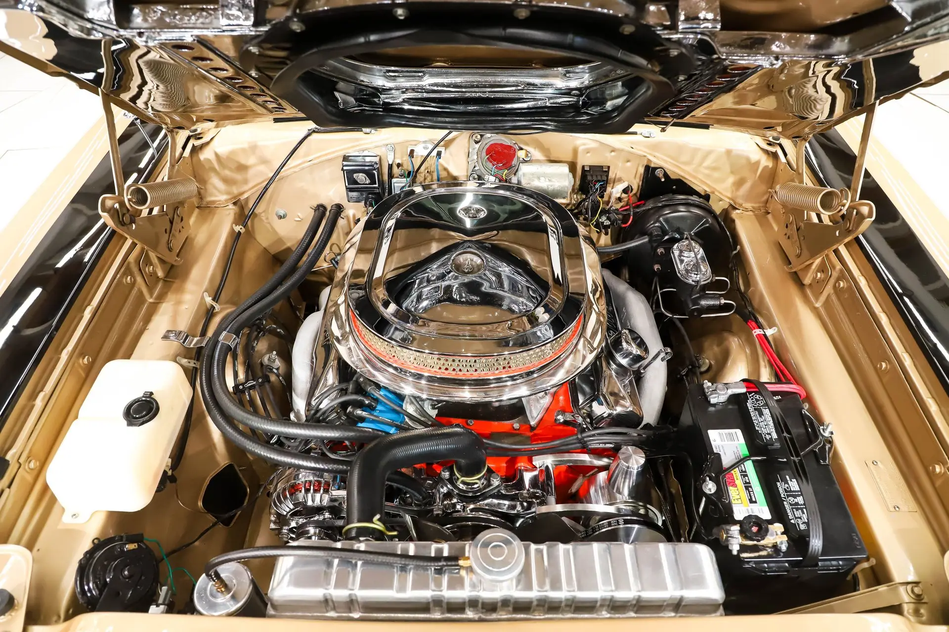 UNDERSIDE: Every single component was removed from under this car it was flipped on a rotisserie. The floors and frame rails are all pristine metal painted the same high gloss Spanish Gold as on top. The front suspension has been completely rebuilt. The front K member, swaybar and upper control arms are chrome plated! The rear suspension was rebuilt. The brake system was upgraded with disc at all four wheels, the lines were replaced. It has a custom exhaust with Flowmaster mufflers and the correct tips. The new fuel system was upgraded with a polished stainless tank that looks like chrome. Looking up at the motor it is spotless with a chrome oil pan and high torque starter. The VIN # matching 727 Torqueflite automatic has been rebuilt and has a chrome pan. The rebuilt driveshaft goes back to an 8 3/4 rear end with 3.23 Sure Grip gears.