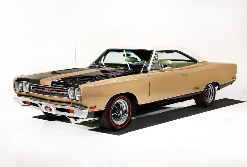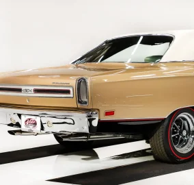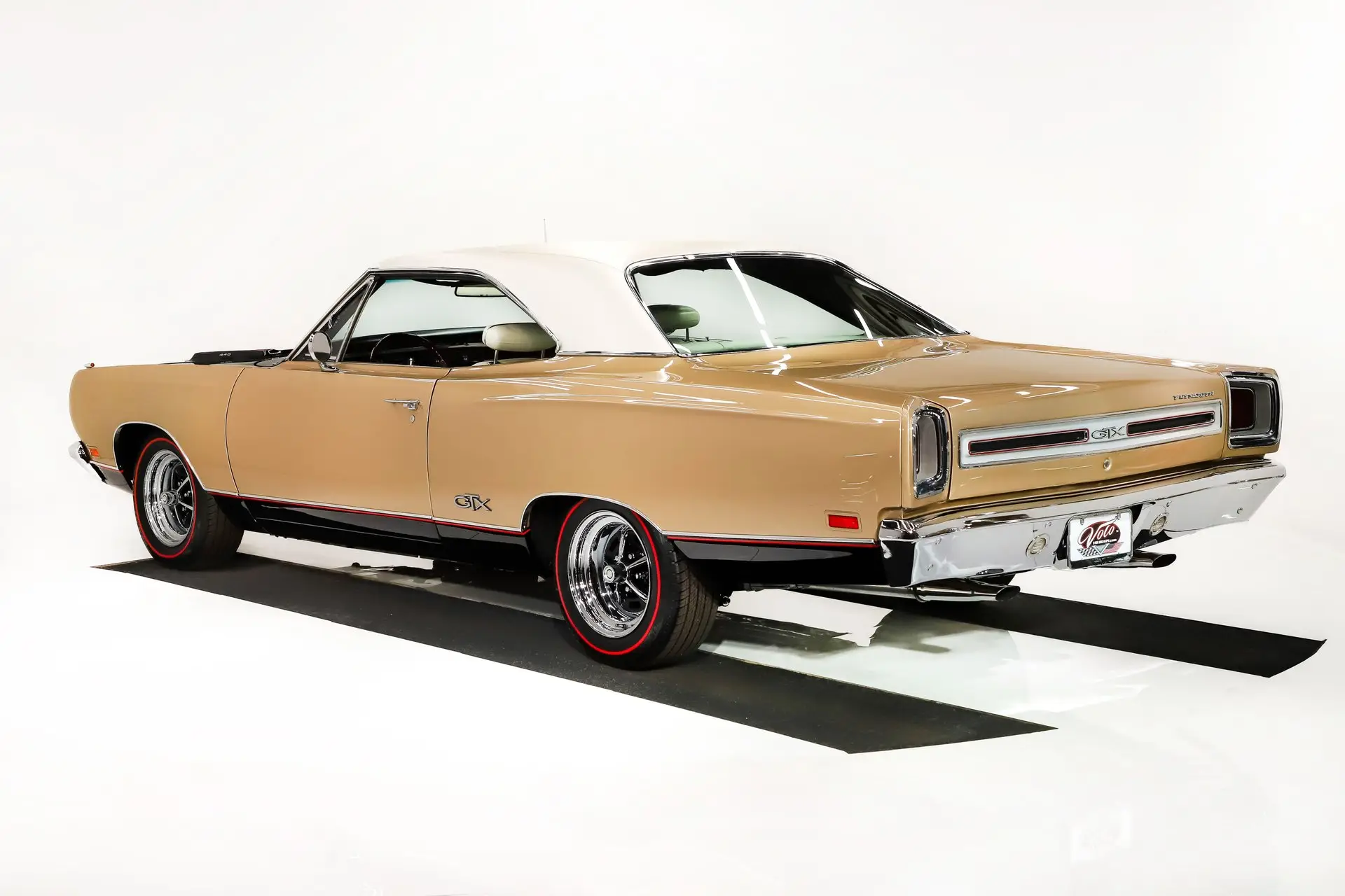 EXTERIOR: Was this thing dipped in clear or what? It is polished glossy everywhere! The body work is outstanding: it's straight, all the lines are right on, the panels fit properly, and doors shut like new. There is no rust or damage. Repainted its original rare Spanish Gold color. The light gold metallic has been laid out evenly and the clear coat is polished like wet glass. The black stripes are typically a matte finish, but on this GTX they are glossy and man does it look good. The functional air grabber hoods have red grills which pick up the other red accents very well. The new vinyl top is a beautiful pearl white. The chrome sparkles! The front bezels have been chrome plated and the grill is restored. The turn signals on top of the fenders have fresh chrome, as do the door handles, vent window frames, antenna base, mirrors, and door handles. The stainless trim and even the wiper arms are polished. The tail panel and taillights look like new, the bumper is rechromed. The windshield and side glass have been replaced. It's sitting on some sparkling new 15 inch Magnum 500 wheels, wider in back. They are wrapped in radial tires.