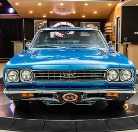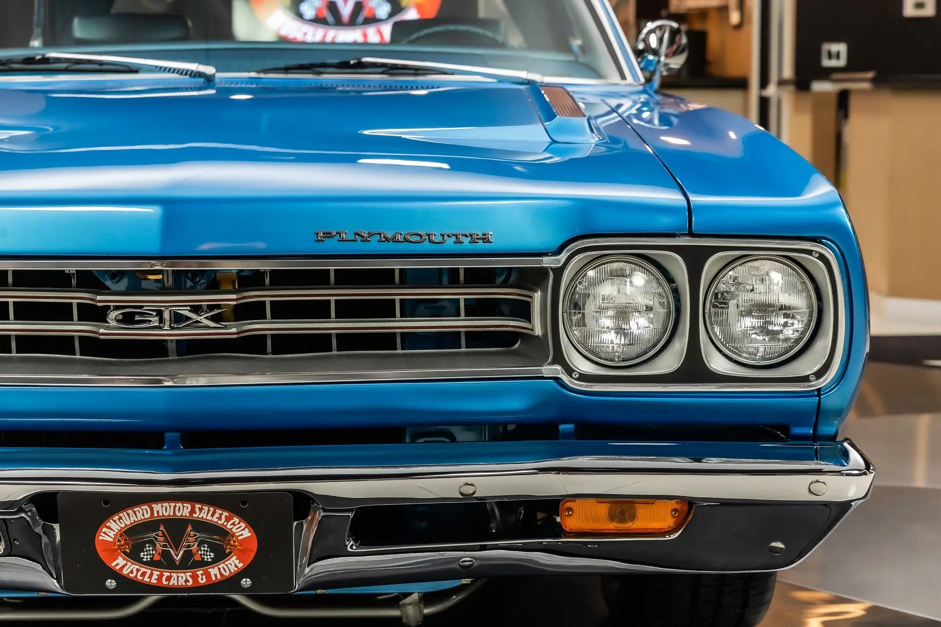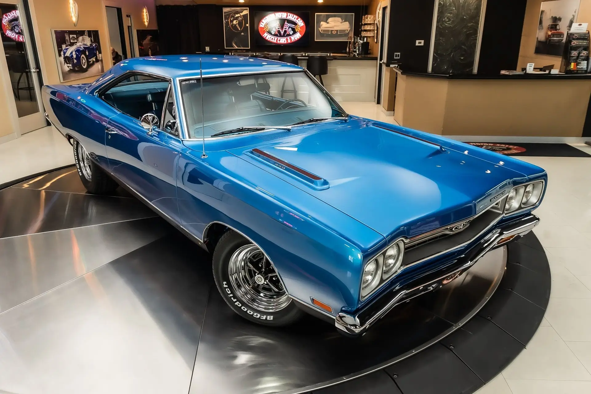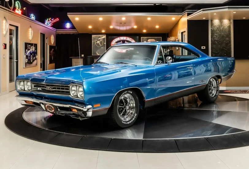 Check out this beautiful 1969 Plymouth GTX! This GTX has undergone a complete rotisserie restoration with high attention to detail seen throughout! This Plymouth has been finished in Glossy Blue with the Air Grabber Hood and Magnum 500 Wheels Wrapped in BFGoodrich Radial T/A Tires! Under the hood sits a 440ci V8 Engine with a Four Barrel Edelbrock Carburetor. Power is sent to the road through a 4 Speed Manual Transmission and Dana Suregrip Rear End with 3.54:1 Gear Ratio. This GTX also has Power Brakes, New Brake lines, New Fuel Lines, Power Steering & Front Disc Brakes. The Painted Underside features a New Exhaust with Flowmaster Mufflers, New Fuel Tank and factory New Style Suspension!