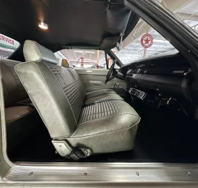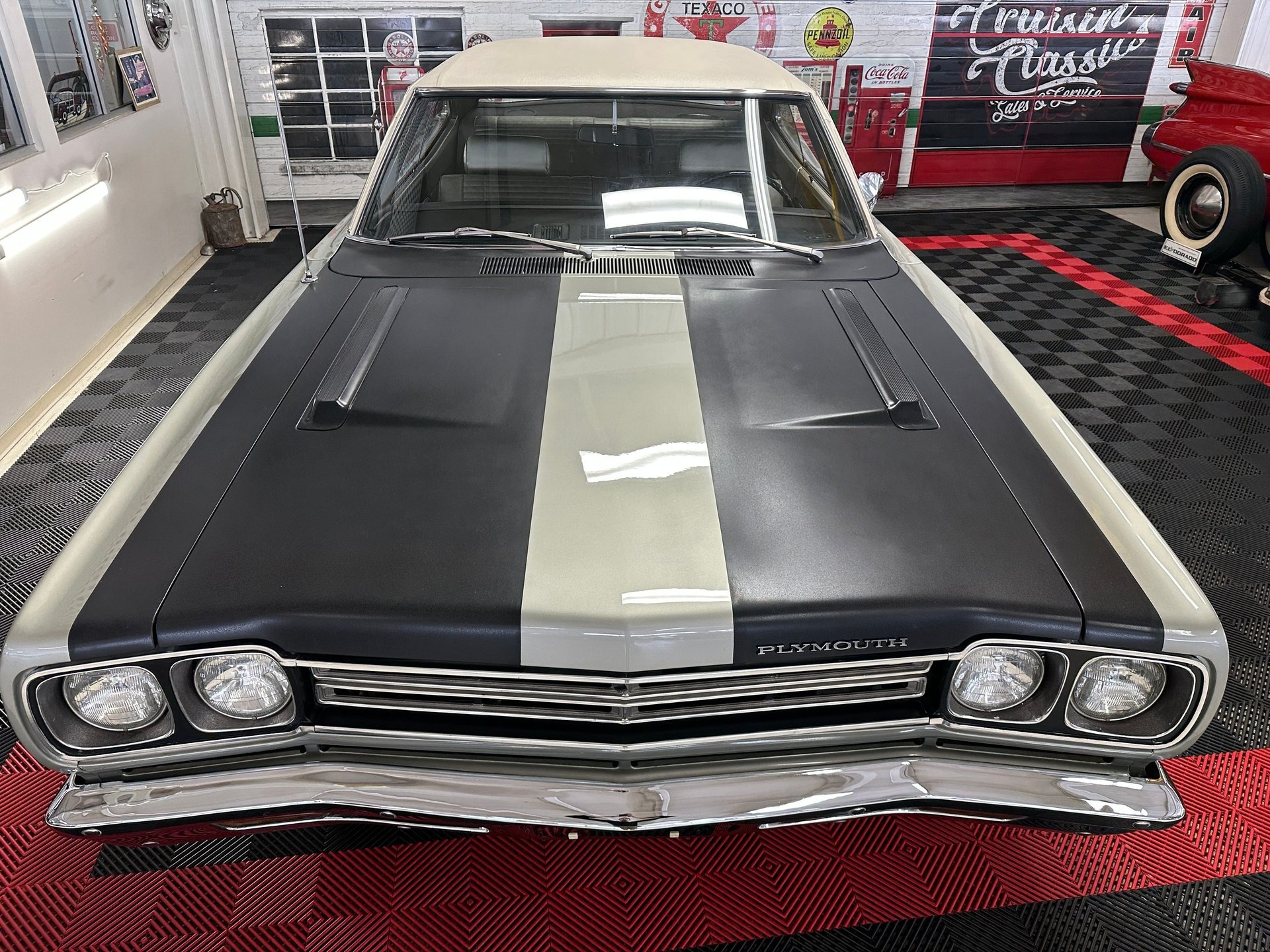 This Plymouth comes to us dressed in a high-quality respray of its original color ā Silver Platinum (A4) with matte black stripes on the Performance Hood (V21). The black stripes accentuate twin faux hood vents with 383 badging that let you know what's hiding beneath. Below the front of the hood are a horizontal grille flanked by dual side-by-side headlights and a mirror-finish chrome bumper. As you move around to the side of the car the White vinyl top (V1W) comes into focus and it looks fabulous against the Silver paint. The vinyl top is in excellent condition and it's framed by bright window trim, drip rail molding (M21), and belt molding (M31). Originally equipped with longitudinal white stripes (V6W), this car now has the factory-optional thinner white accent stripes that run from tip to tail about a quarter inch below the upper body line and they look perfect with the white top above. The doors feature āroad runnerā badging, colorful bird decals, chrome door handles, and a bright drivers side mirror. The wheel and tire combination are the perfect complement to this ride ā steel Kelsey Hayes Road Wheels (14X6) all wrapped in brand new Firestone Wide Oval Redline tires. Around back at the rear you'll find a gleaming bumper with integrated reverse lights, dual chrome exhaust tips, and a āroad runnerā badge and bird decal on the decklid. Take a quick peek under the car and find an impressively clean undercarriage and a newer-looking exhaust system.