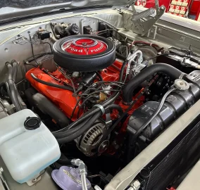 Lift the hood to reveal an immaculate engine bay with glossy Silver paint. At the center sits the original numbers-matching 383ci V-8 dressed in a fresh coat of orange paint. The big block is topped with orange valve covers, an orange intake, the original Carter AVS 4-barrel carburetor, and correct black air cleaner with ā383 Road Runner Engineā decal. The engine was recently treated to a tune-up that included new plugs, plug wires, distributor cap, rotor, and points ā and it's running in tip-top shape. Also under the hood is a brand new Vintage Air A/C compressor, original HP exhaust manifolds, and a purple āBeep-Beepā horn. The big V-8 is mated up to the original numbers-matching Chrysler New Process 4-speed manual transmission that puts power to the pavement via the original 8 ¾ā Chrysler rear axle with 3.23 Sure-Grip gears. Steering is manual, suspension is stock, and brakes are manual drums on all four corners, just the way it came from factory.