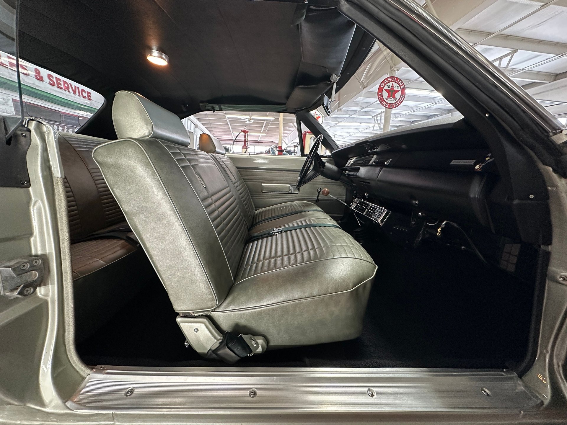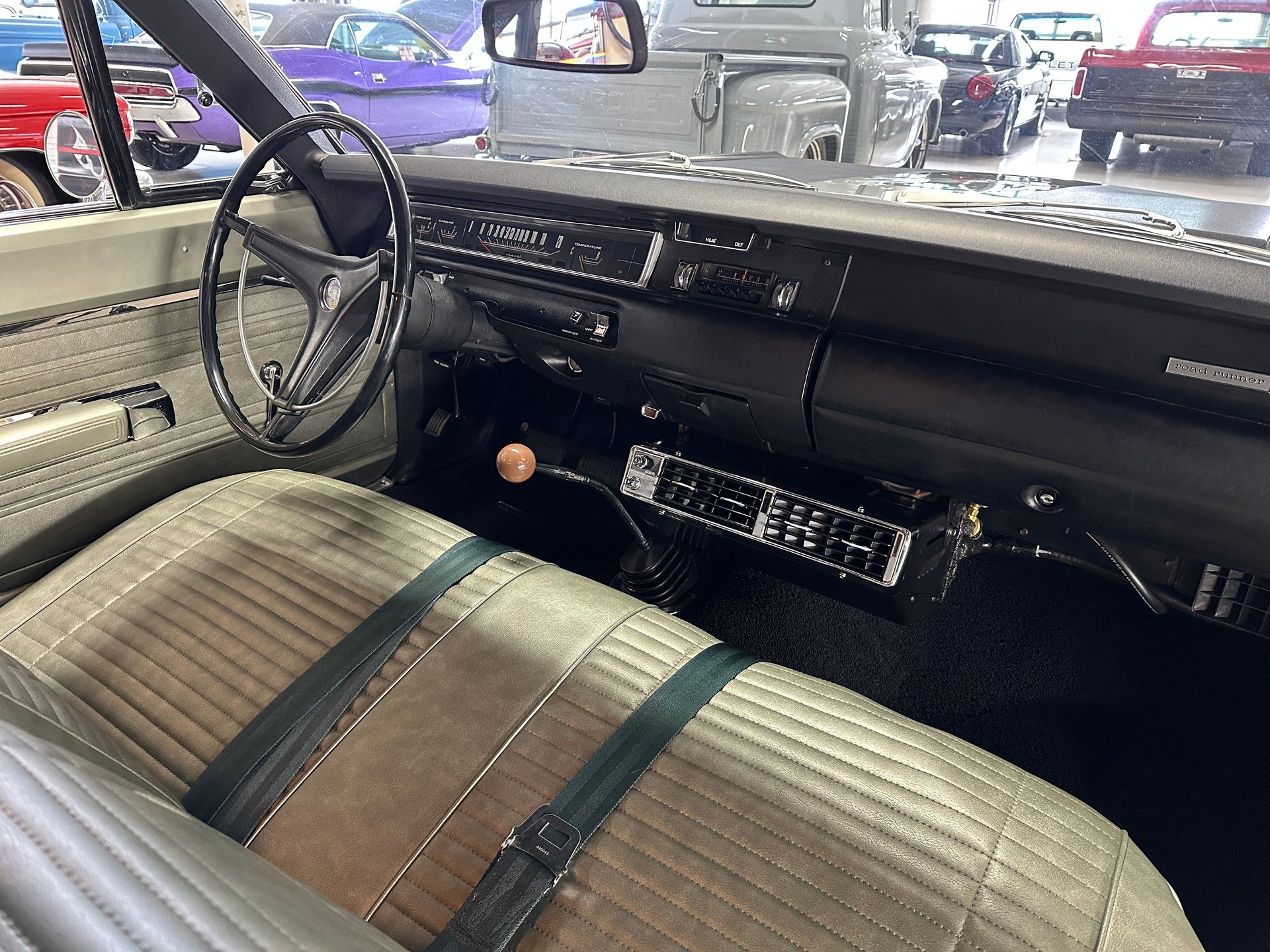 Open the drivers door and the dome light pops on to illuminate a jaw-droppingly nice Pewter vinyl and Black interior (trim H2S). The door panels look great with Pewter vinyl, bright trim, crank windows, and an armrest. Both the front and rear bench seats wear flawless Pewter vinyl and they're as comfortable as they are good-looking. The carpet is high-quality black hook & loop and the headliner is tight perforated black vinyl. While looking up you'll see overhead shoulder safety restraints. Rising up from the center of the front floor is a Hurst shifter with a brown shift ball and black rubber boot. Directly ahead of the driver is a black OEM 3-spoke steering wheel with working horn ring and bird head badge at the center. The black dash sports a brand new upper dash pad and it houses working gauges for alt, gas, temp, and a 120mph speedometer. The odometer reads 85,479 miles and the title confirms those miles to be actual. Also on the dash are controls for the working 2-speed wipers, a Chrysler solid state 2-watt AM radio, and working heat & fan controls. Ahead of the passenger is a glovebox with a flip-up door adorned with a āroad runnerā badge and bird decal. Mounted beneath the center of the dash is a brand new Vintage Air unit that looks great and pumps out ice-cold air with a strong fan on demand. Back in the trunk you'll find a plaid vinyl mat and a full-size spare tire. This exceptional Road Runner also comes with a color copy of the title from 1970, an original broadcast sheet (in great condition), an original owners manual, and a stack of receipts for some of the work done over the years.
