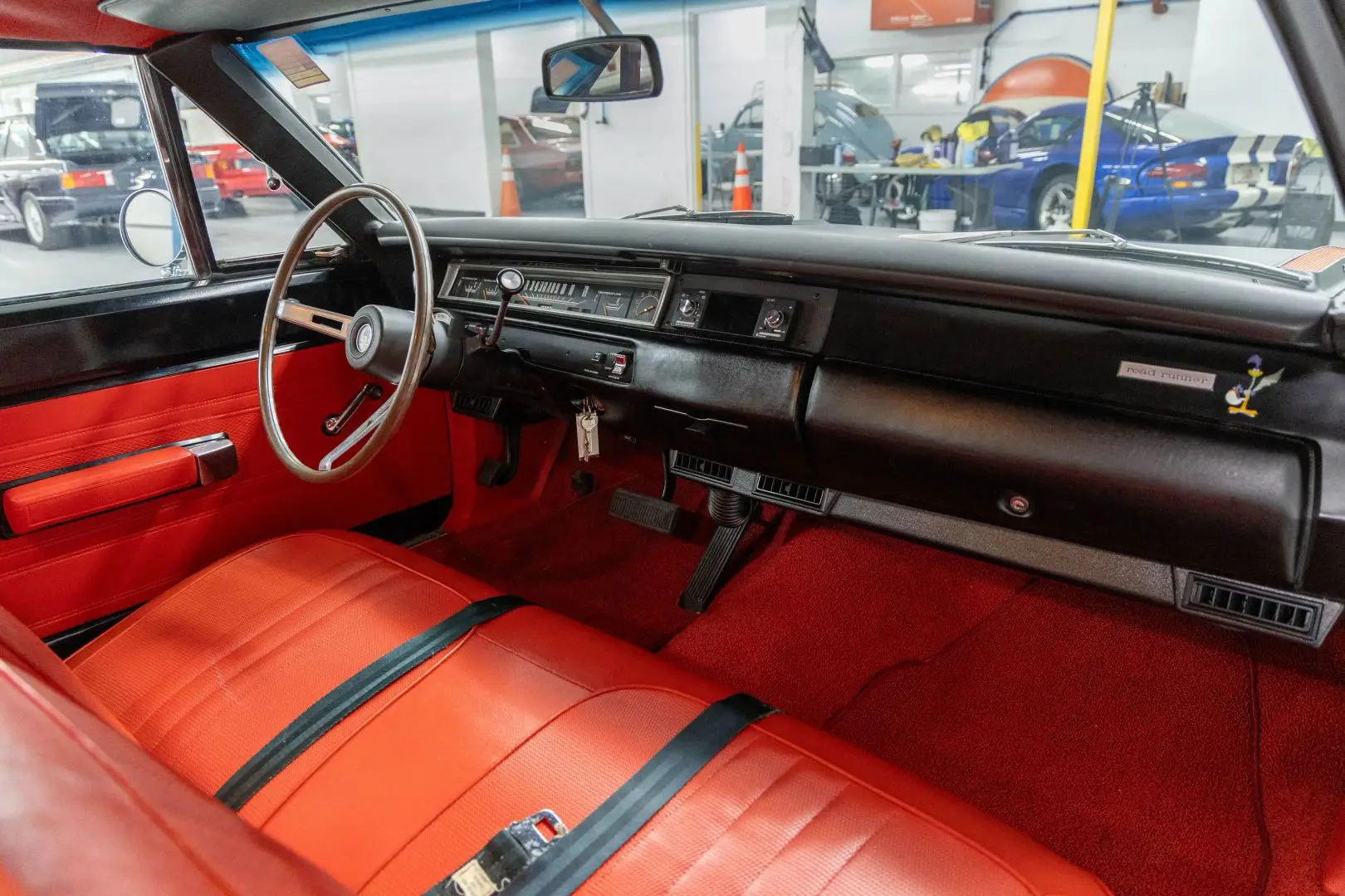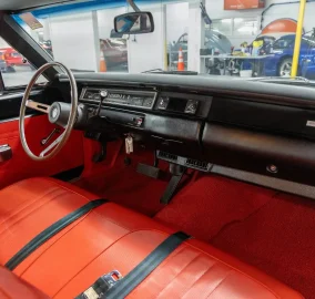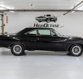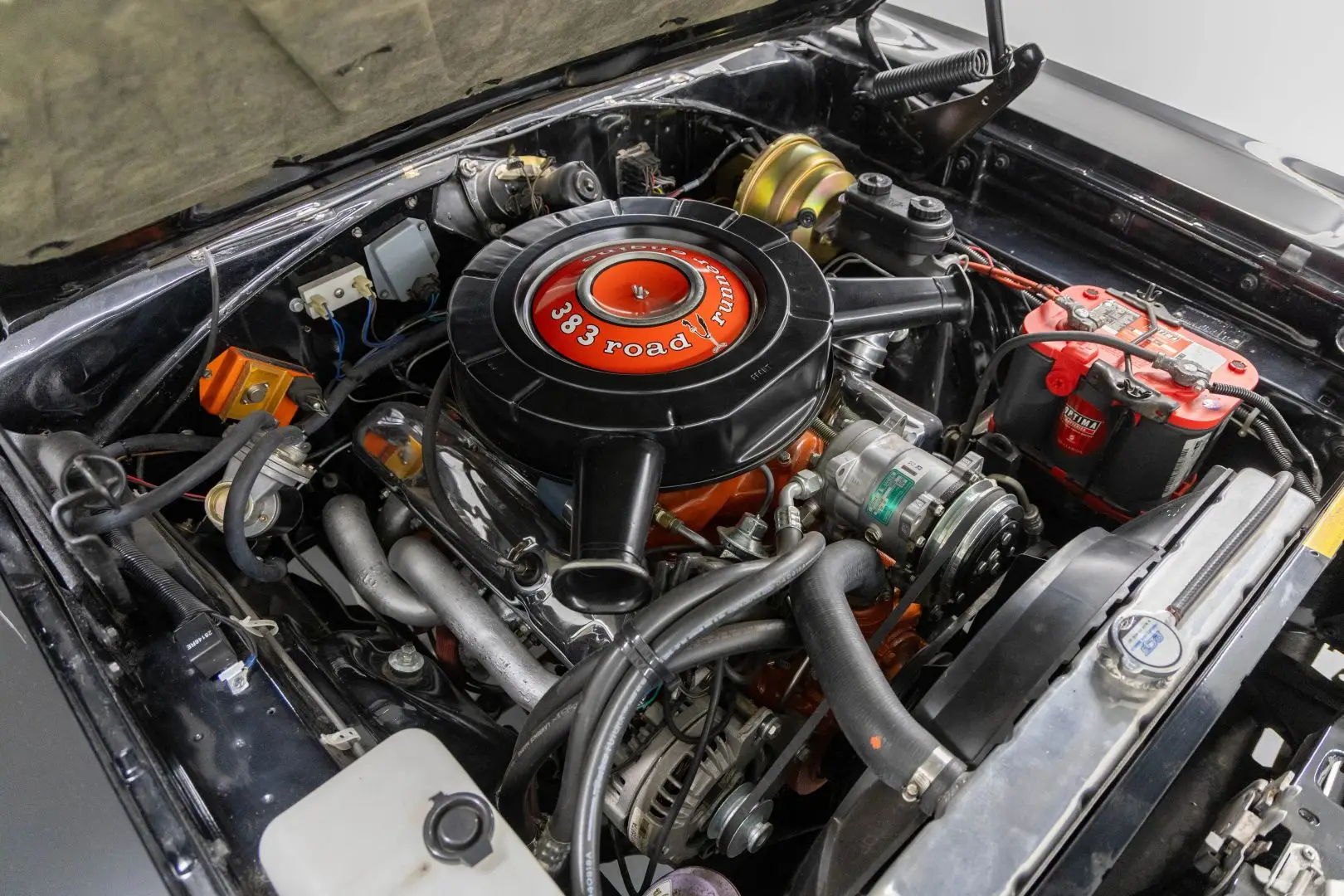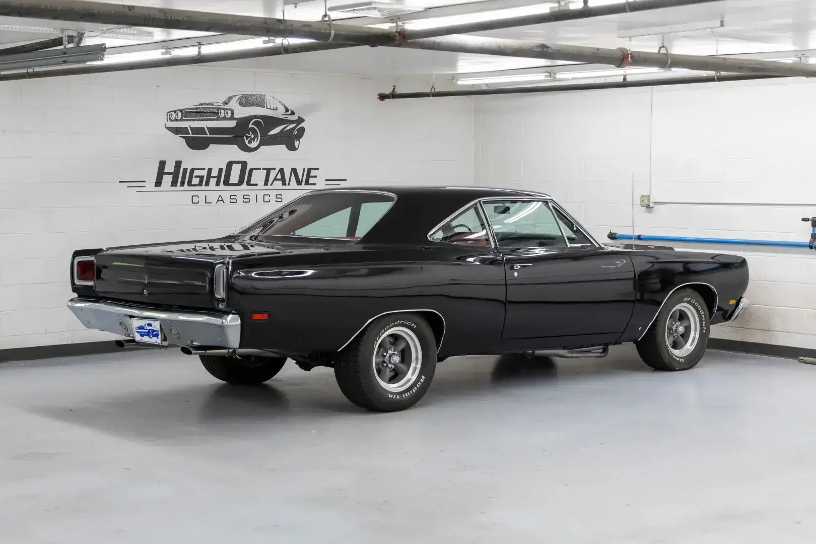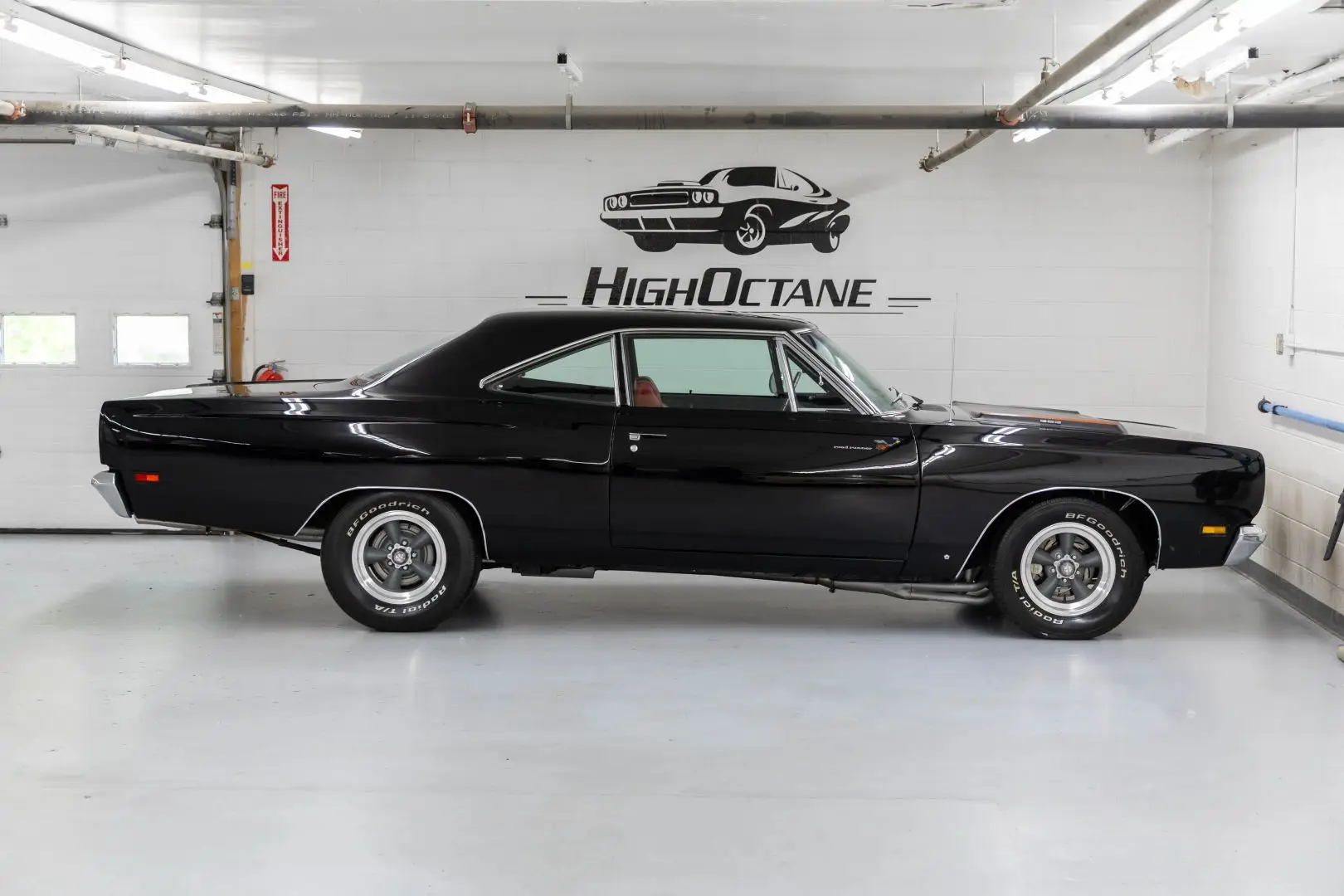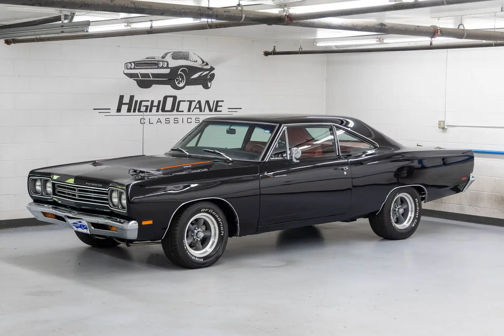 High Octane Classics is proud to present this 1969 Plymouth Road Runner, finished in its original color, Velvet Black, with a red vinyl interior. Power comes from a 383ci V8 backed by an Automatic transmission. Under the hood the 383 has been paired with an aluminum radiator, modern air conditioning, chrome valve covers and aftermarket headers. On the inside you'll find a bench seat, column shifter and optional tachometer paired with a more modern radio and A/C venting under the dash. On the outside this Road Runner rides on a set of American Racing Torque Thrust wheels wrapped in BFGoodrich Radial T/A tires complemented by aftermarket calipers and rotors to improve braking performance. This is one seriously sleek example of Mopar Muscle.