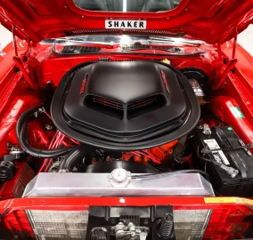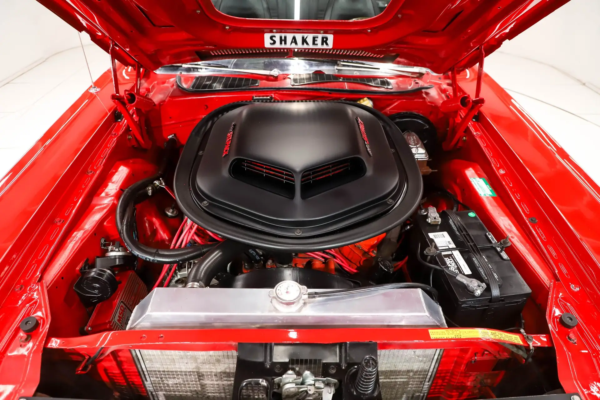 ENGINE COMPARTMENT: Pop open the shaker hood and unveil the impressive 440 Six Pack engine. The functional shaker scoop is an original, not a reproduction, the satin black scoop forces air directly into the 3 two barrel carbs for extra power. They are sitting on top of an aluminum intake manifold. Equipped with power steering, power brakes, and Hi-flow cast iron exhaust manifolds that flank the sides. It has been upgraded with an MSD ignition and Champion aluminum radiator. The battery is properly secured and the horns are hooked up. The underside of the hood is painted slick just like the body. The fender wells and firewall are also neatly painted red. Even the latch mechanism has been replaced. The 440 is a desirable period correct engine.