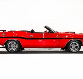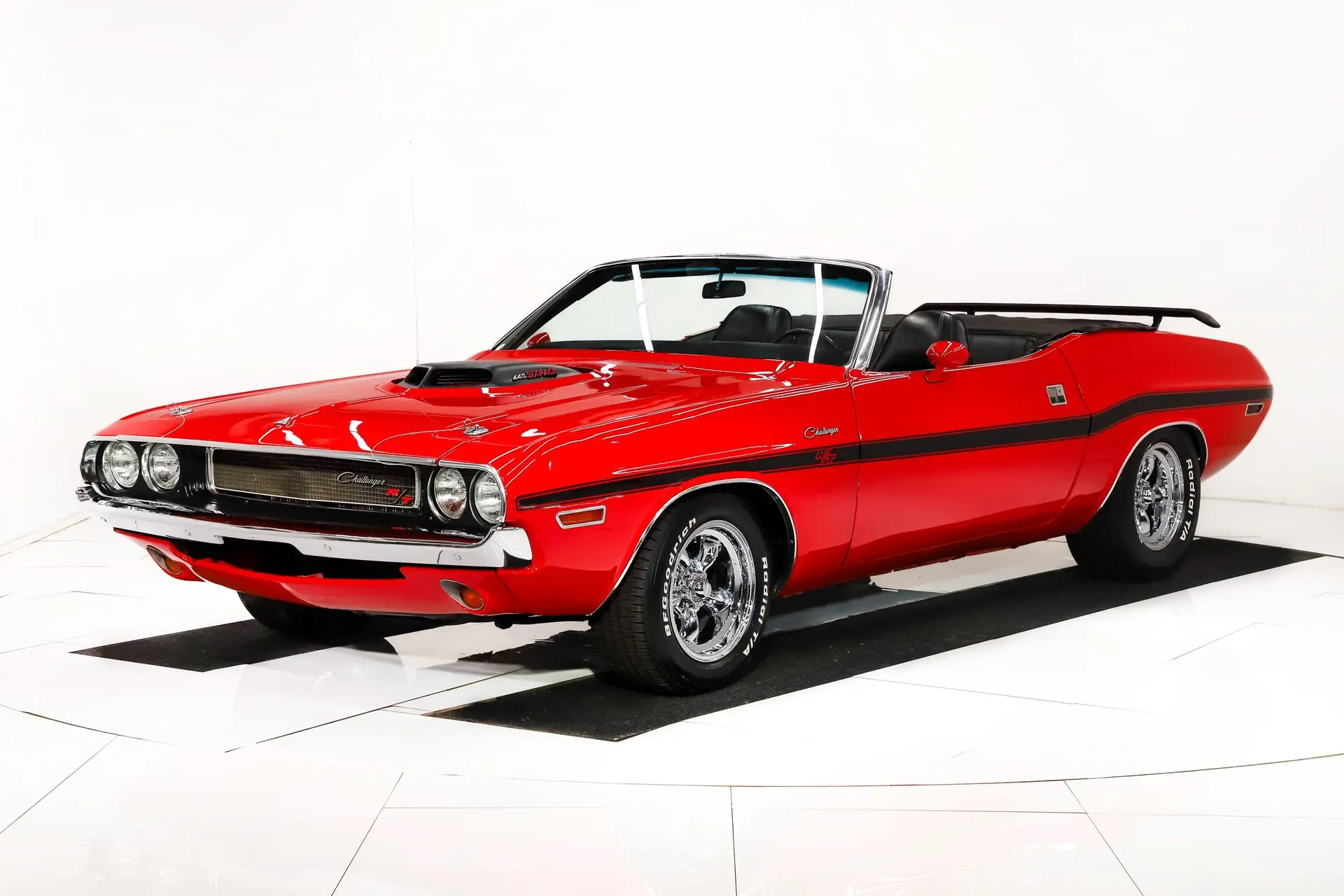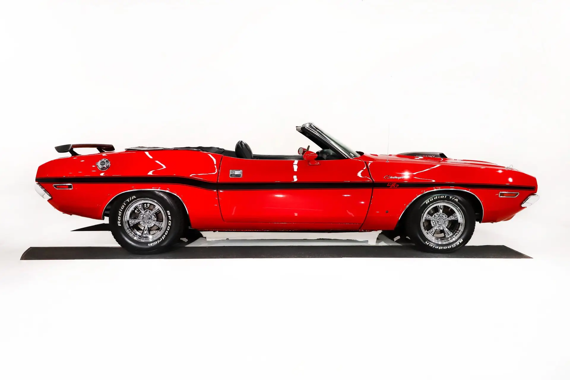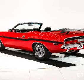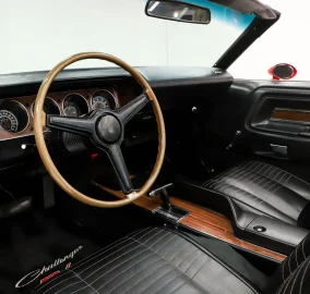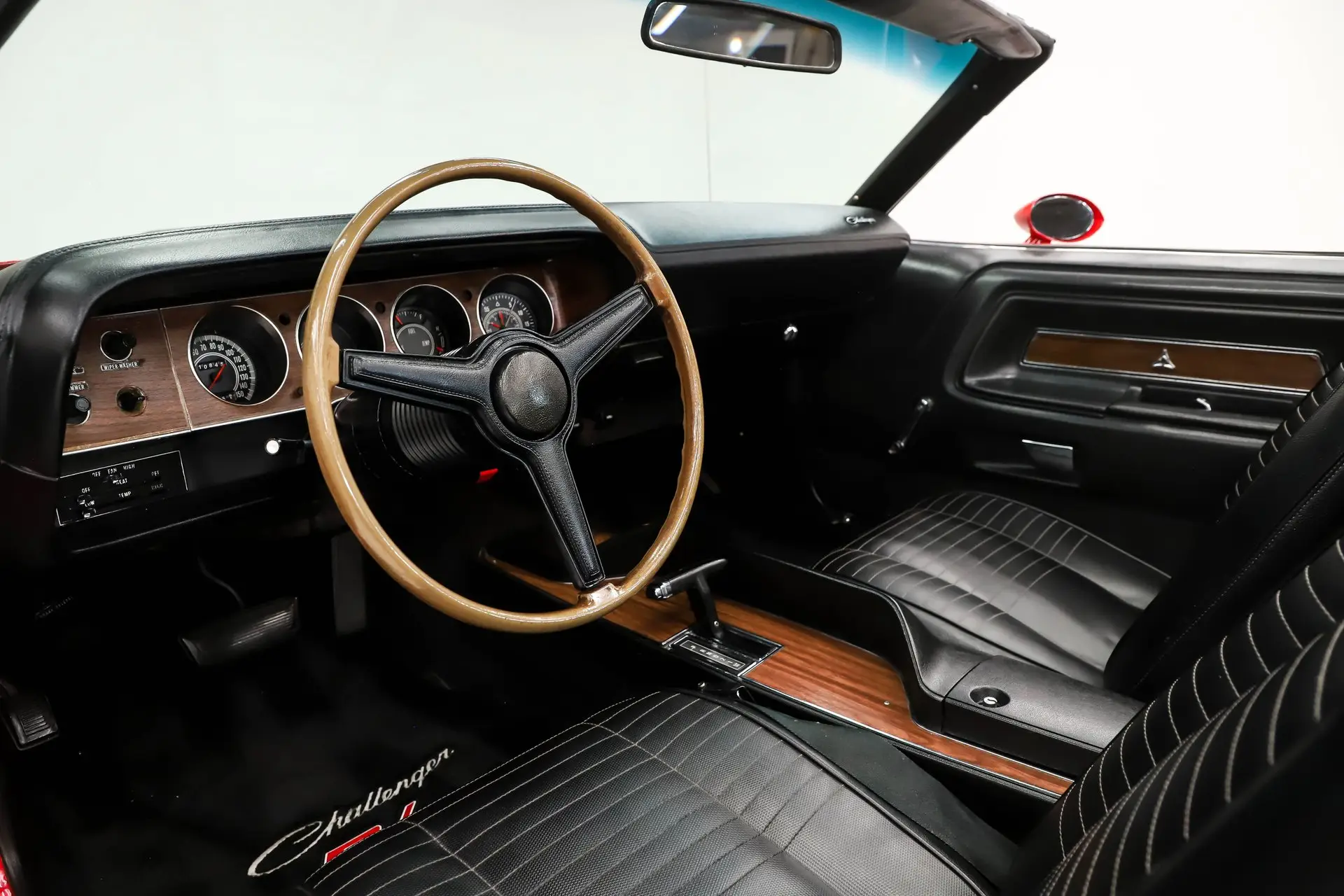 EXTERIOR: Make a statement! The Bright Red paint was recently applied with great attention to detail with a nice shiny and reflective finish. The black R/T side stripe is the perfect compliment to the interior. All the panels have been nicely aligned with good gaps that are above average. The long heavy doors close easily with minimal effort. Looking down the side of the body is satisfying with its voluptuous contours and crisp lines. The bumpers have both been rechromed and the remaining brightwork all has a lustrous shine. The front grille with Challenger R/T badging is in excellent condition. The taillight panel is a good original. The hood pins and splitter exhaust tips just look tough. Under the black convertible boot is a fresh looking black vinyl top. The shaker hood and Go Wing rear spoiler really enhance the profile. Its rolling on 15ā chrome American Racing rims wrapped in BFGoodrich Radial T/A tires. This one has the look and stance!