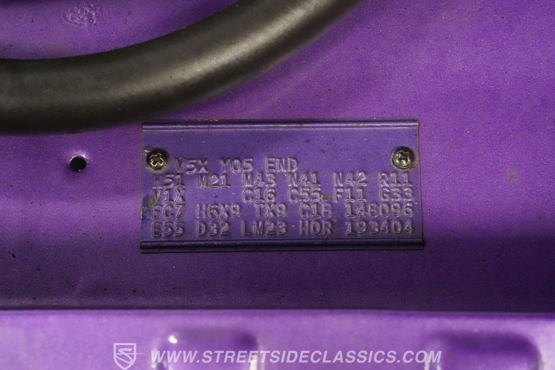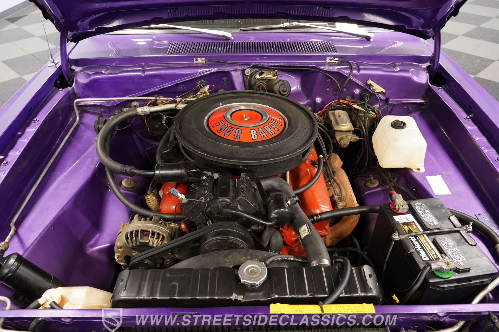 Beneath the hood lies the heart of this muscle machine: a numbers-matching 340 V8 that's paired to a heavy-duty Torqueflite 3-speed automatic transmission. This drivetrain delivers a smooth yet aggressive performance, with a distinctive rumble that turns heads. Power steering and factory disc front brakes ensure every twist and turn feels confident, while the dual chrome exhaust tips bark a signature growl that's impossible to ignore on the open road.