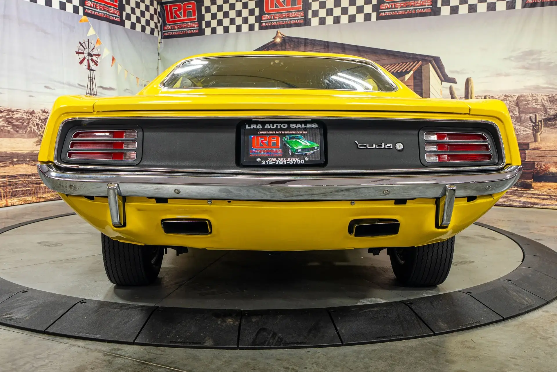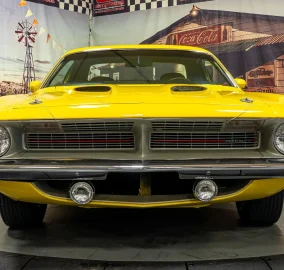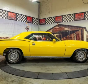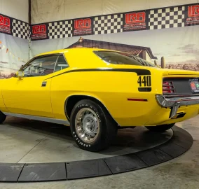 This 1970 Plymouth 'Cuda hardtop features a factory V-code 440/390 HP V-8 engine, equipped with three two-barrel carburetors, paired with an A727 3-speed automatic transmission. It comes with the A32 Super Performance Axle package, which includes a 4.10 ratio Dana 9 3/4 rear end with Sure Grip. A set of Edelbrock aluminum cylinder heads has been installed. The exterior is finished in Lemon Twist (Y1) and showcases black āhockey-stickā side stripes and 440 script. Equipment includes chrome bumpers, dual hood scoops, and 'Cuda 440-6 hood badges. Steel 15ā³ Rallye wheels are fitted with Goodyear Polyglas GT E60-15 tires and equipped with power front disc brakes, power steering, dual exhaust with bright tips, wheel arch and drip rail moldings, fish gill rocker moldings, hood hold-down pins, and road lamps.