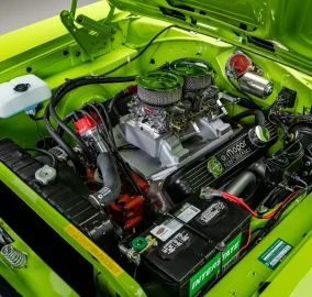 Visually, this car makes an immediate statement in Code J5 Limelight Poly, one of the most famous high-impact hues from Chrysler's palette. It was applied using premium PPG products, and the finish highlights the crisp bodywork and clean restoration throughout. Black performance hood stripes with a blackout treatment frame functional hood pins, while Road Runner graphics on the quarters and trunk lid recall the factory look. Dust-trail decals sweep down each side, a playful yet period-correct touch that underscores the car's identity. Underneath, the body was finished in original-style dip primer with undercoated wheel wells for protection, while a powder-coated and clear-coated fuel tank gleams between dual chrome exhaust tips. Bright trim, a fresh grille, and 15-inch Rallye wheels wrapped in BF Goodrich Radial T/As complete the exterior, giving this B-body the stance and character enthusiasts expect from a properly restored 1970 Road Runner.
