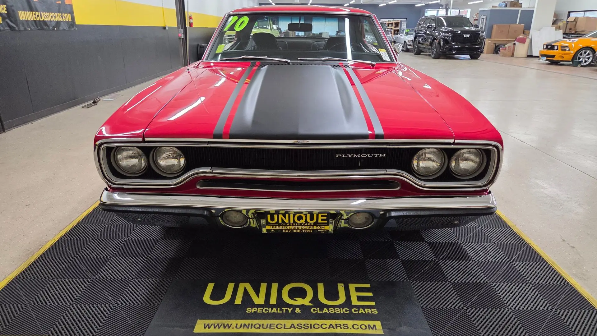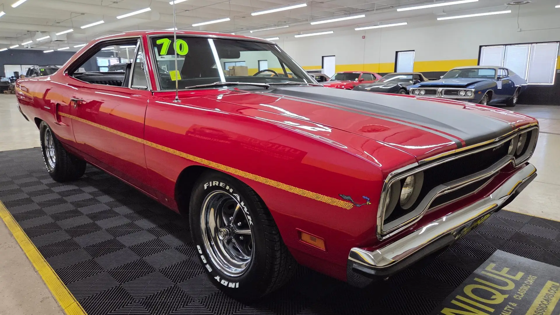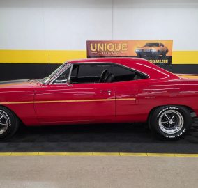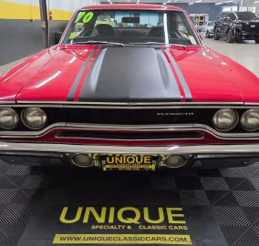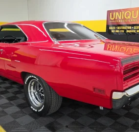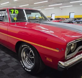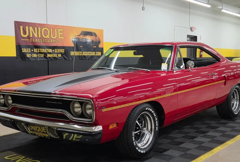 1970 Plymouth Road Runner in Red paint with flat black stripe. 440ci V8 under the hood with an automatic transmission. Chrome and brightwork in great shape and shows well overall on this example. Equipped with power steering. There are some imperfections in the paint in small areas. Black vinyl bucket seat interior as well. Riding on Magnum 500-style wheels with Firehawk Indy 500 tires. Aftermarket stereo installed in the dash. This two door hardtop comes with true dual exhaust front to rear. Our techs noted the temp, tachometer, fuel, and oil pressure gauges are all not working. New turn signal switch, front and rear brake shoes, and a radiator. Aftermarket stereo does work.