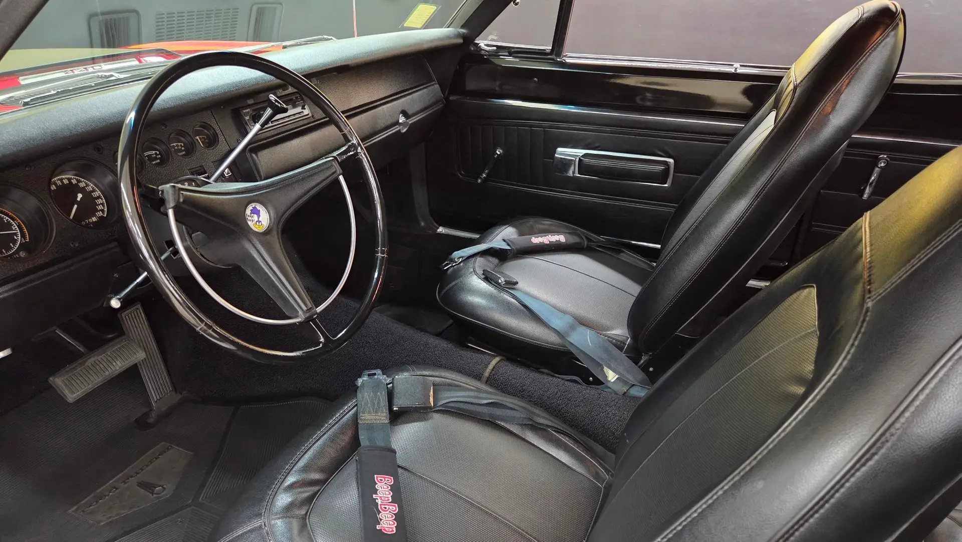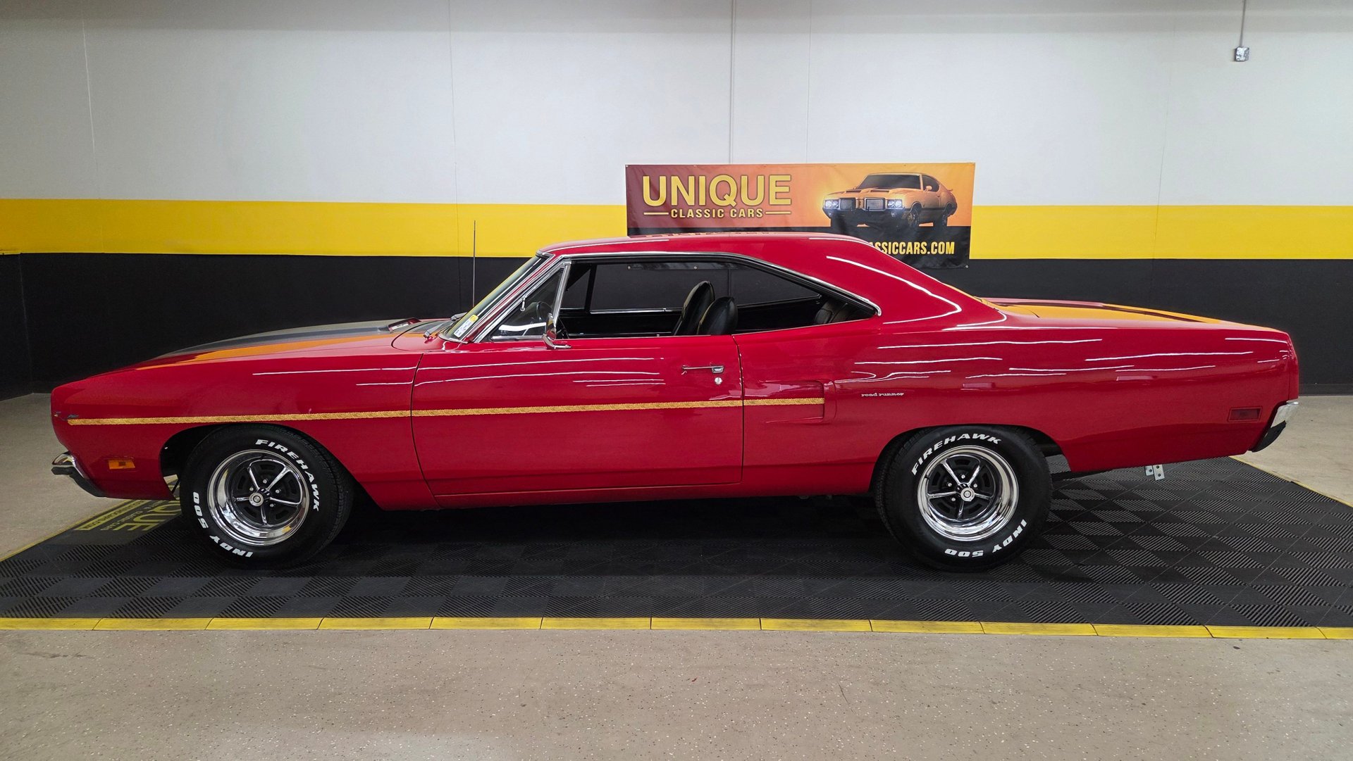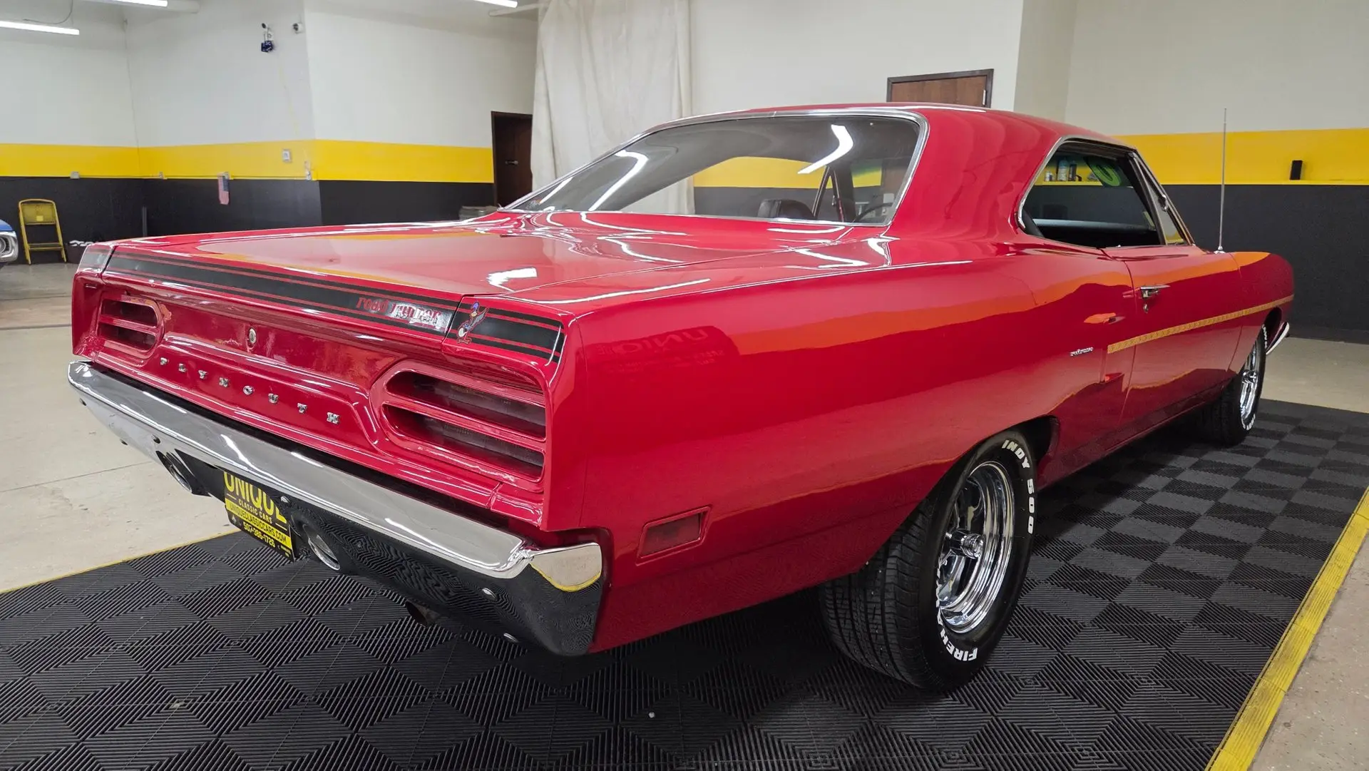 1970 Plymouth Road Runner in Red paint with flat black stripe. 440ci V8 under the hood with an automatic transmission. Chrome and brightwork in great shape and shows well overall on this example. Equipped with power steering. There are some imperfections in the paint in small areas. Black vinyl bucket seat interior as well. Riding on Magnum 500-style wheels with Firehawk Indy 500 tires. Aftermarket stereo installed in the dash. This two door hardtop comes with true dual exhaust front to rear. Our techs noted the temp, tachometer, fuel, and oil pressure gauges are all not working. New turn signal switch, front and rear brake shoes, and a radiator. Aftermarket stereo does work.