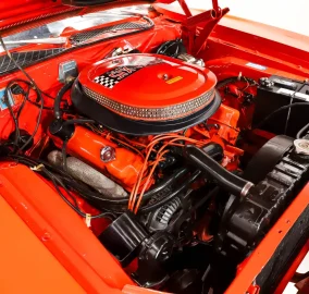 UNDERSIDE: Underneath presents nicely, it's been maintained and serviced as needed. We inspected the car, the steering and suspension appears to be working properly. We did rebuild the steering rag joint. It has disc brakes in front, we replaced a front brake hose, adjusted the rear brakes and replaced the emergency cables. The factory style exhaust looks fresh and has a cross over pipe along with the āmachine gun tipsā. The fuel tank looks fresh. Looking up at the motor it has a high torque starter. It has the performance A-833 4-speed manual trans and an 8 ¾ rear end with 3.55 Sure Grip gears.