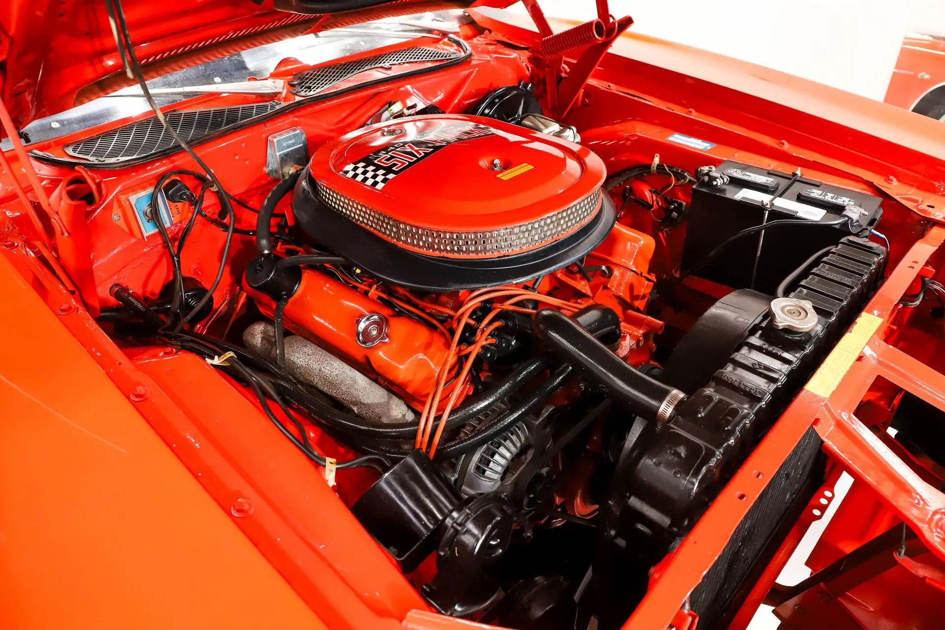 INTERIOR: It's looking real good inside as well. It has a new dash pad, and the instrument panel is excellent. It's a Rallye gauge car with tachometer, the factory radio is still in place. The glovebox pouch with manuals is included. Nice carpet down on the floor with that awesome Pistol Grip 4-speed shifter sticking out of the hump. The seats have been recushioned and upholstered. The side panels, plastic trim, visors, mirror and steering wheel are in excellent shape. The headliner fits very nicely, it has a couple small holes.