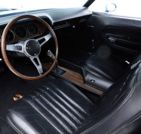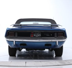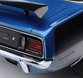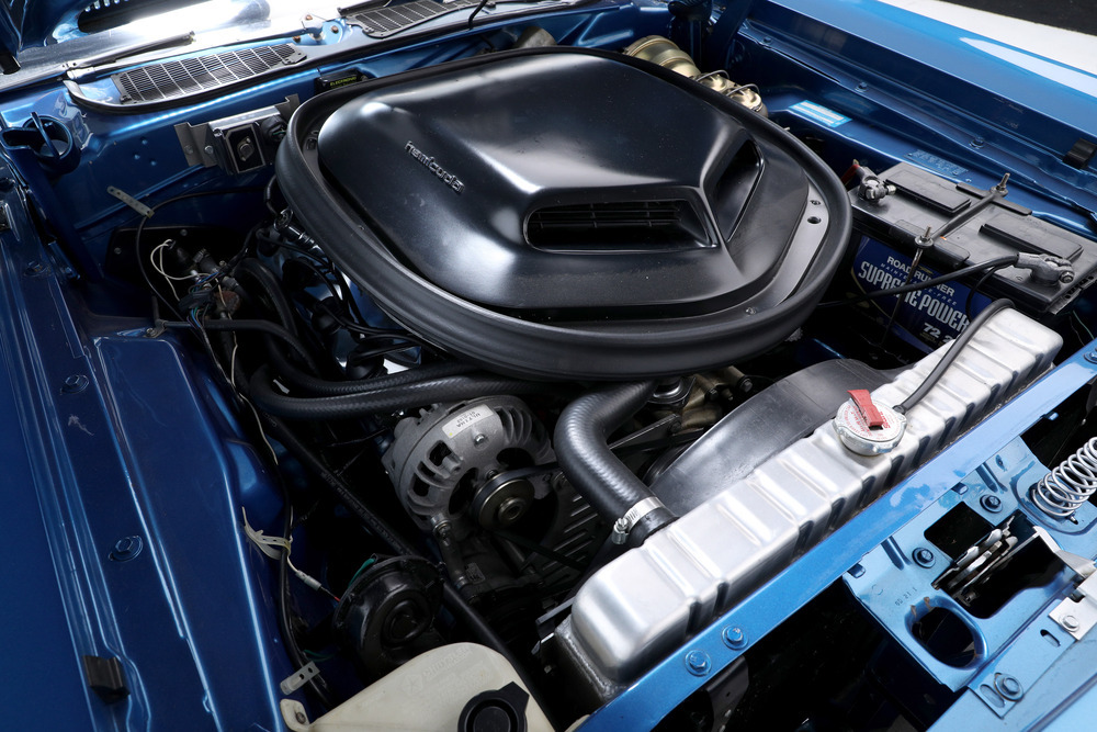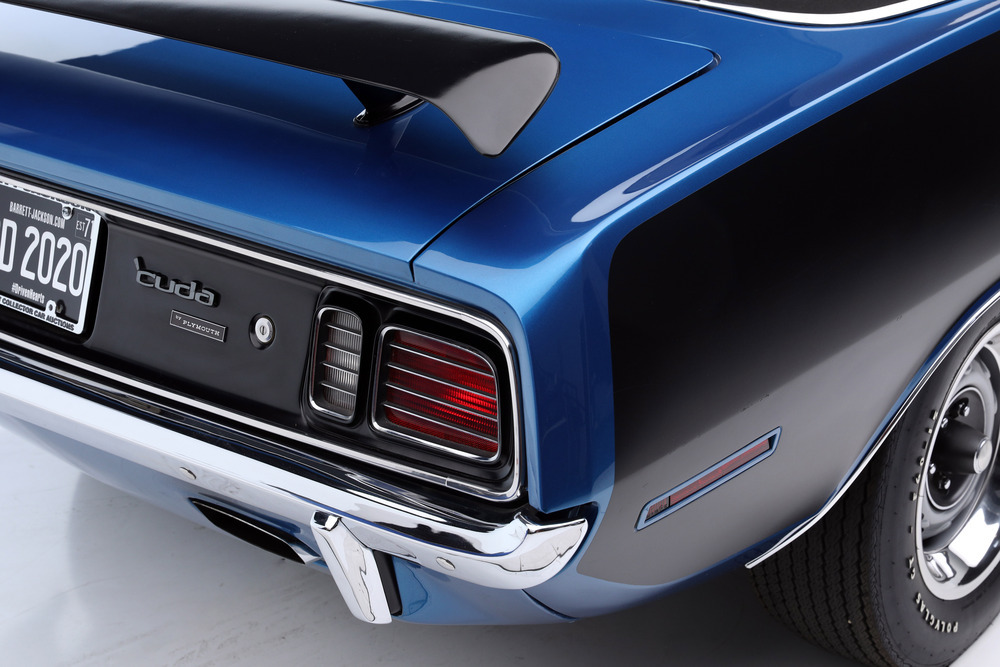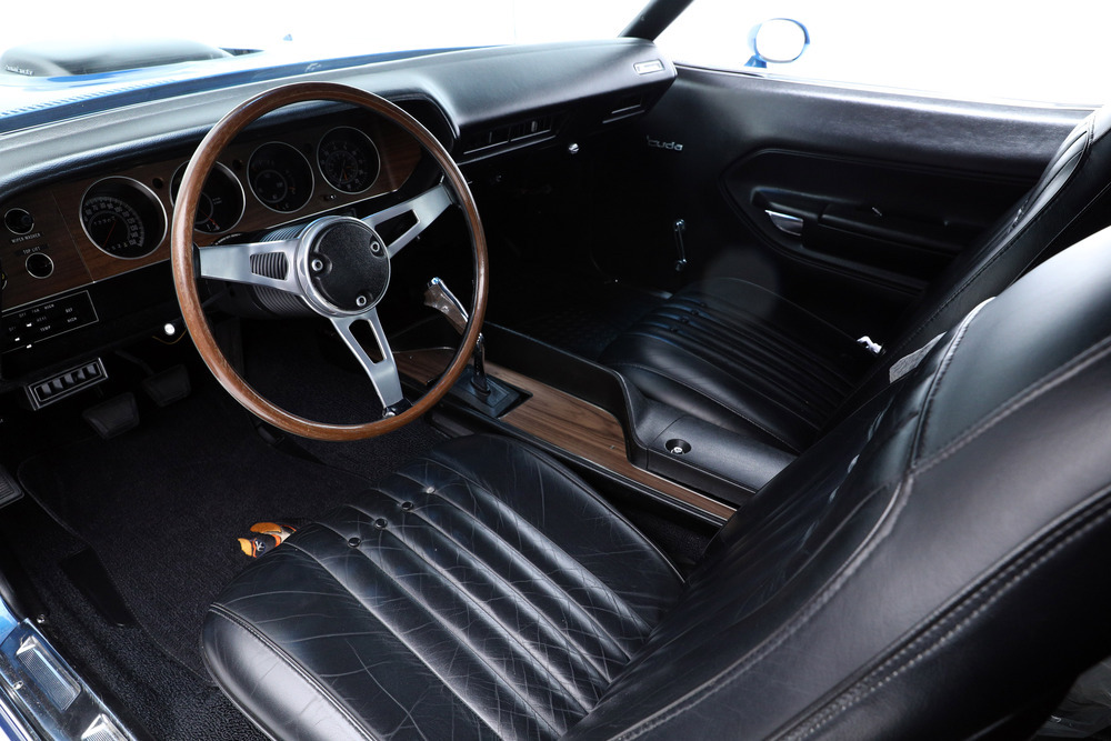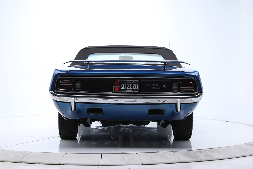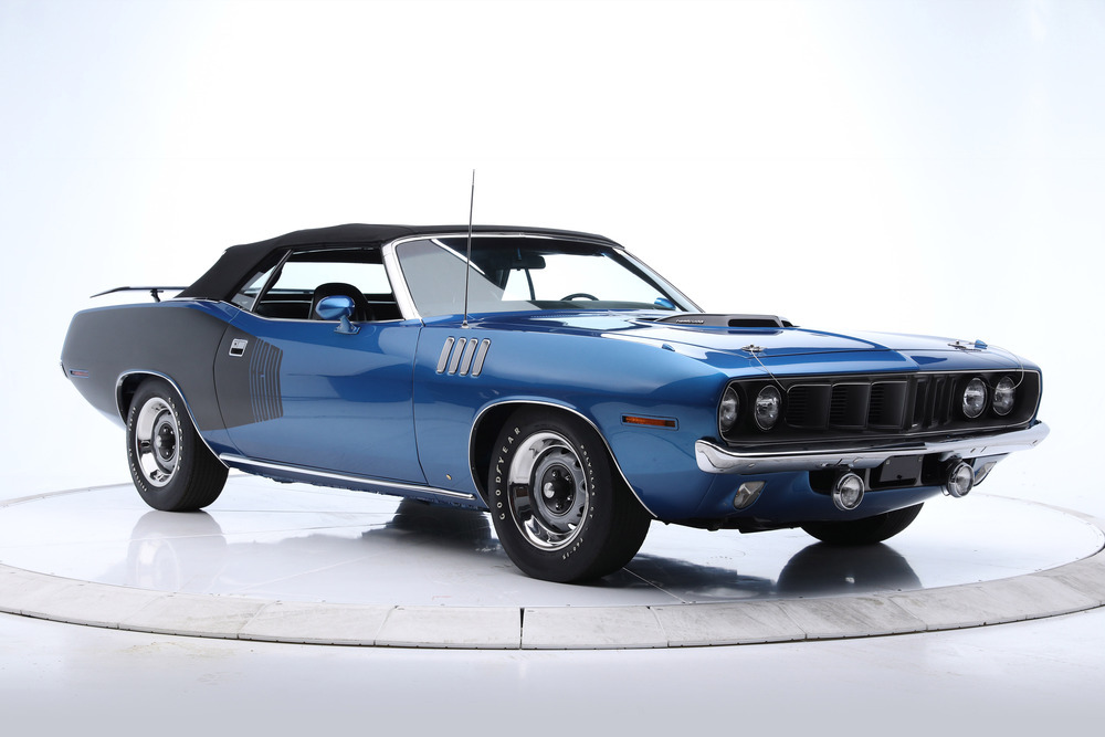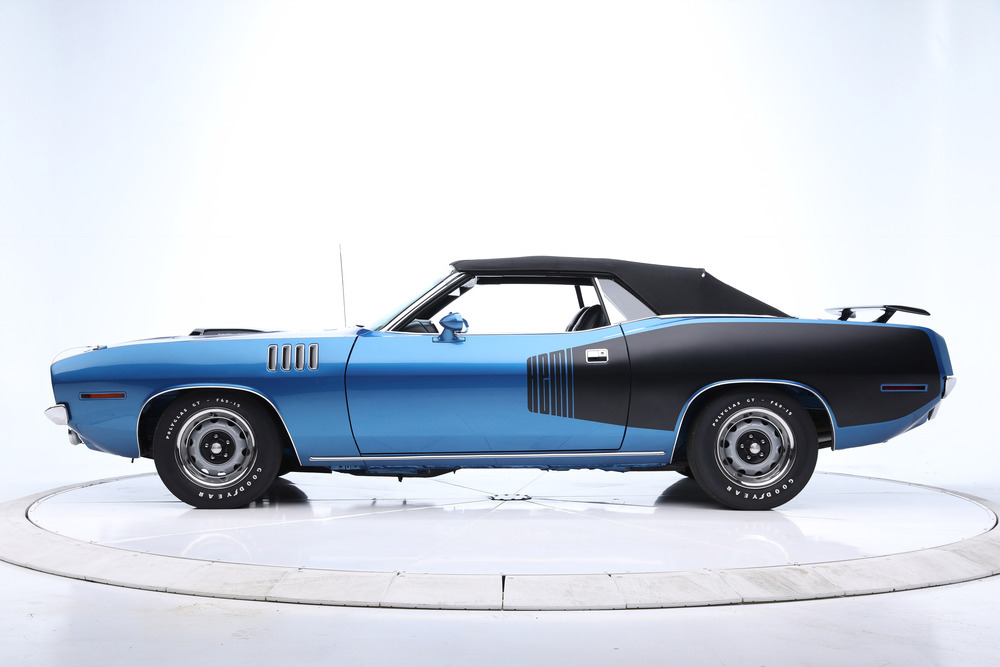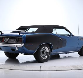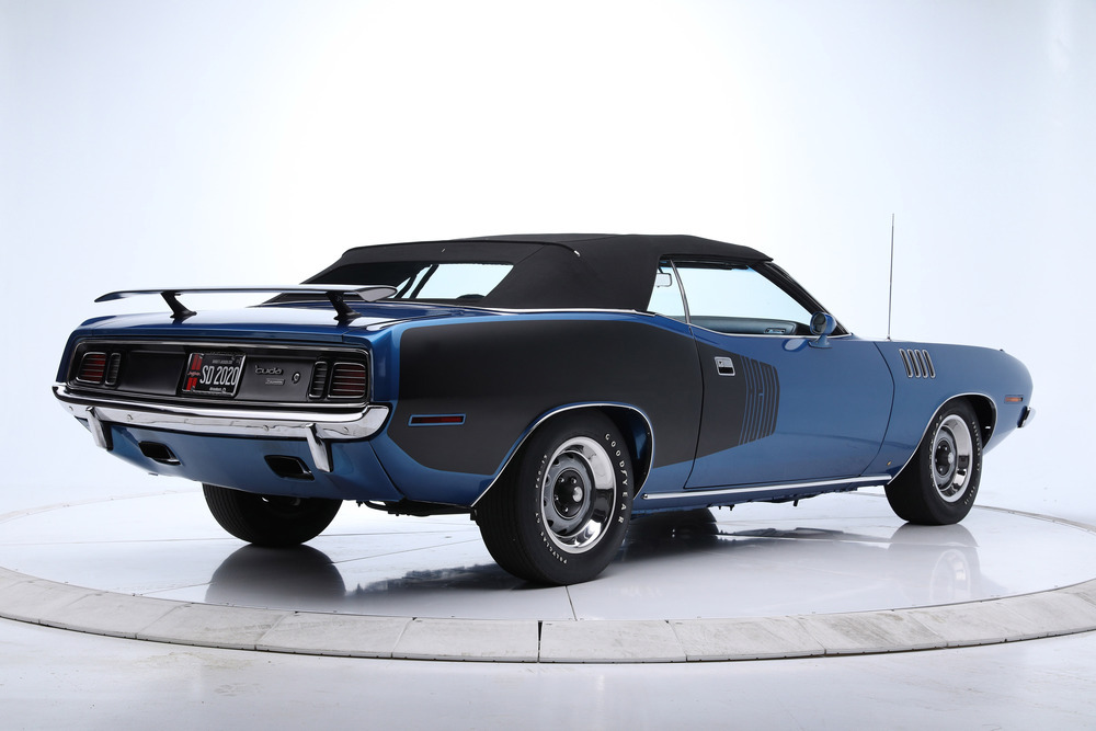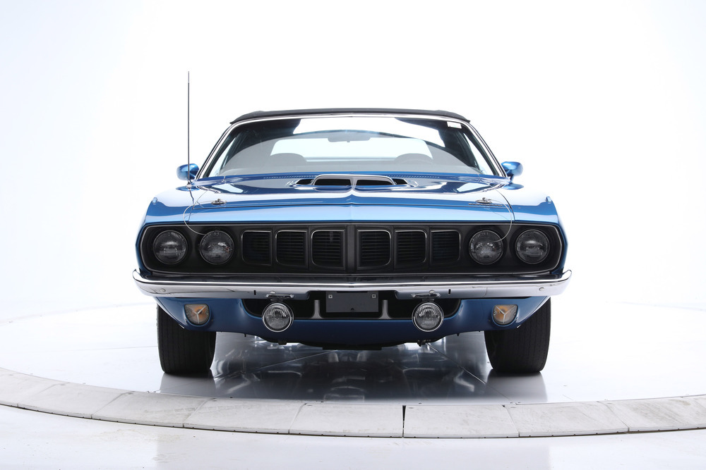 SOLD--This 1971 HEMI 'Cuda Convertible Re-Creation is powered by a 426/425hp dual-quad HEMI engine backed to a 4-speed manual transmission with a Sure-Grip 3.55 rear end. This car had a comprehensive restoration that shows extremely well, with approximately 7,500 miles since completion. Finished in its original factory color of B5 True Blue paint buffed to a show luster, the car is complemented by a black leather bucket-seat interior with center console and pistol-grip shifter along with a black Stayfast cloth top.Features include N96-code Shaker hood, Billboards, Rallye dash with gauges, air conditioning, rim blow steering wheel, power steering, power brakes (front disc), power top, rear wing, hood pins, Rallye wheels with correct-style Goodyear tires and AM/FM/CD stereo. This excellent-running HEMI has gone through a ground-up restoration with a body-color-painted underside, along with a detailed engine and trunk compartment.