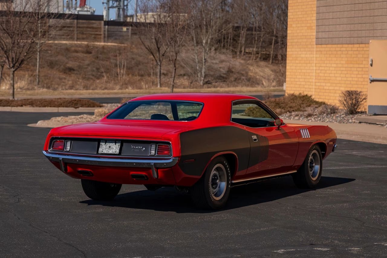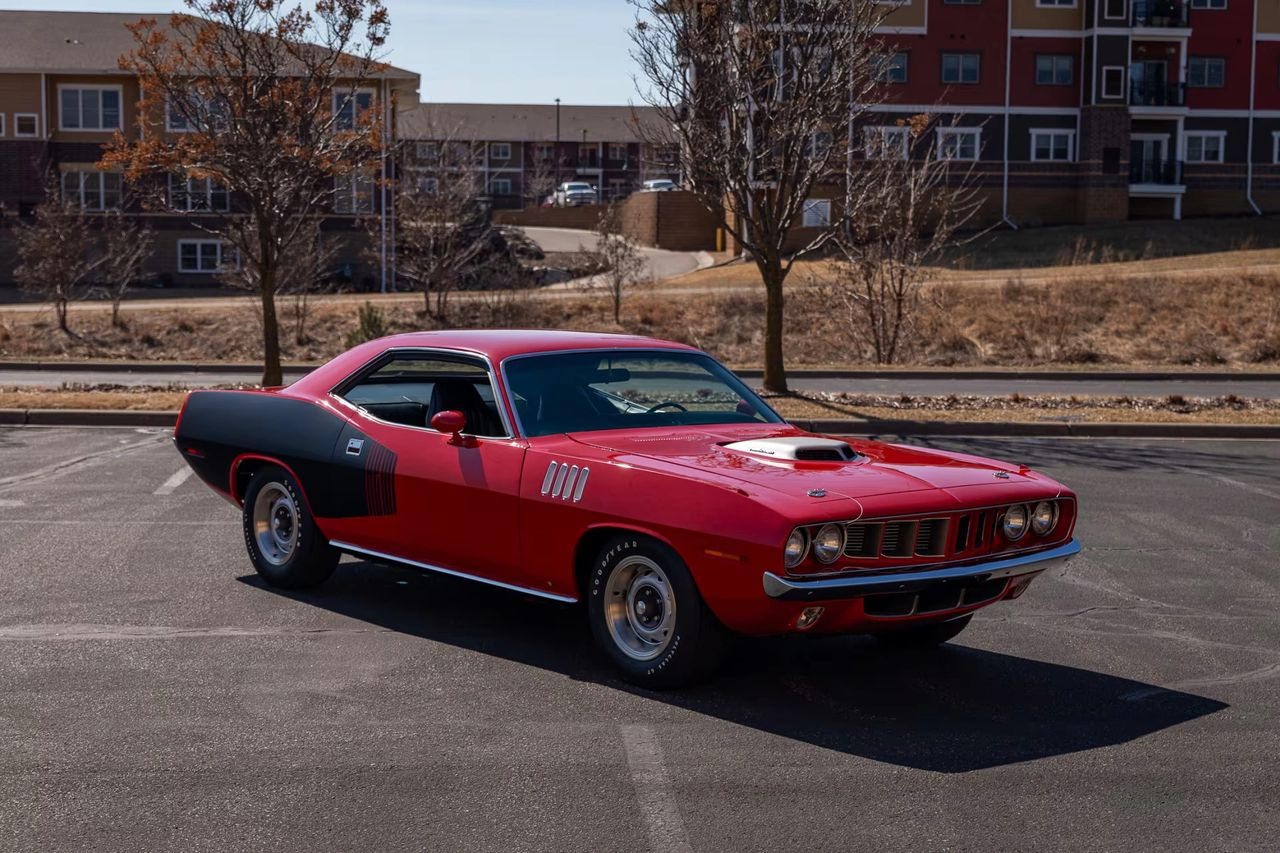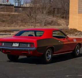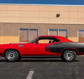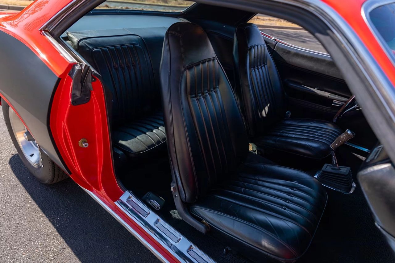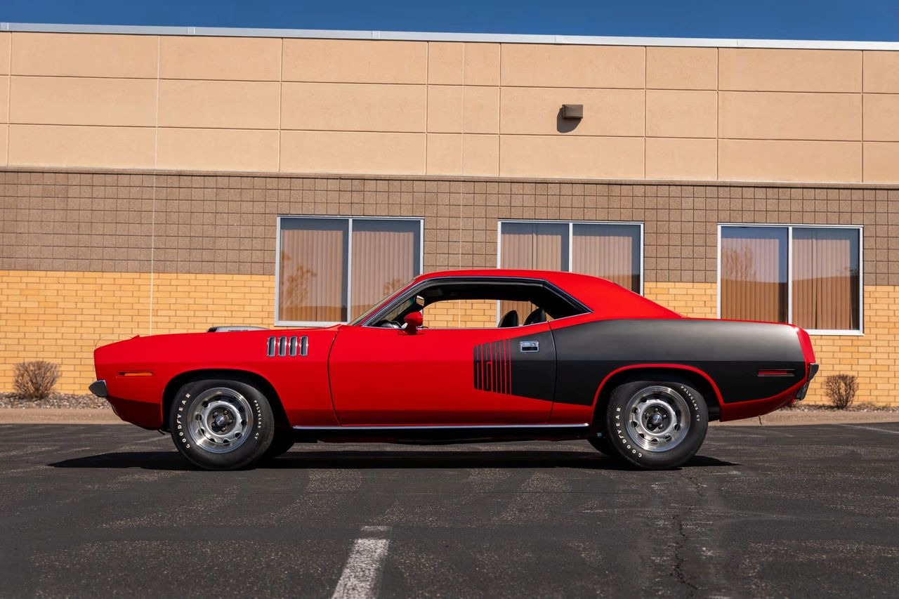 Red exterior with black Hemi billboards over black leather interior
