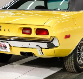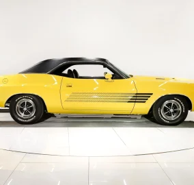 EXTERIOR: This is a sexy looking car! Great lines, eye popping color and stripes. The fit and finish is amazing, it is really straight. The panels fit precisely, I don't see any rust or damage. Factory the power bulge scooped hood and sport mirrors. The Top Banana Yellow paint is polished smooth like glass. Cool looking strobe stripe decals on each side. The vinyl top is replaced. All the glass is new. Up front the grill is restored, bumper, bezels, rubber fillers are mint. The rear bumper is new. The jambs are painted slick, weather strips and seals were replaced.