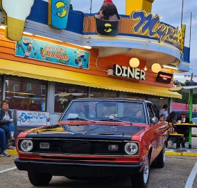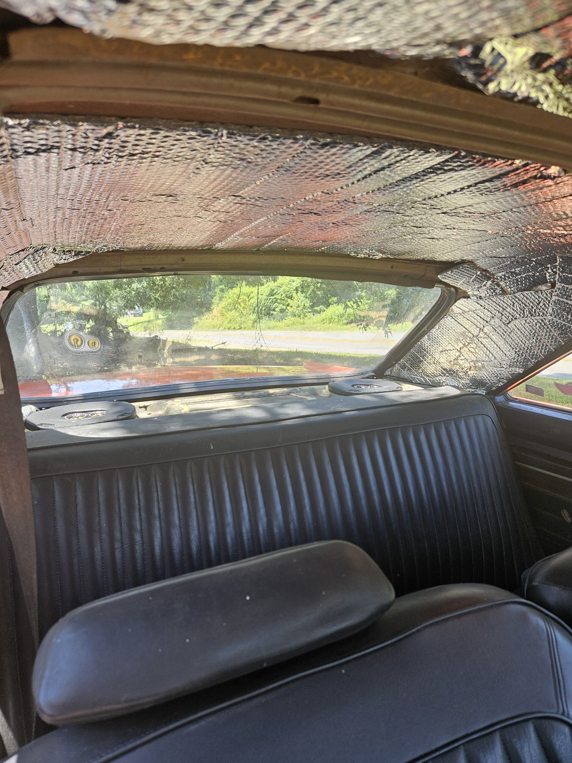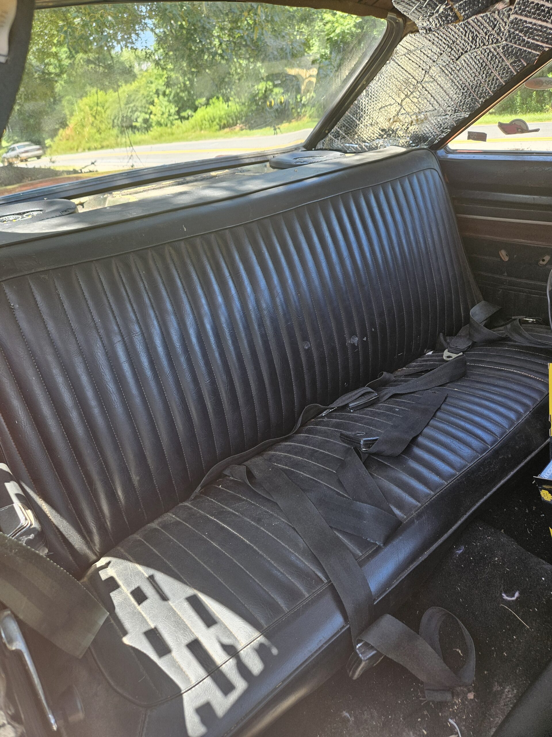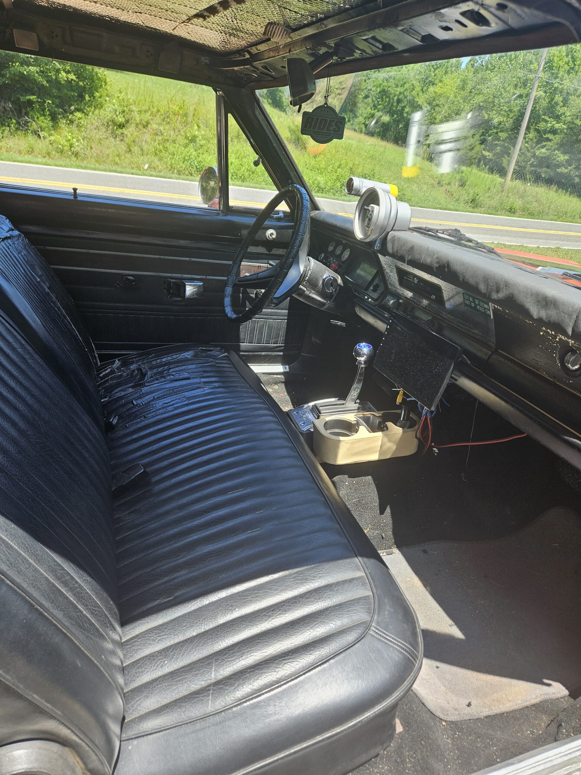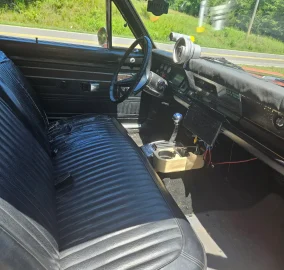 904 transmission with reverse manual valve body and a B&M shifter, 8¾ rear-end, mini tubbed, Aluminum radiator, dual electric fans, Aluminum fuel cell in trunk.