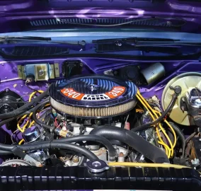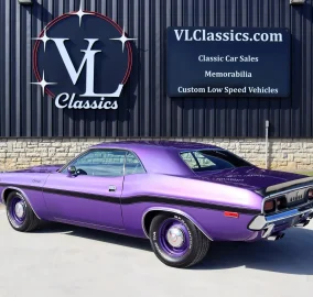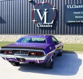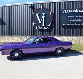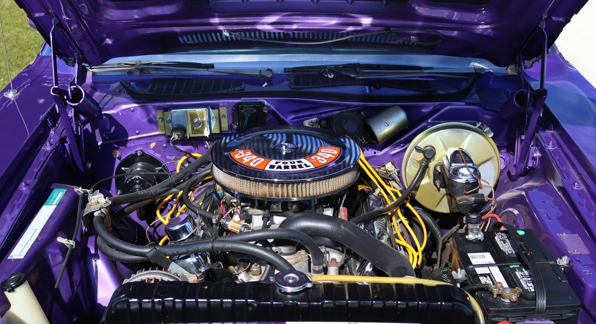 1973 Dodge Challenger. Powered by a 340ci v8. Paired to an automatic transmission. Power steering. Power brakes, Disc on the front, drum on the rear. Bucket seats . console. Front fender blinker indicators. Hood pins. Front and rear spoilers. Painted steel wheels. Aftermarket Sunpro gauges. Clarion stereo.