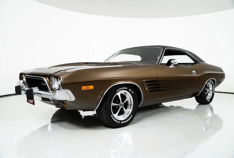 Finished in factory Y9 Dark Gold Poly with a black vinyl top, this 1970s Dodge Challenger stands out with period-correct style. It rides on American Racing Magnum 500-style 15-inch wheels wrapped in staggered radials, giving it a strong stance without straying from its original character.