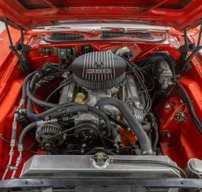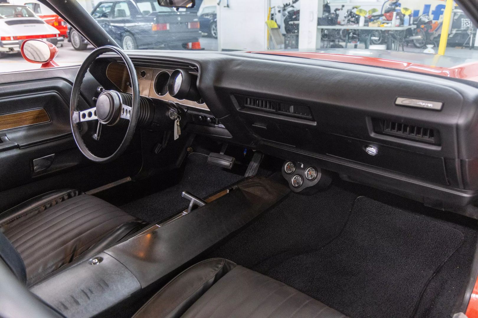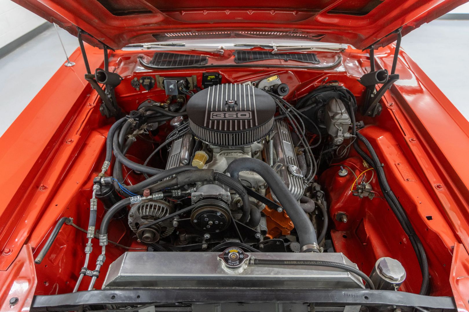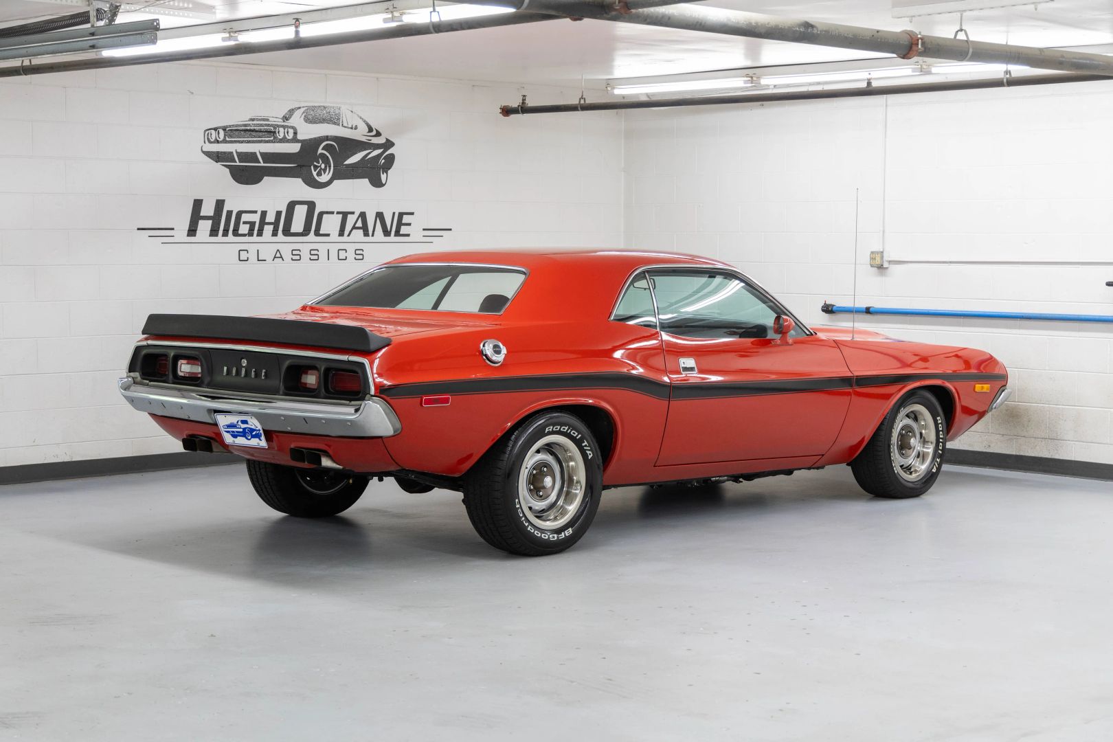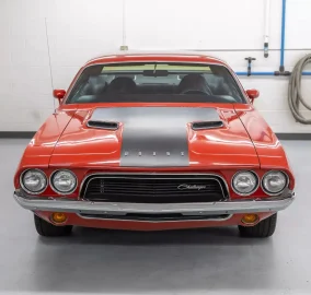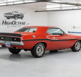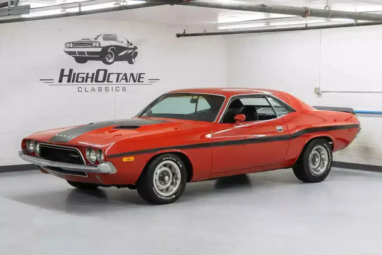 High Octane Classics is proud to present this 1973 Dodge Challenger finished in Bright Red (FE5) with a black vinyl interior. Power comes from a 360ci V8 paired to an automatic transmission. Under the hood this Challenger is well equipped with power steering, power brakes and air conditioning. The 360 has been fortified with tube-steel headers, Edelbrock Intake, and a large aluminum radiator with electric fans. The inside retains a mostly stock appearance with bucket seats, "Slap Stik" shifter, and additional gauges under the dash to monitor engine vitals. On the outside this Challenger rides on a set of 15" Rallye wheels wrapped in BF Goodrich Radial T/A tires.